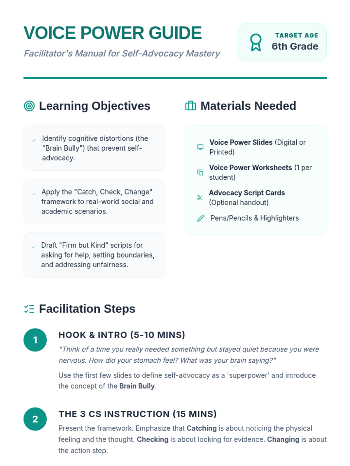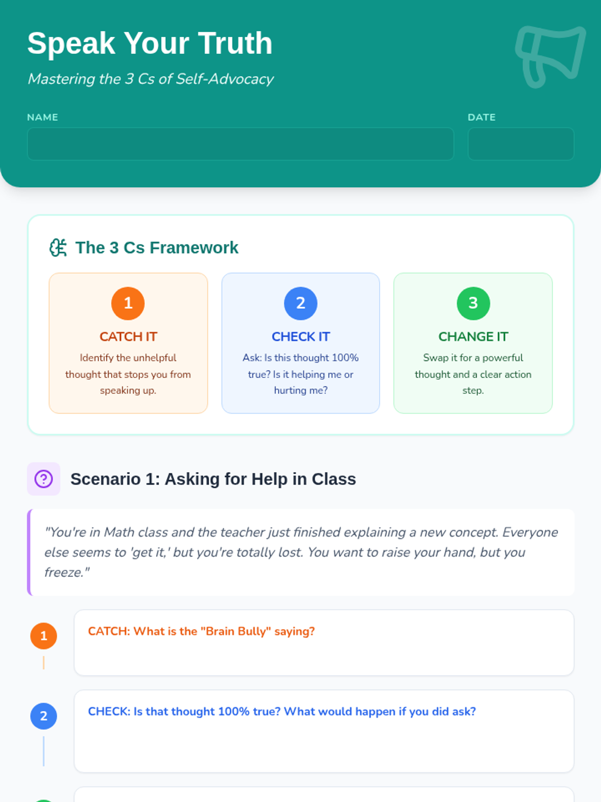 A CBT-based lesson for middle school students to develop self-advocacy skills using the 'Catch, Check, Change' framework across academic and social scenarios.