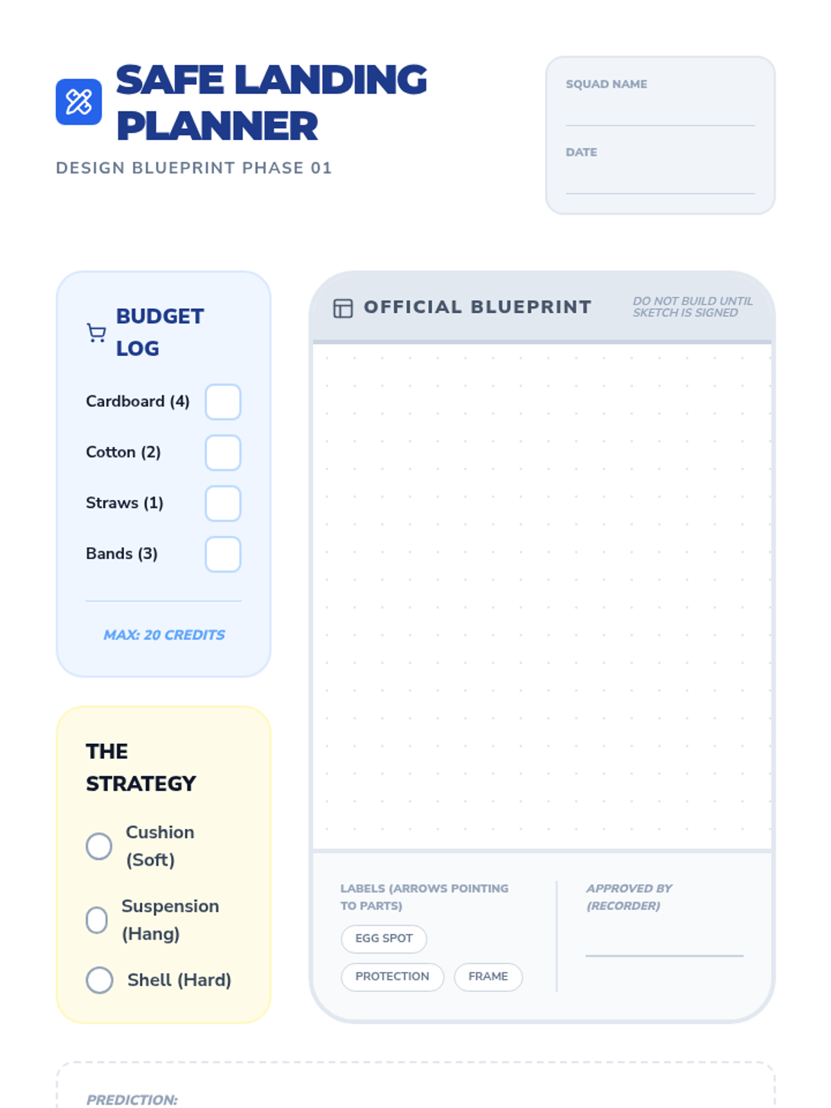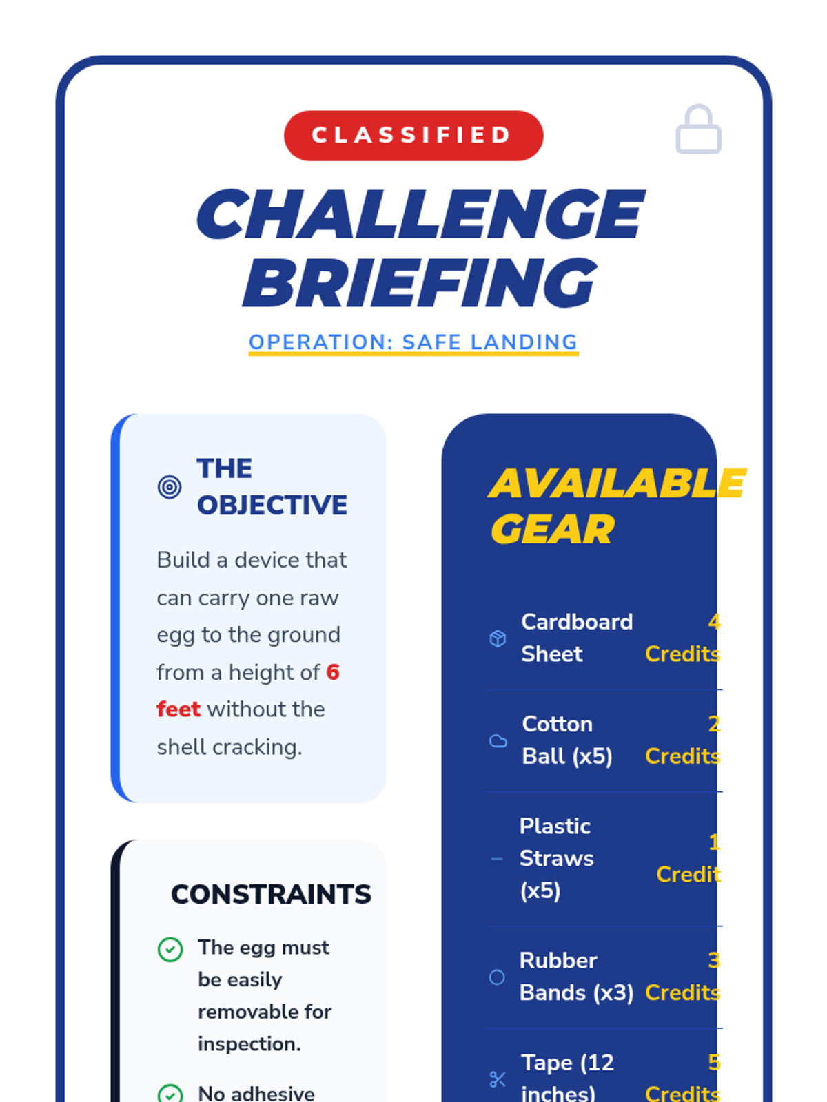 Teams receive their 'Secret Mission' and use engineering blueprints to plan their solution under specific material constraints.