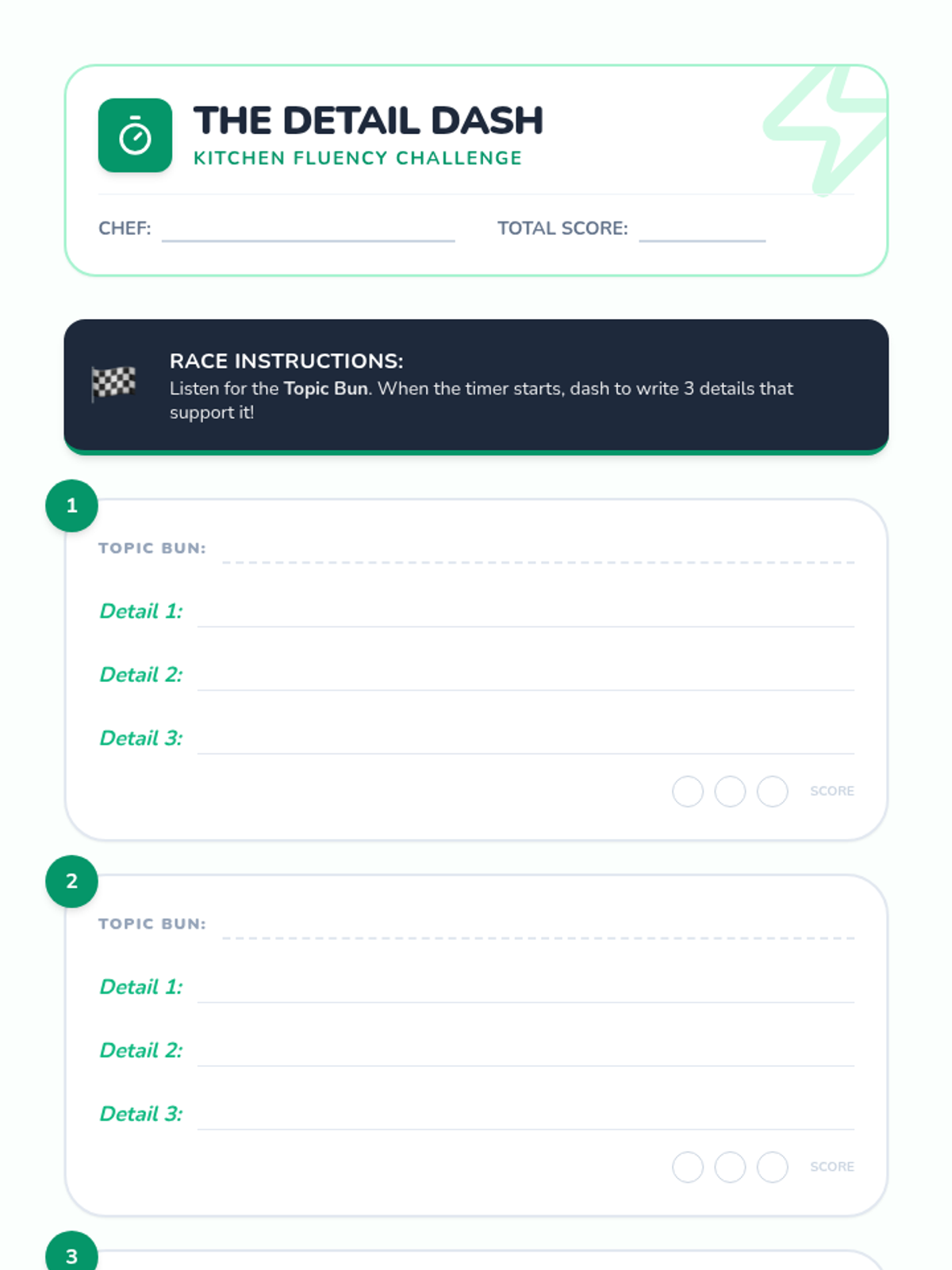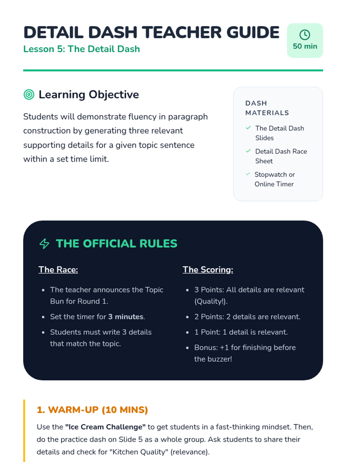 A high-energy fluency activity where students race to generate relevant supporting details for various topic sentences.