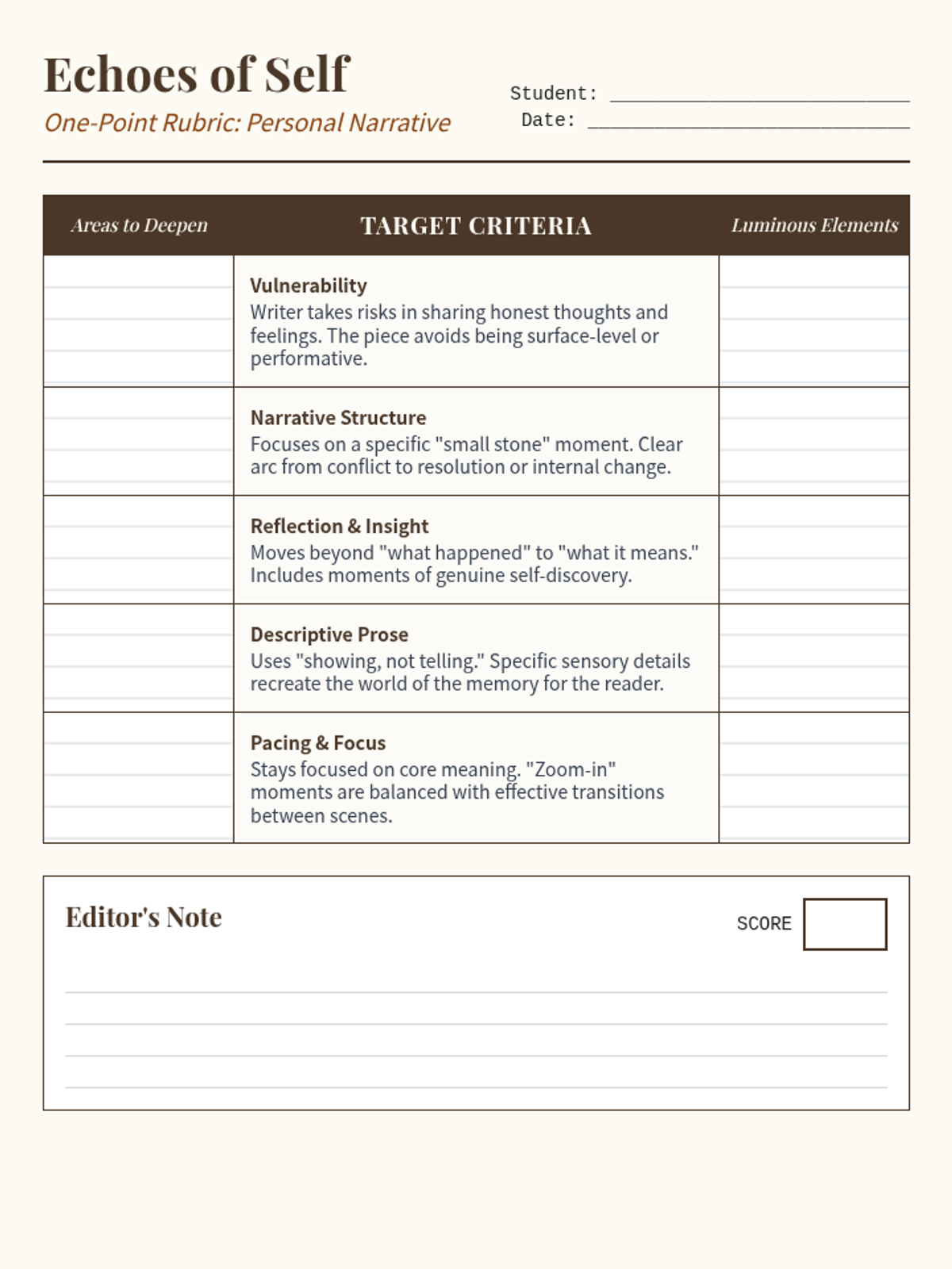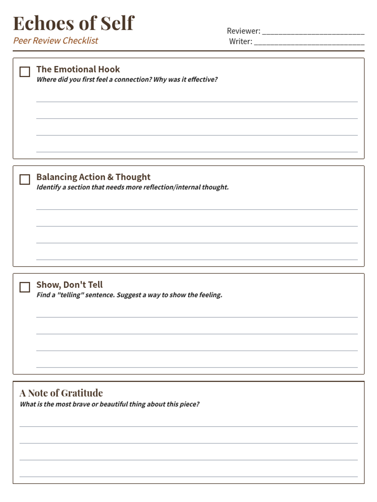 Focuses on the art of memoir and personal essay. Students mine their own lives for meaning, practicing vulnerability and reflective storytelling.