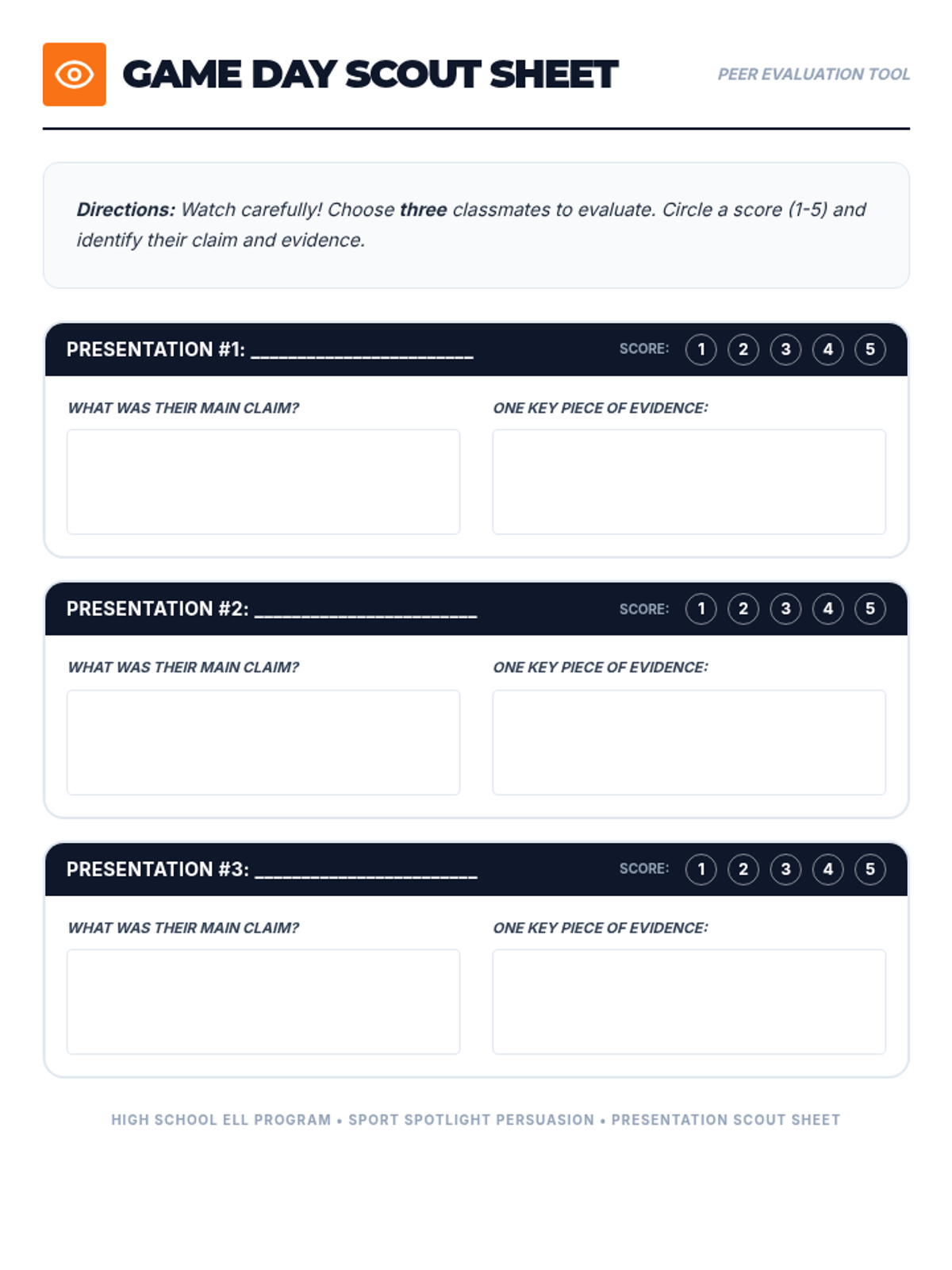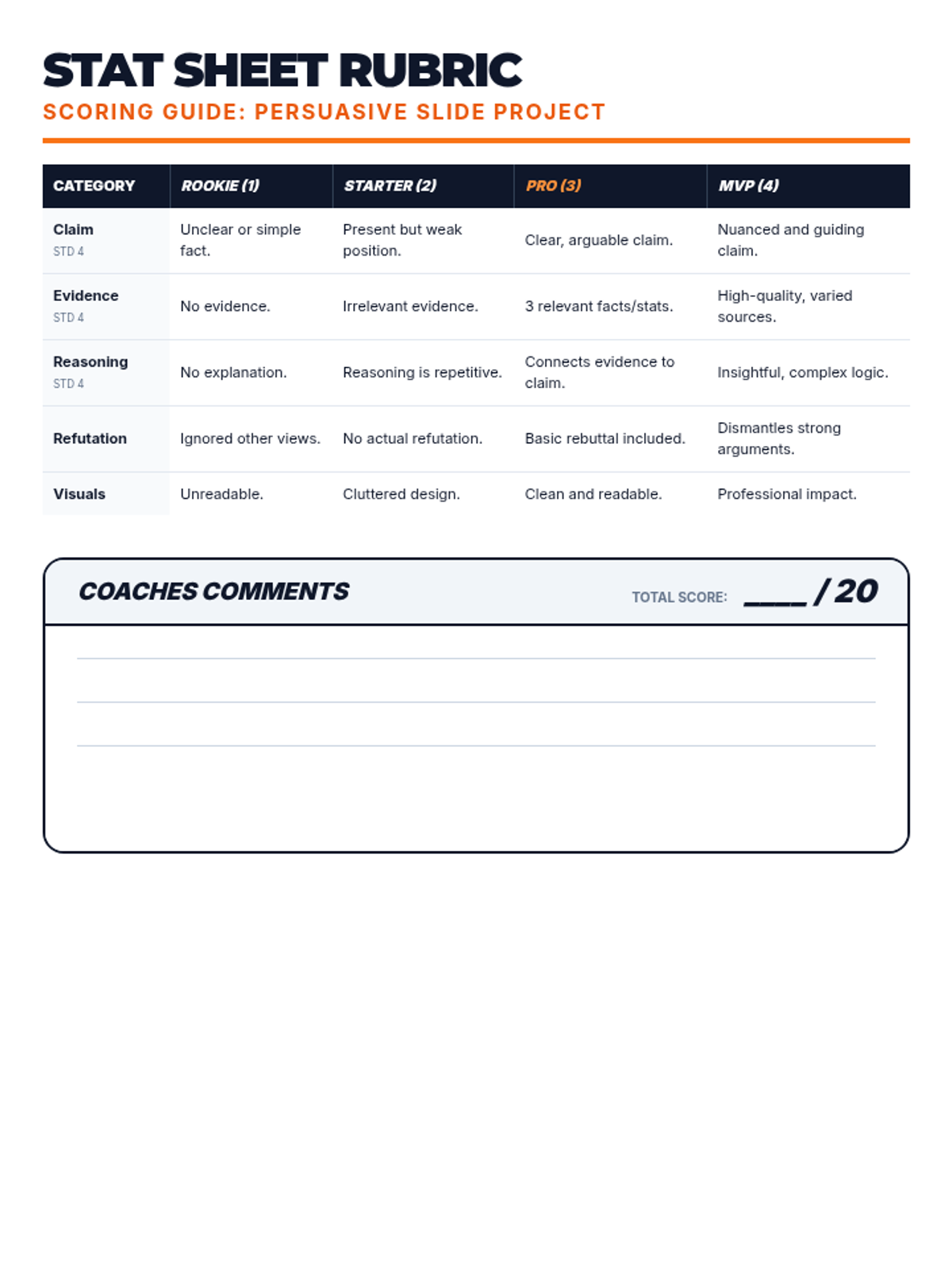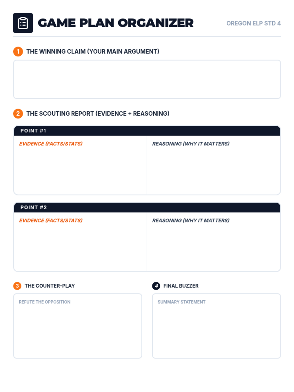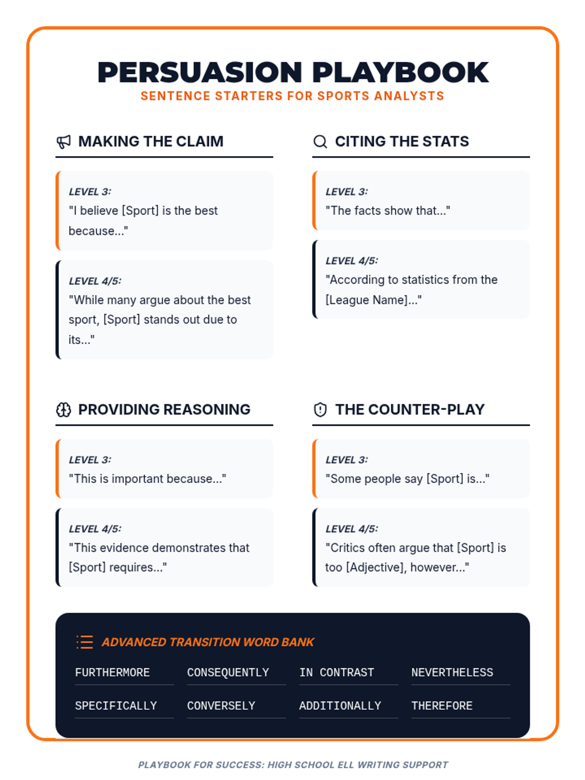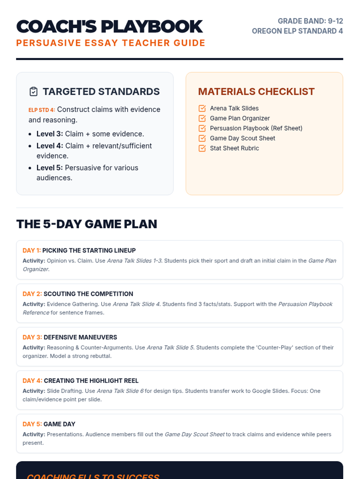 A comprehensive 5-day lesson plan where students learn to construct claims, support them with evidence, and address counter-arguments through a sports-themed lens.