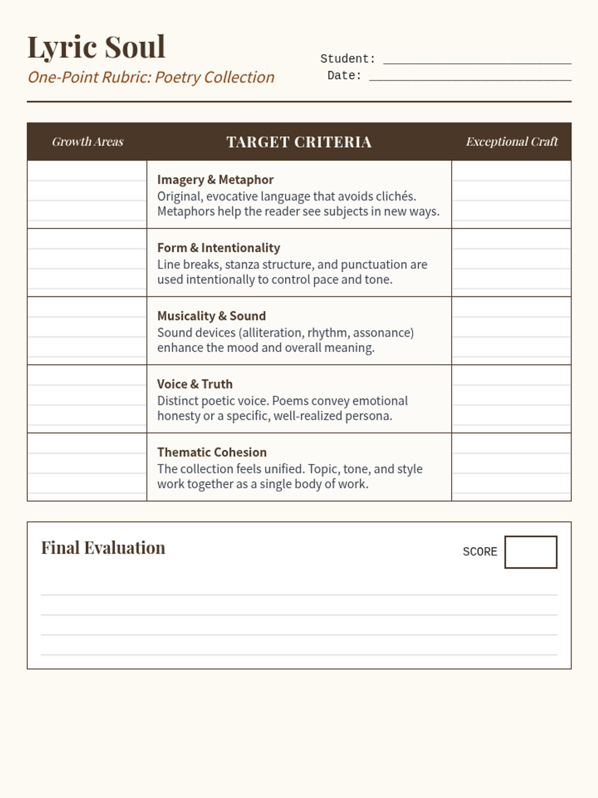 Dives into poetic forms, imagery, and the musicality of language. Students curate a collection of poems that express diverse emotional states and perspectives.