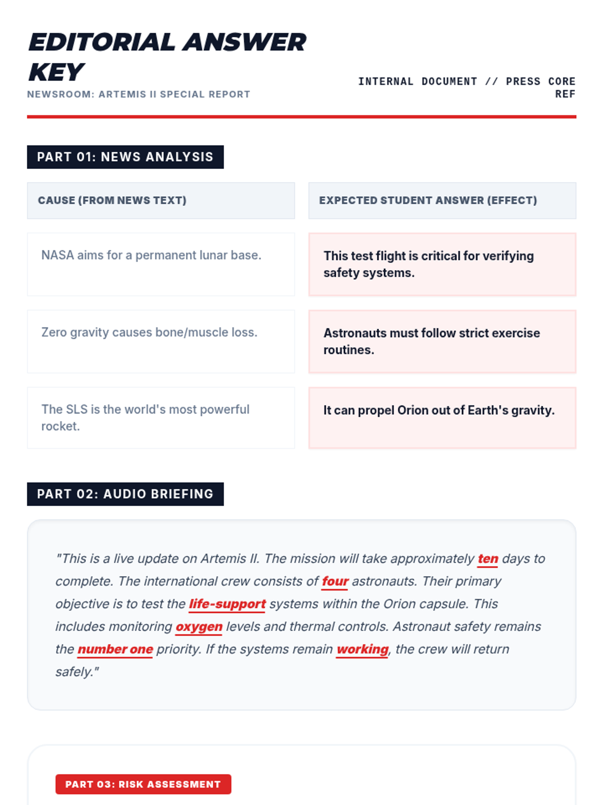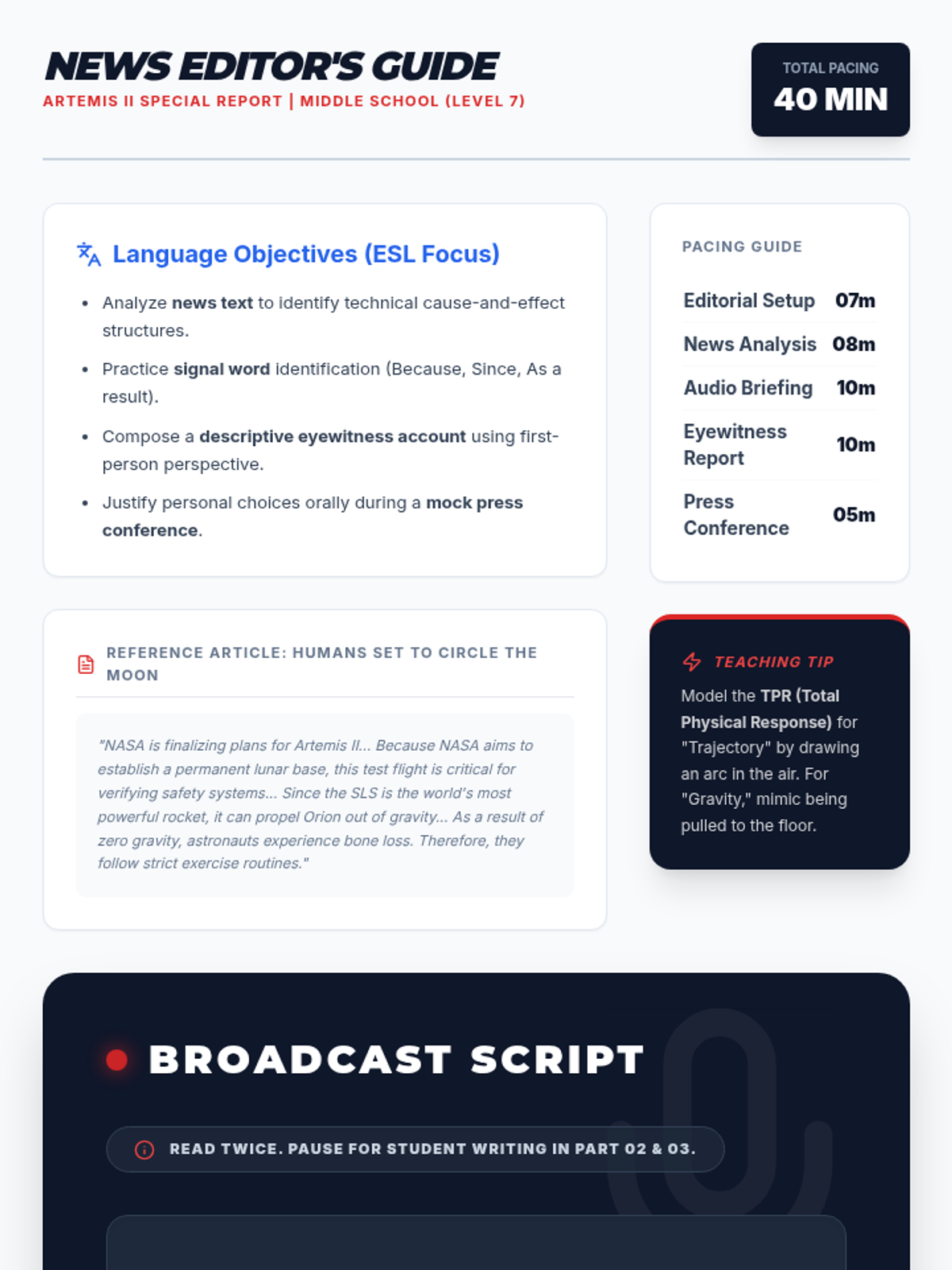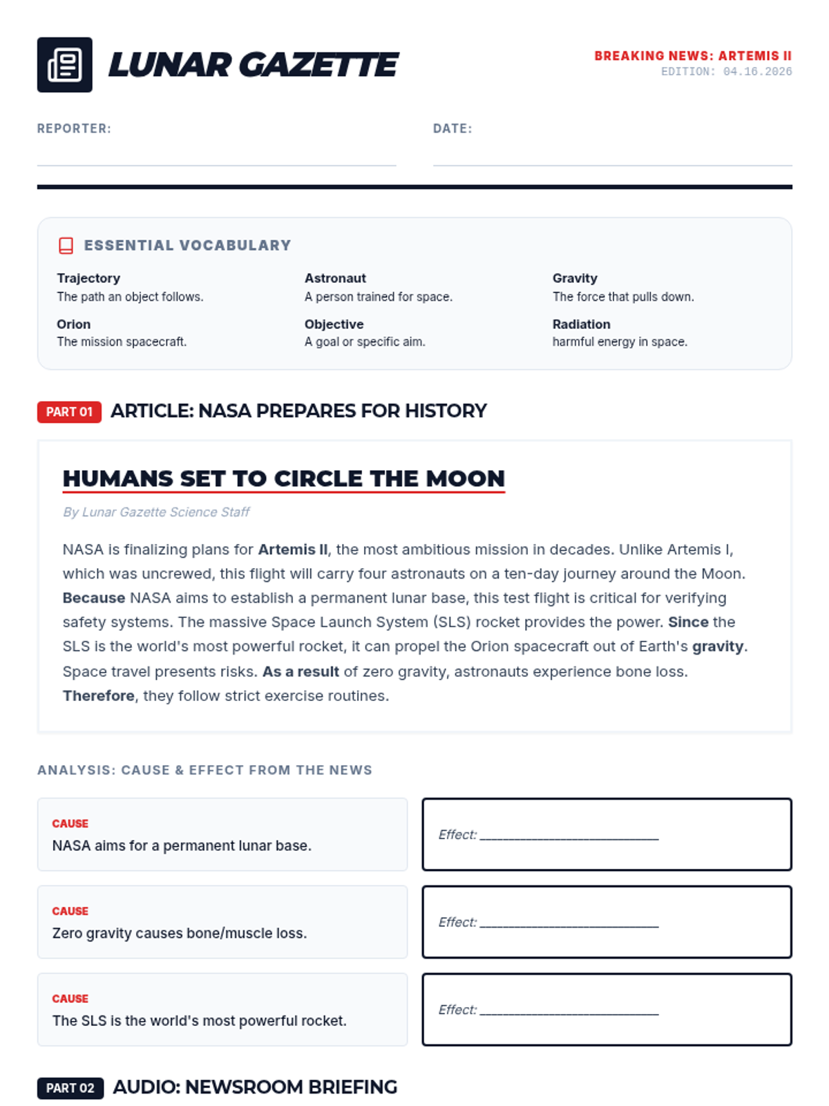 A high-interest lesson for 9th-12th grade ESL students, written at a 7th-grade level, focusing on the Artemis II mission. Includes a news article analysis, cause-and-effect relationships, and descriptive writing.