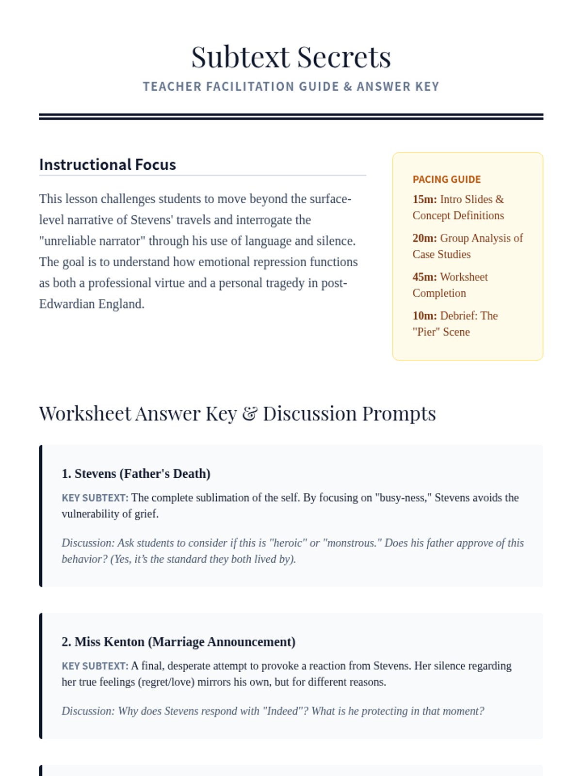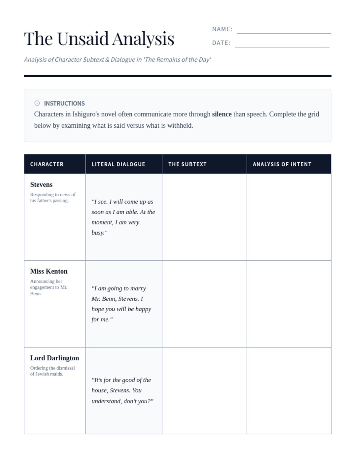 A deep dive into Kazuo Ishiguro's 'The Remains of the Day', focusing on the profound power of what remains unsaid. Students will analyze how characters use silence and subtext to navigate social hierarchies and emotional repression.