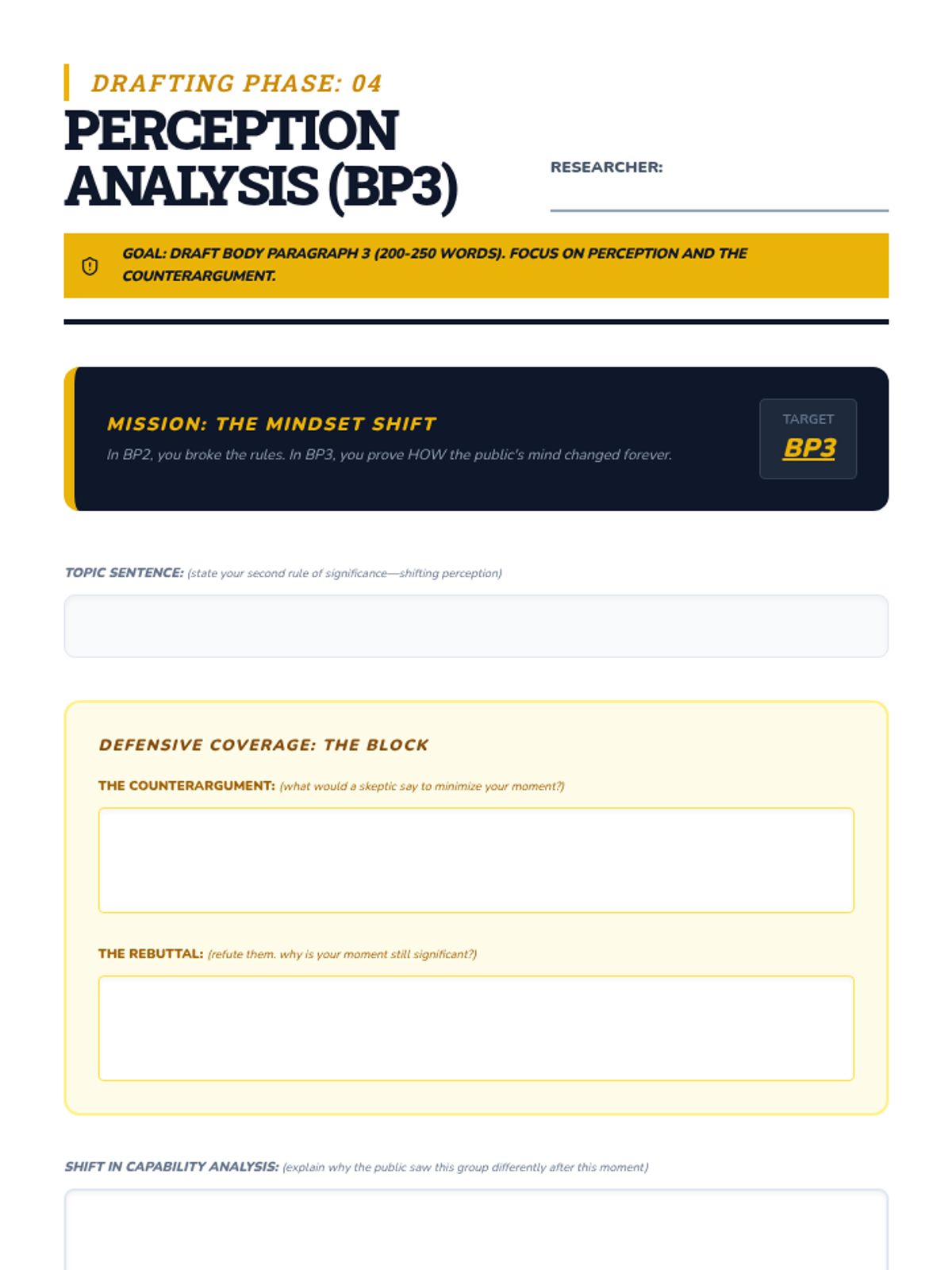 Drafting the third body paragraph, focusing on shifts in public perception and mastering the counterargument/rebuttal.
