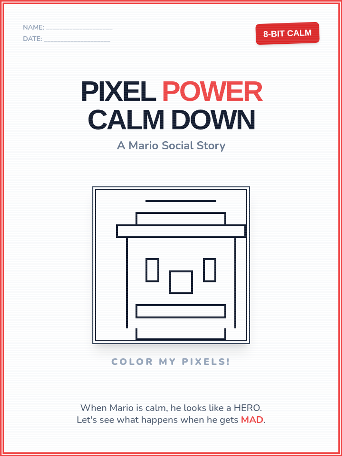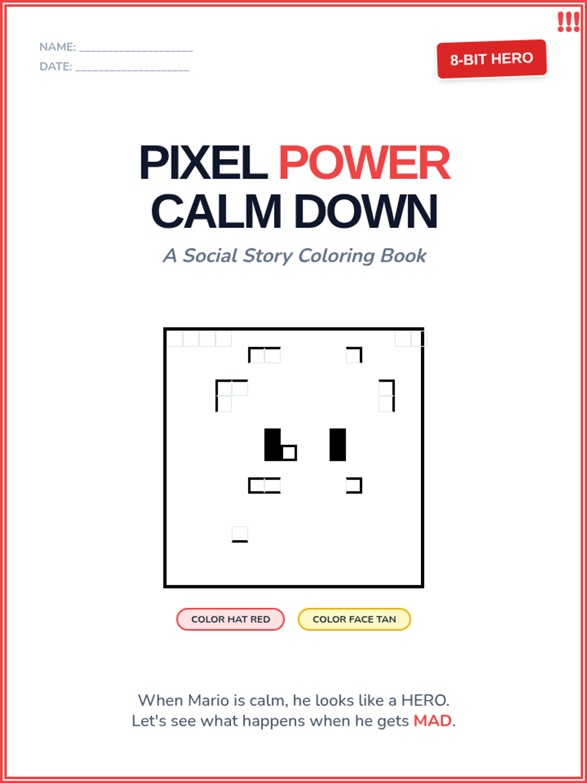 A 5-page coloring social story helping students identify anger and use calming strategies alongside Mario.