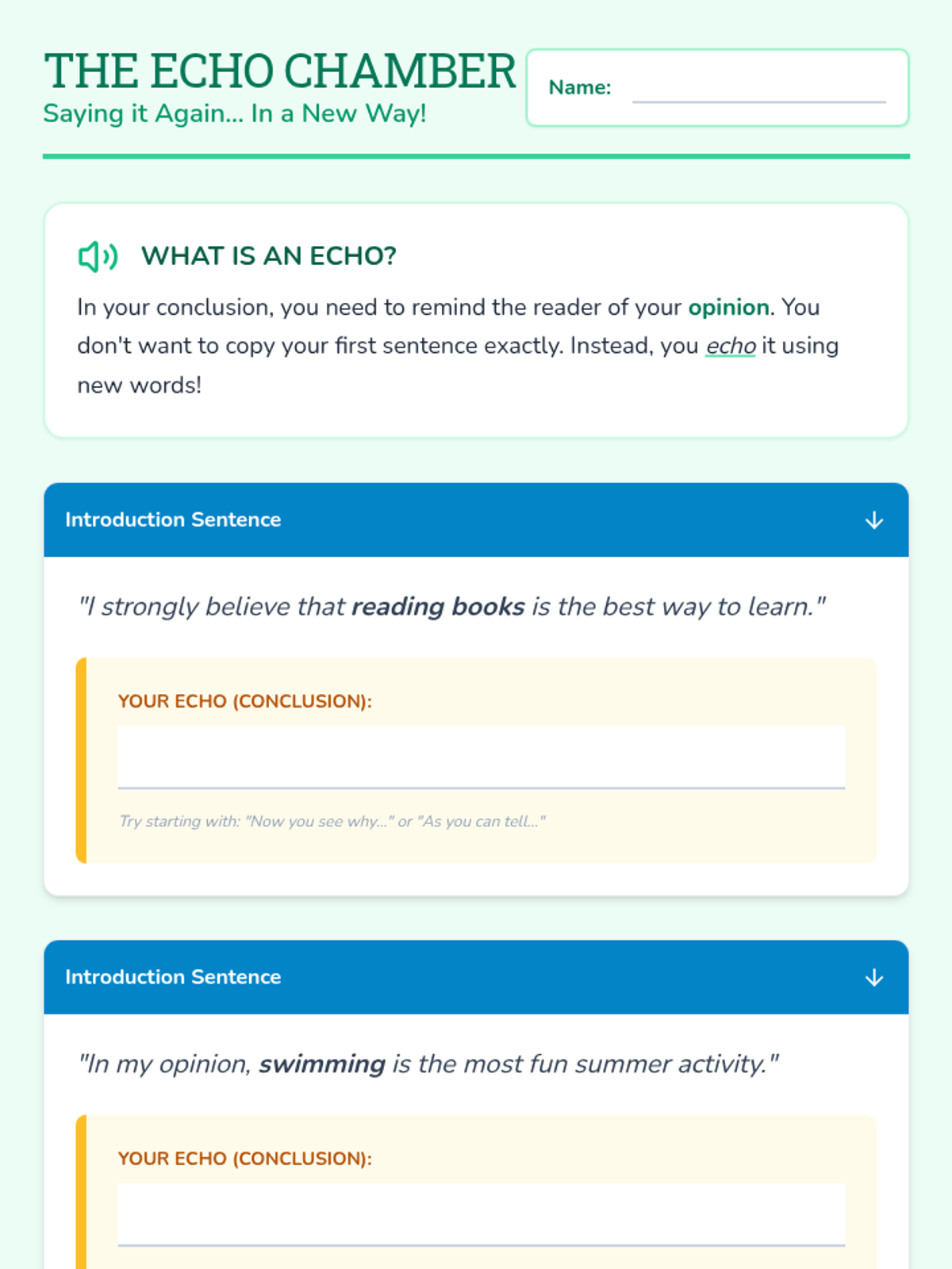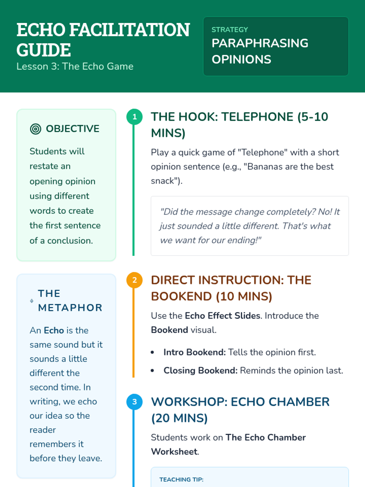 Students learn the concept of 'echoing' their introduction without copying it exactly. They practice rewriting their opening opinion using different words to create the first sentence of a conclusion.