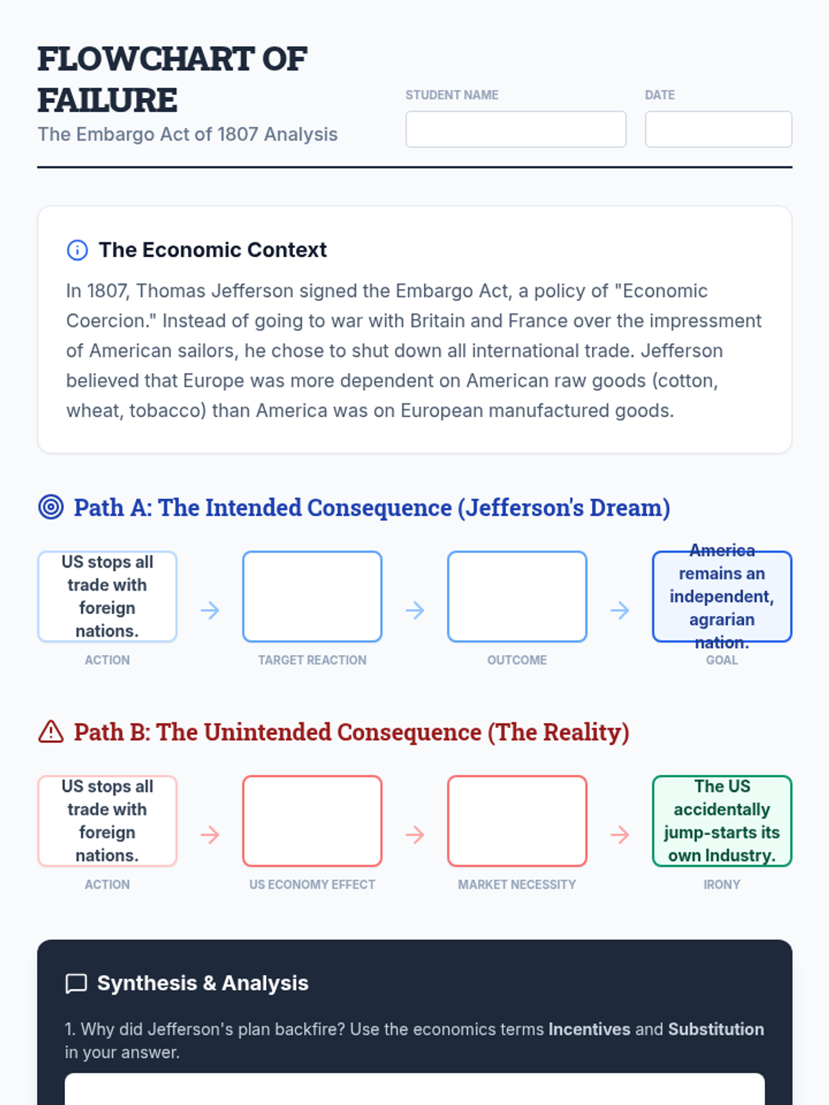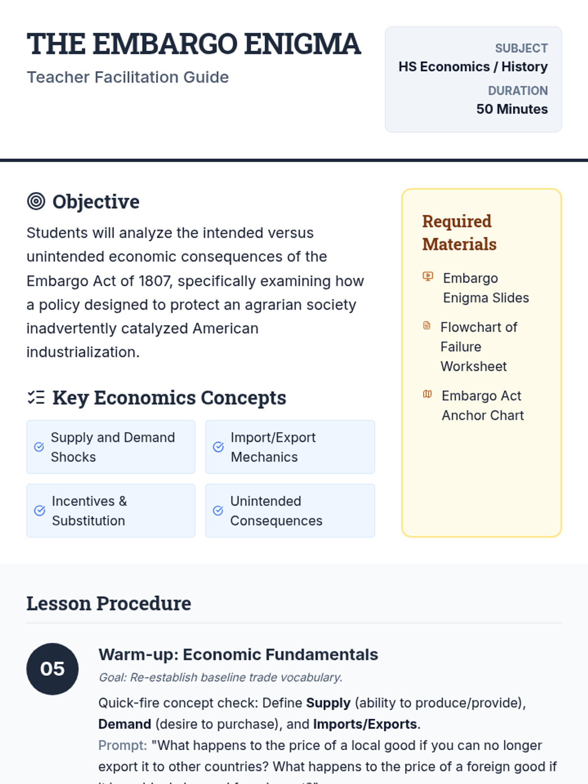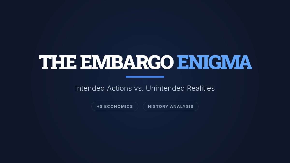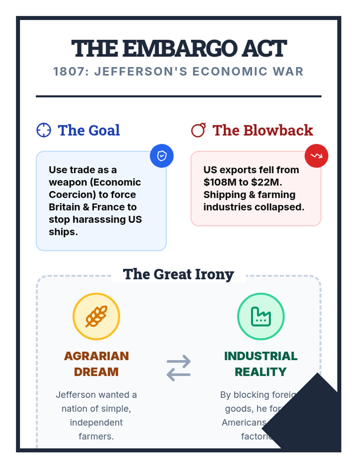 An economics-focused exploration of the Embargo Act of 1807, analyzing the unintended shift from Jefferson's agrarian dream to American industrialization.