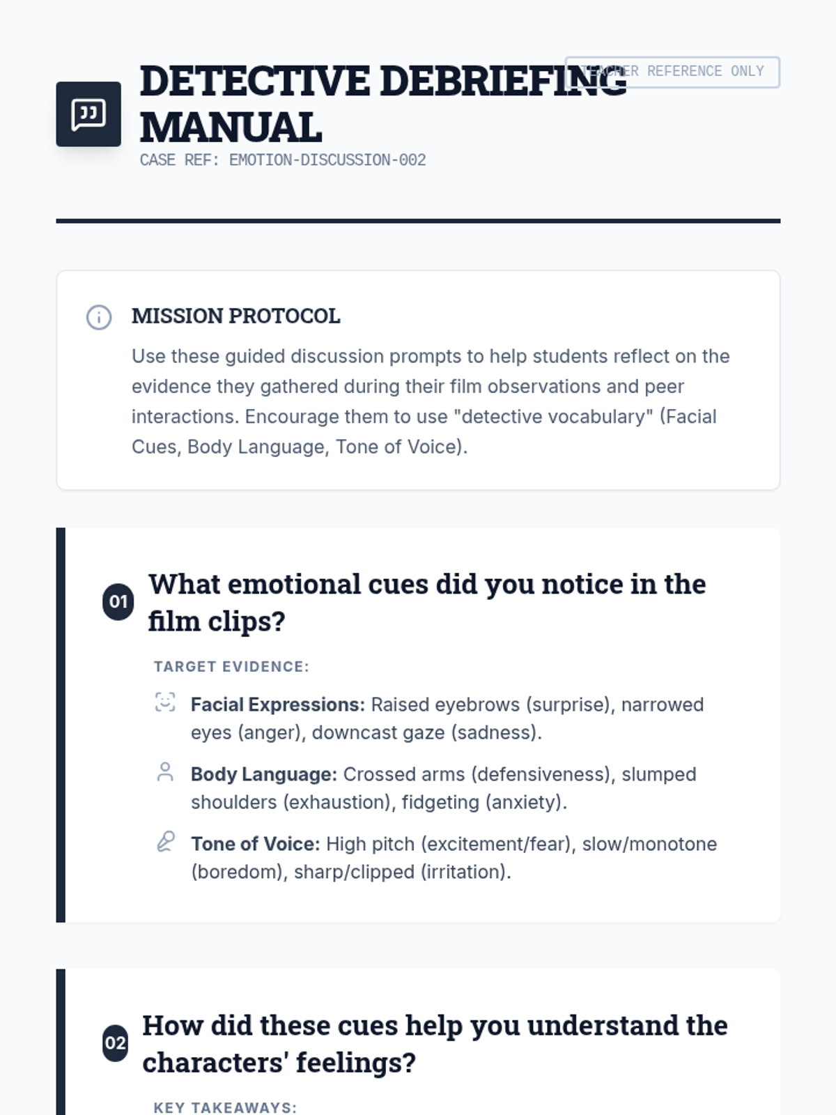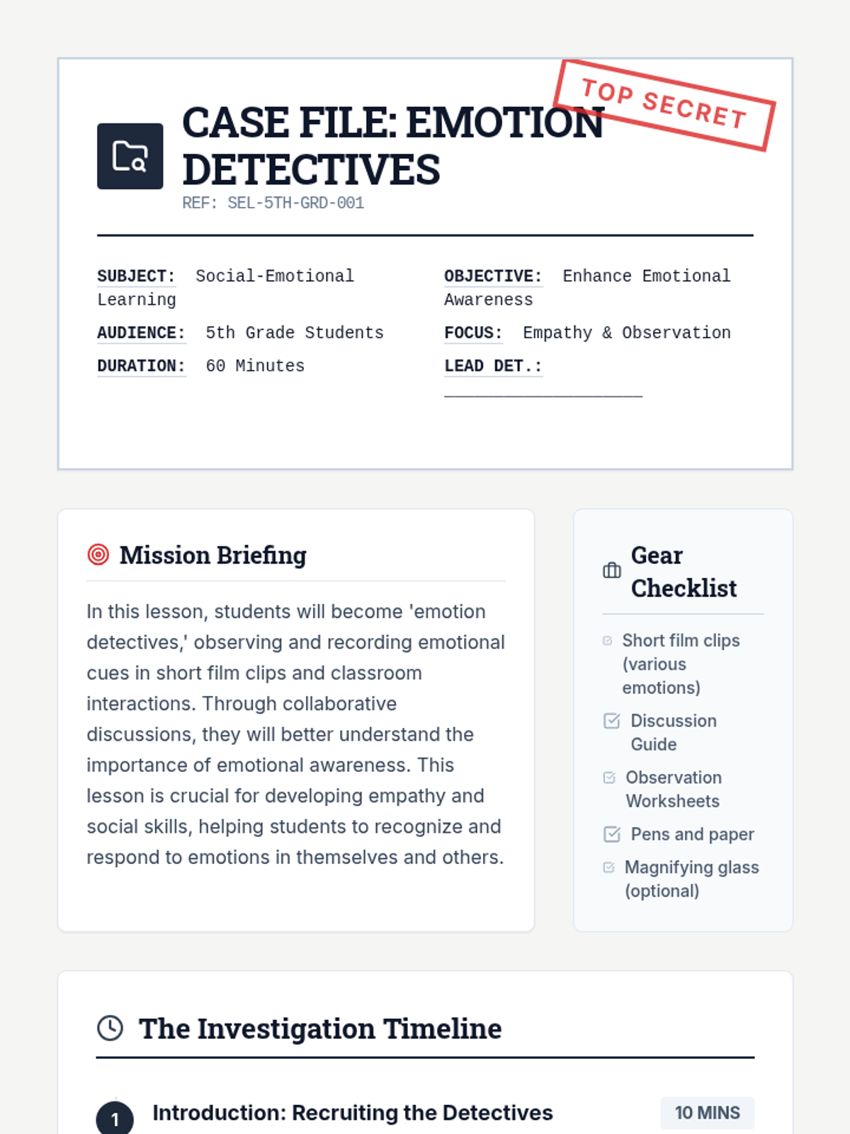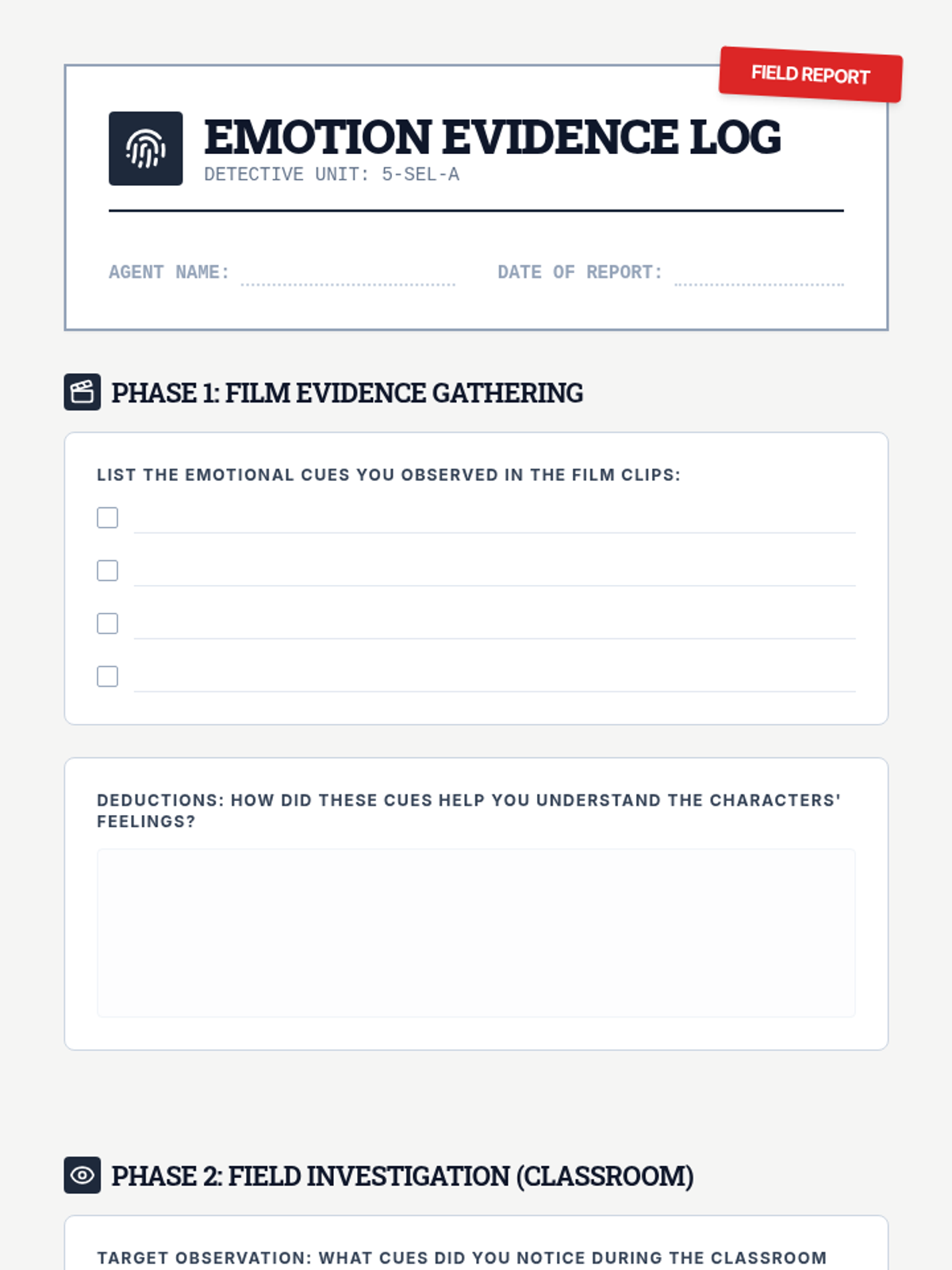 A detective-themed Social-Emotional Learning (SEL) lesson where students learn to identify and record emotional cues through film clips and partner interactions to build empathy and social awareness.