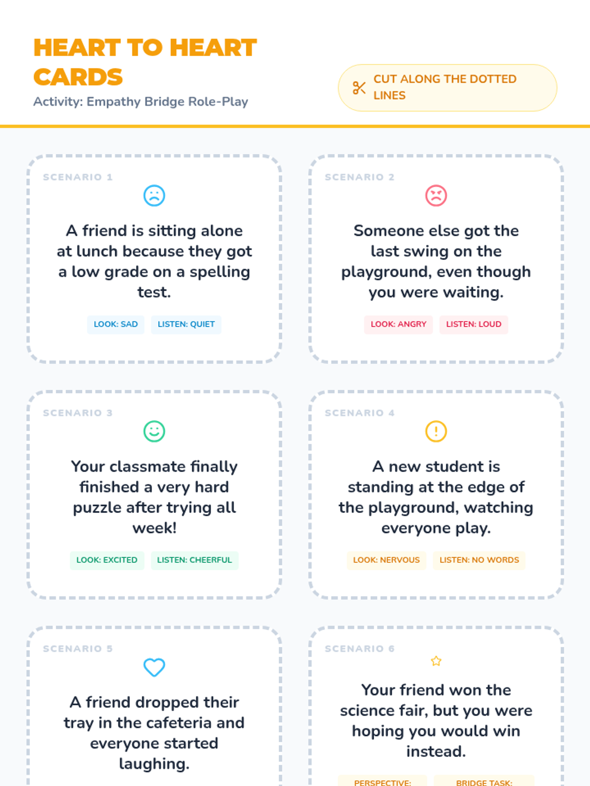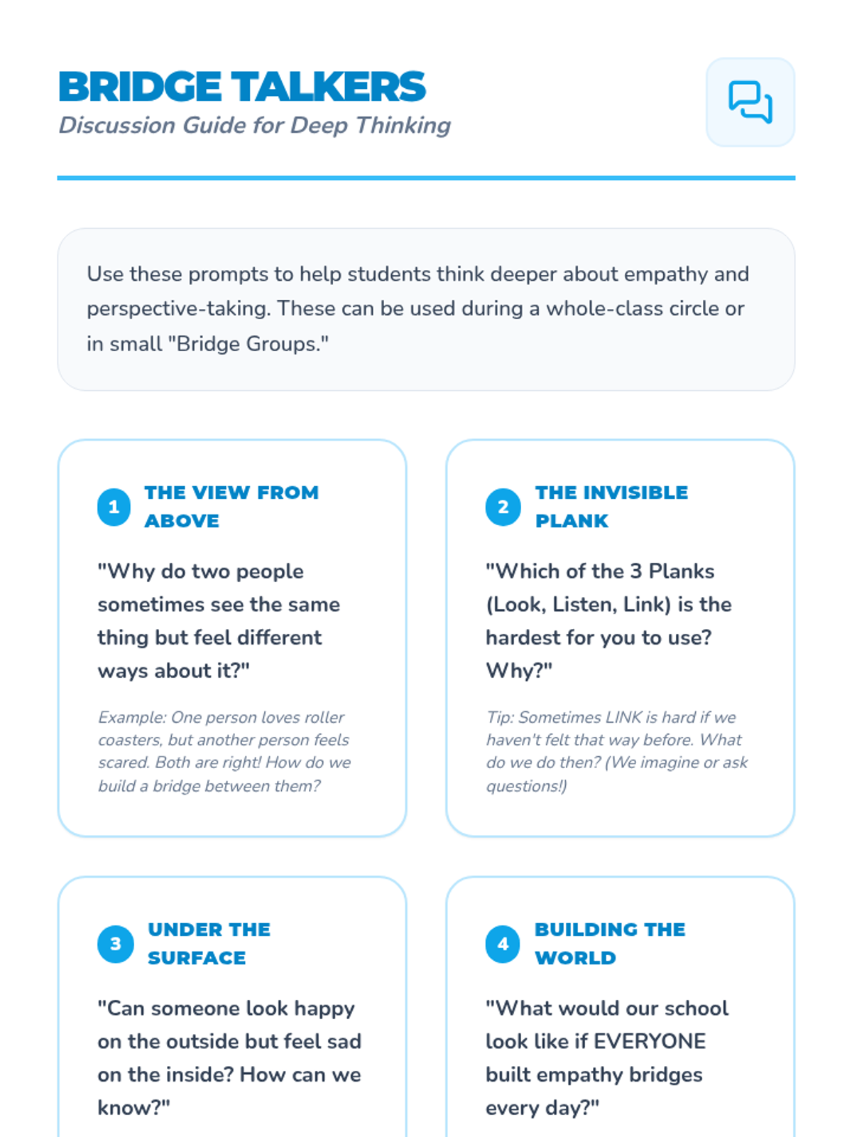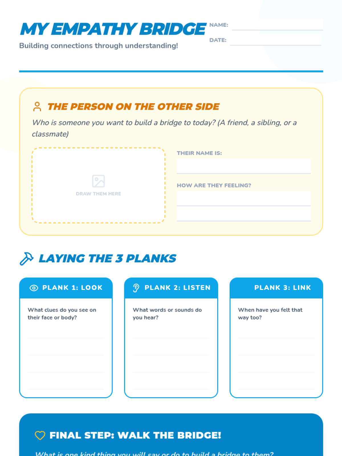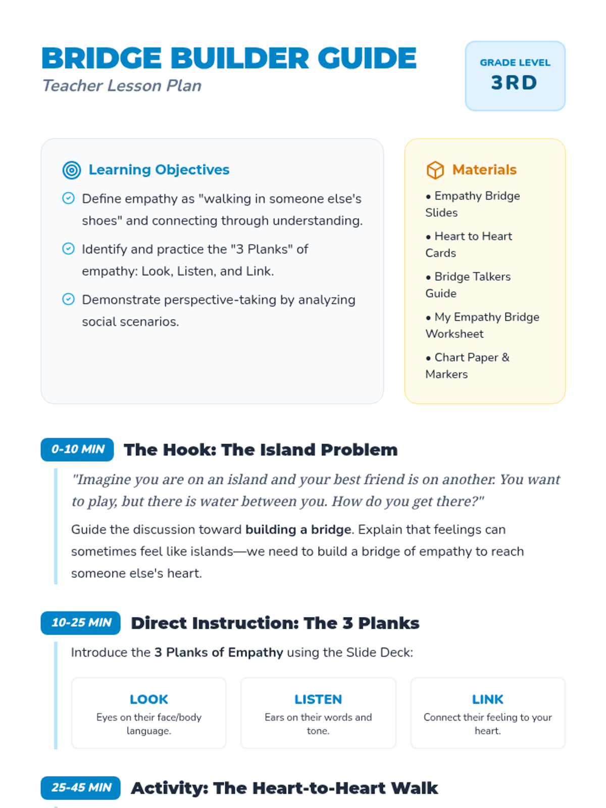 A lesson for 3rd graders on developing empathy and perspective-taking using a bridge metaphor to visualize connecting with others' feelings. Students will learn the '3 Planks' of empathy—Look, Listen, and Link—to better understand and support their peers through storytelling and role-playing.
