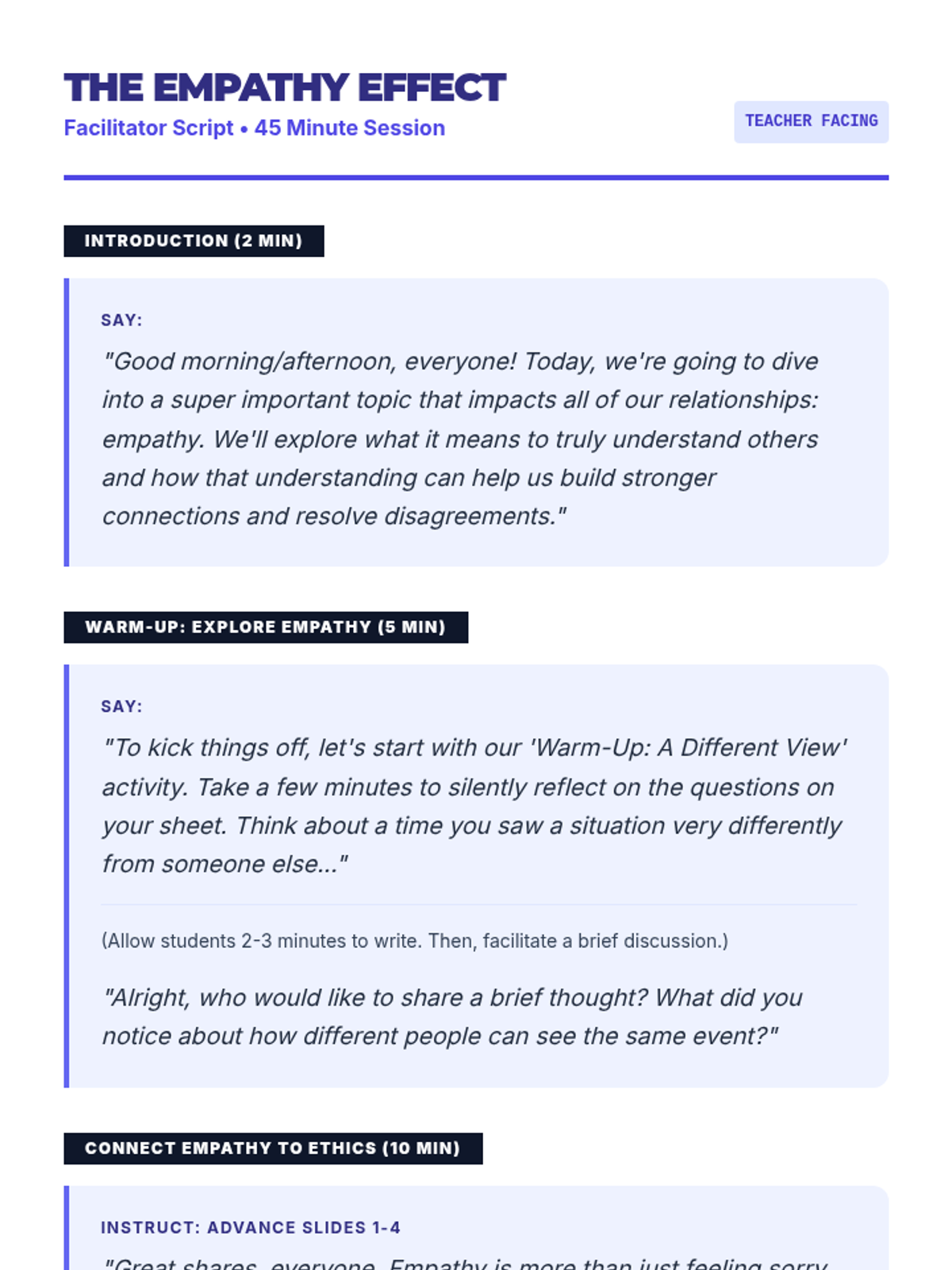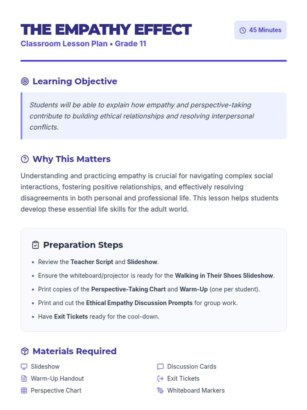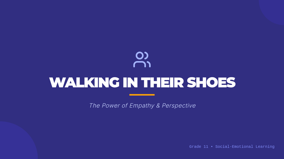 An interactive lesson for 11th-grade students focused on developing empathy and perspective-taking skills to foster ethical relationships and resolve conflicts. Students engage in discussions, scenario analysis, and personal reflection to understand the impact of empathy on social interactions.