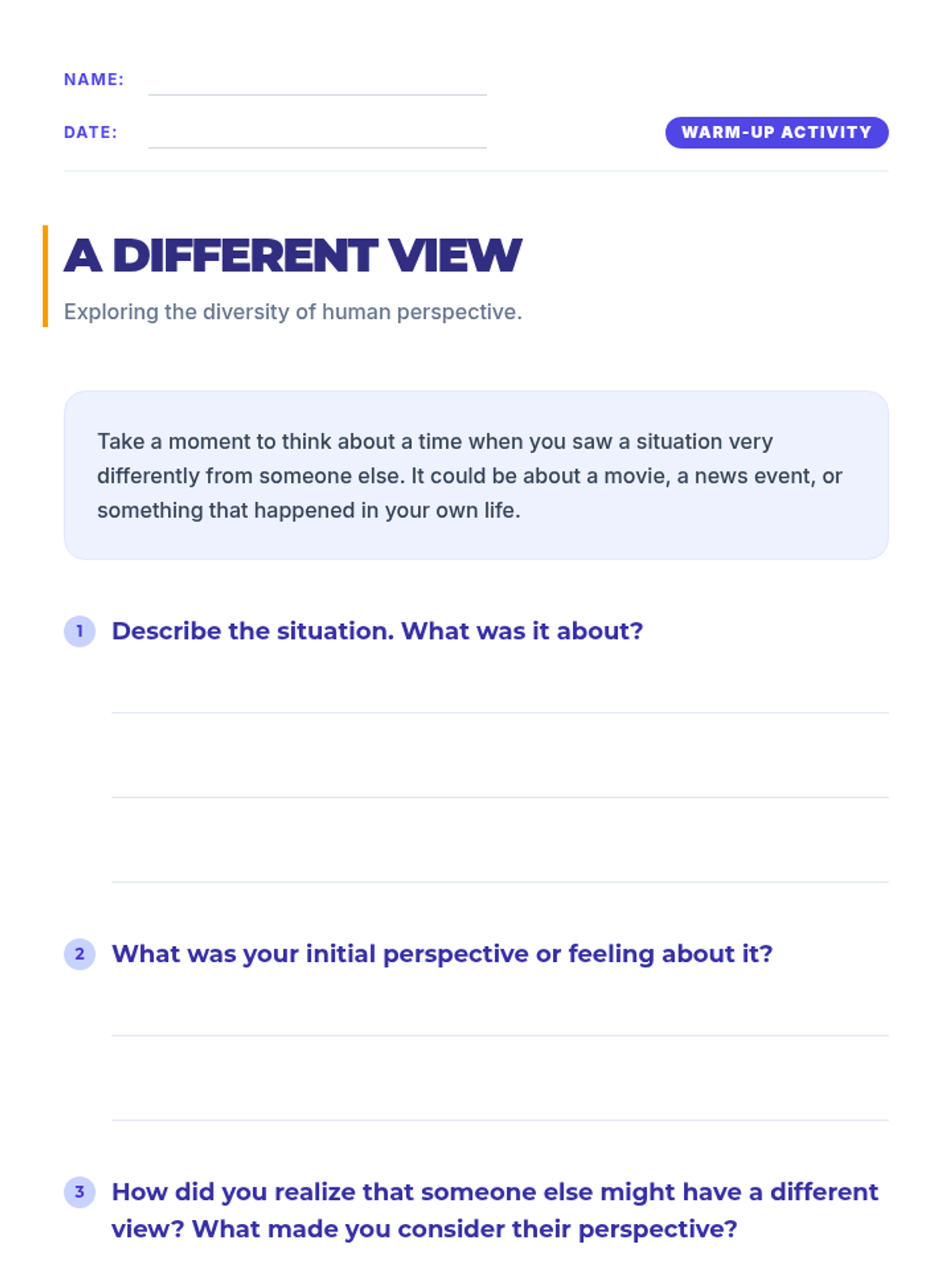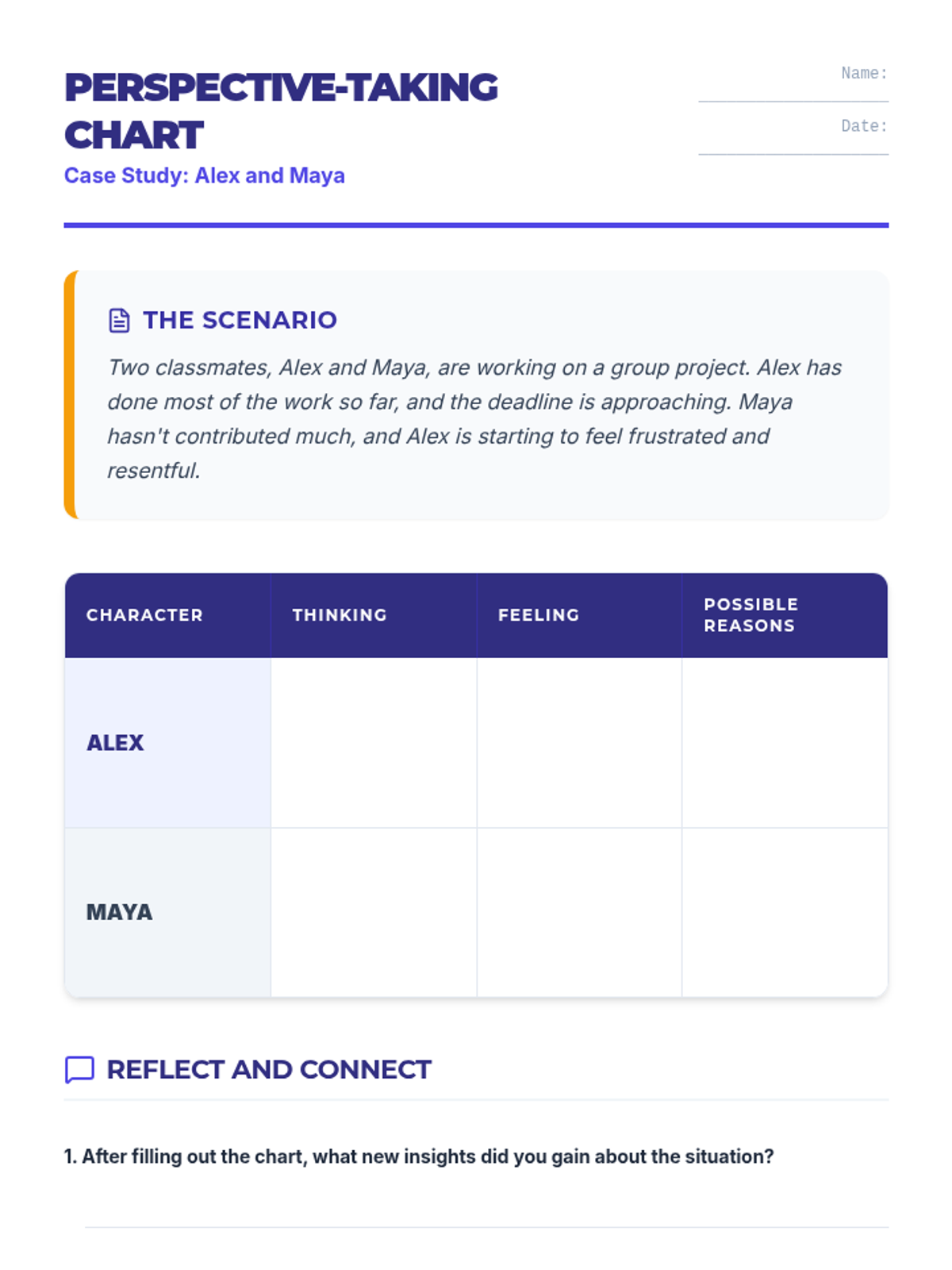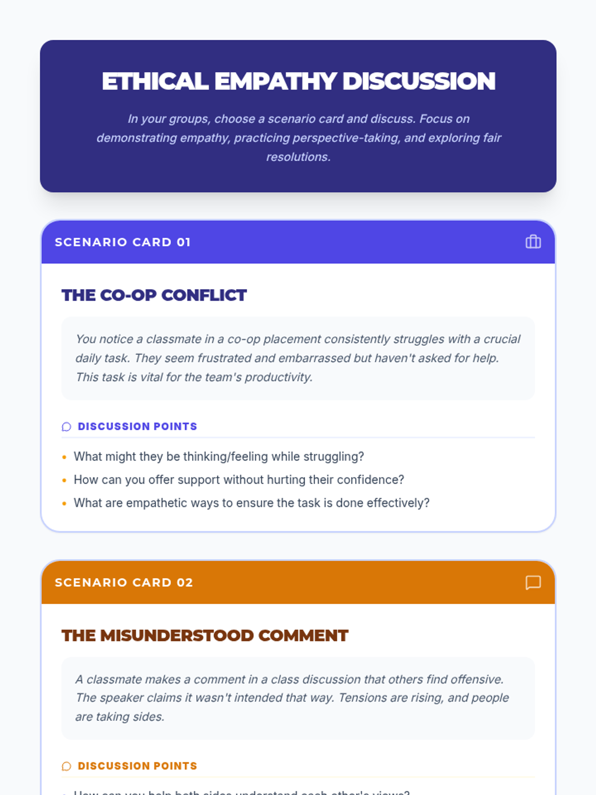 An interactive lesson for 11th-grade students focused on developing empathy and perspective-taking skills to foster ethical relationships and resolve conflicts. Students engage in discussions, scenario analysis, and personal reflection to understand the impact of empathy on social interactions.