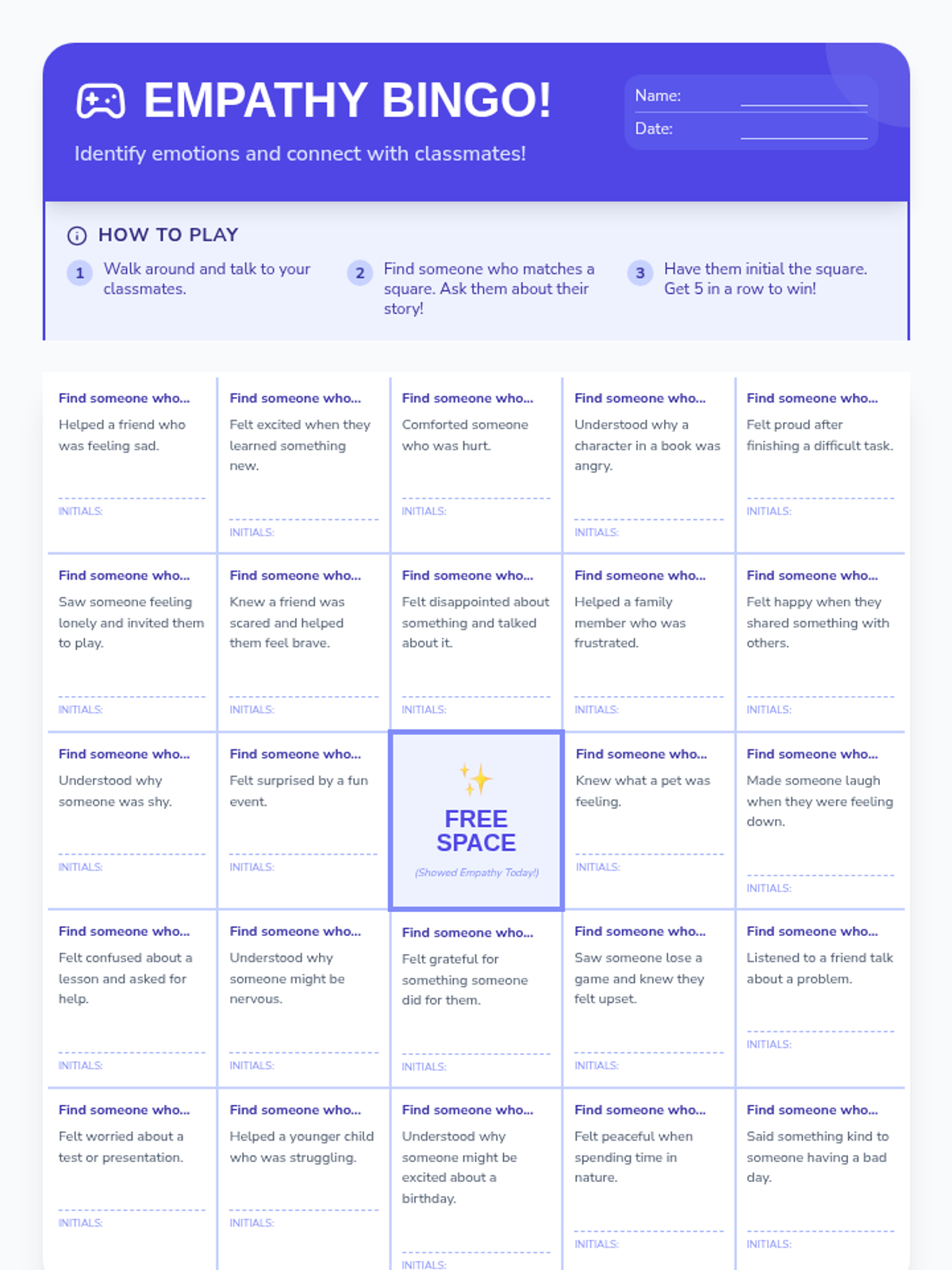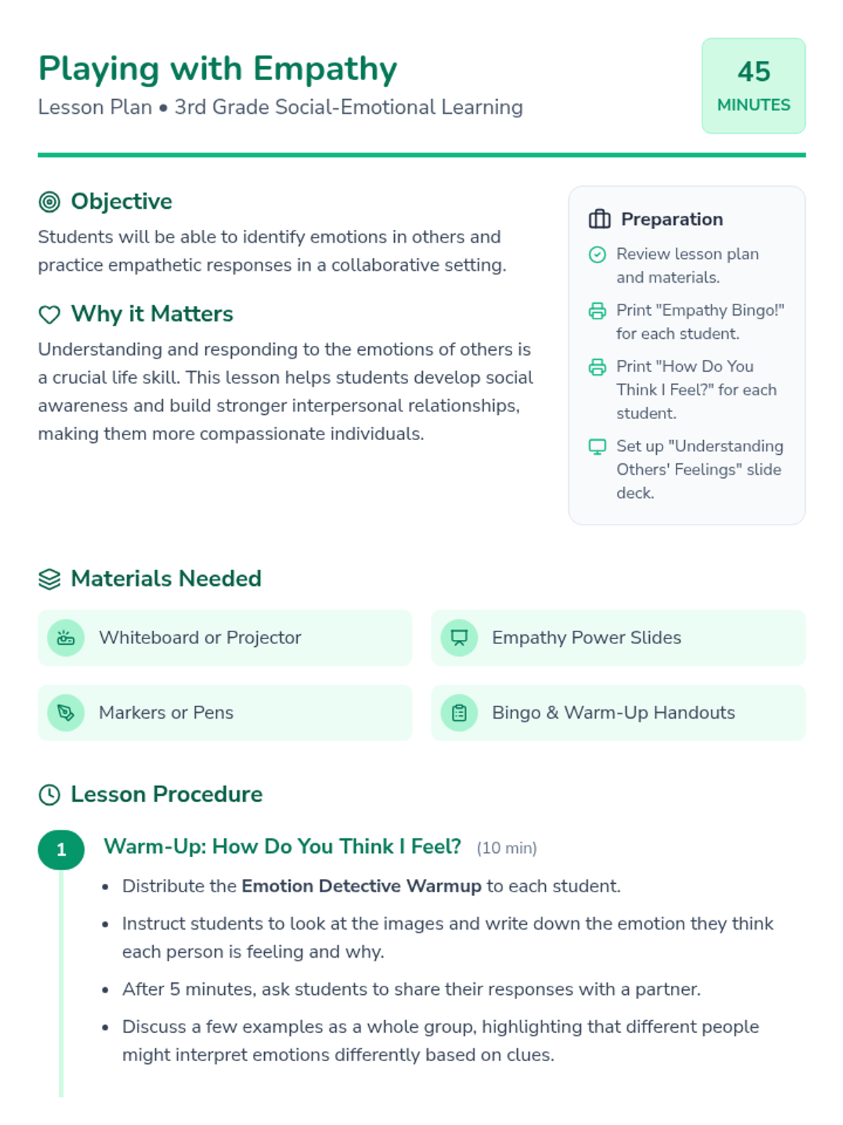A 45-minute interactive lesson for 3rd graders focused on identifying emotions and practicing empathetic responses through a bingo-style game and discussion.