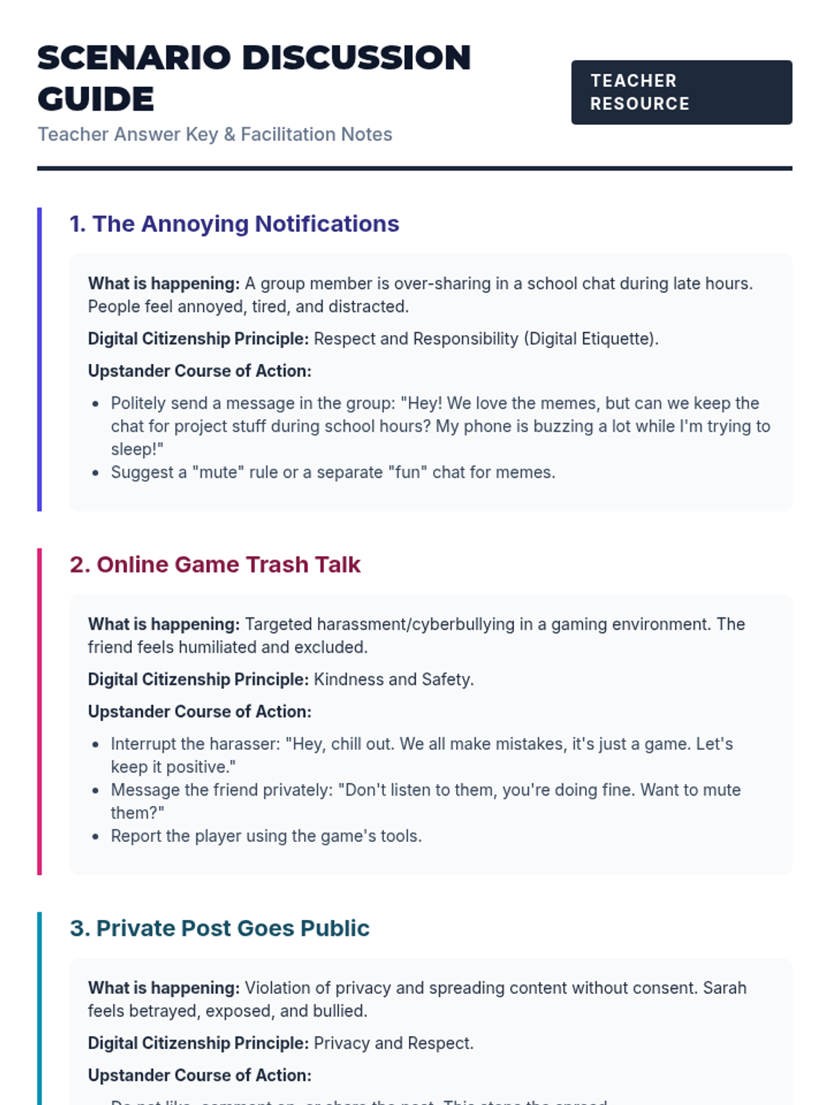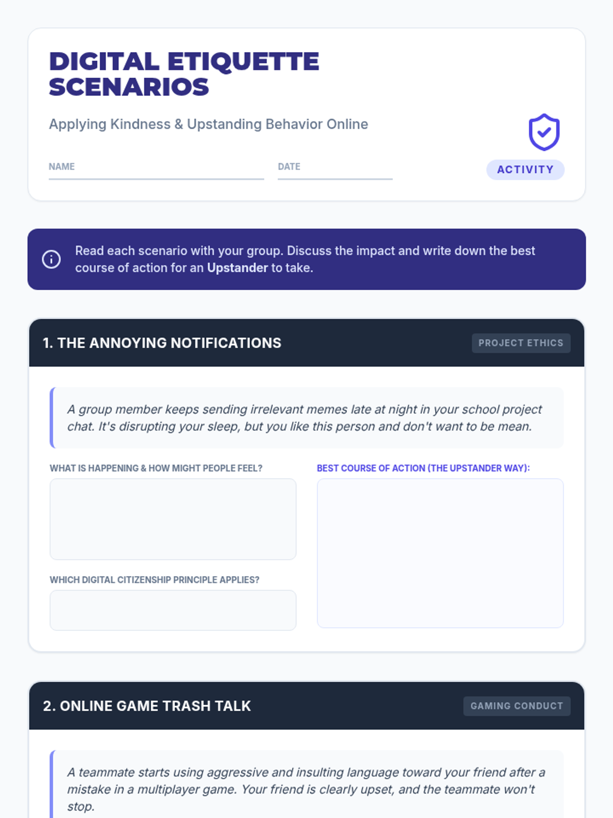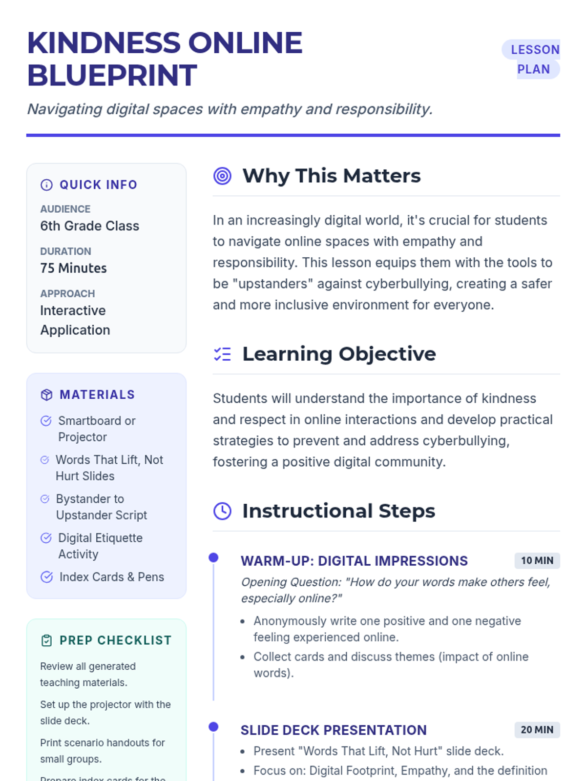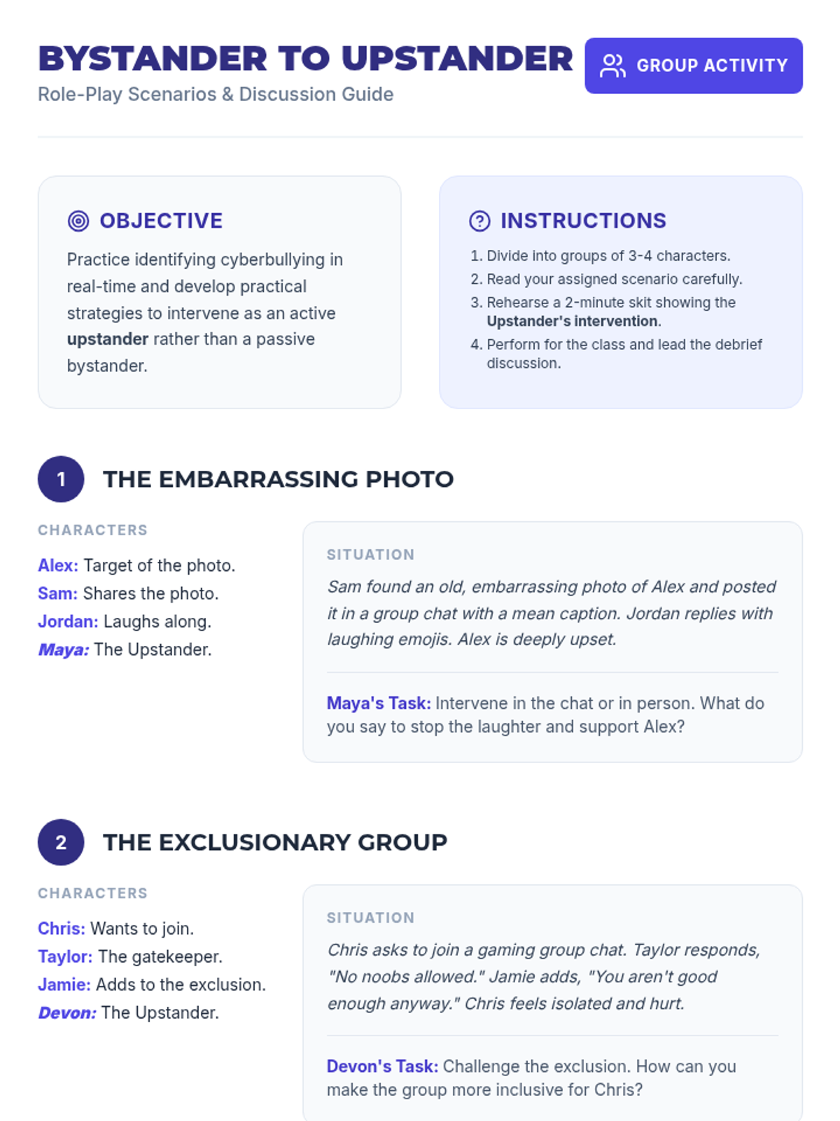 A 75-minute lesson for 6th graders focusing on empathy, digital citizenship, and strategies to transition from a bystander to an upstander in online environments.
