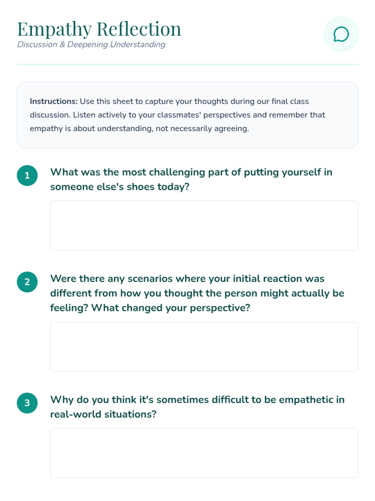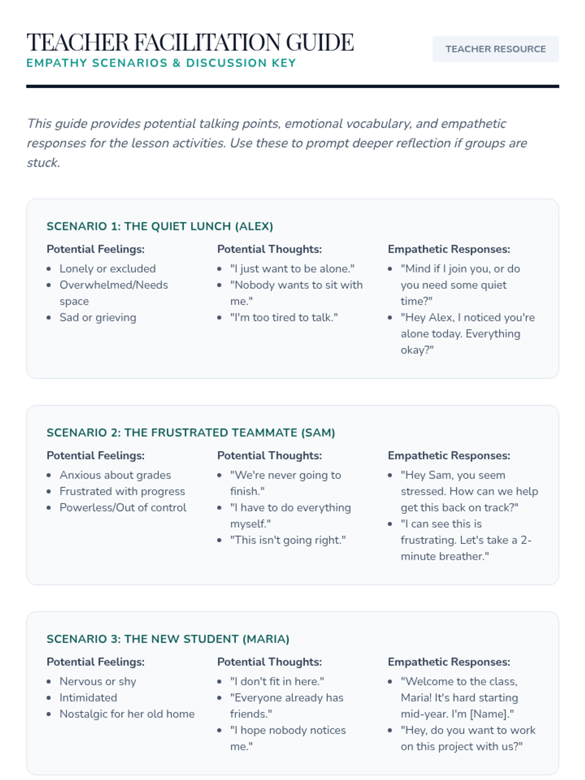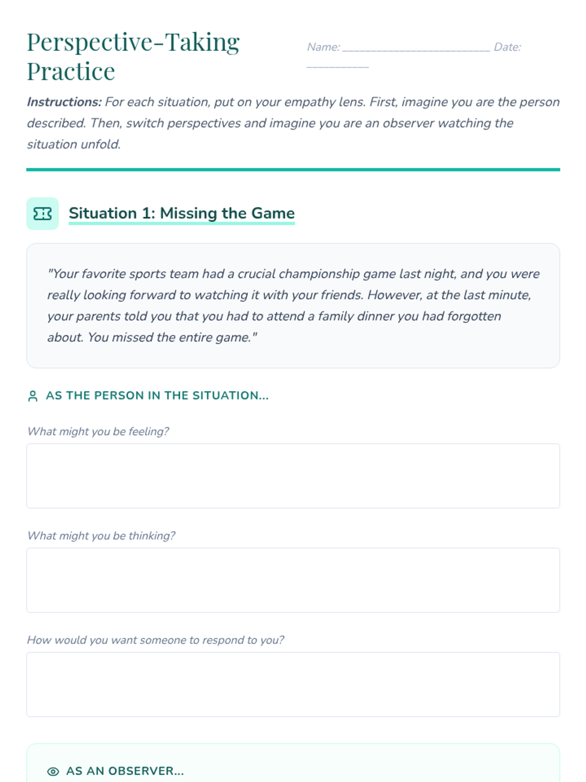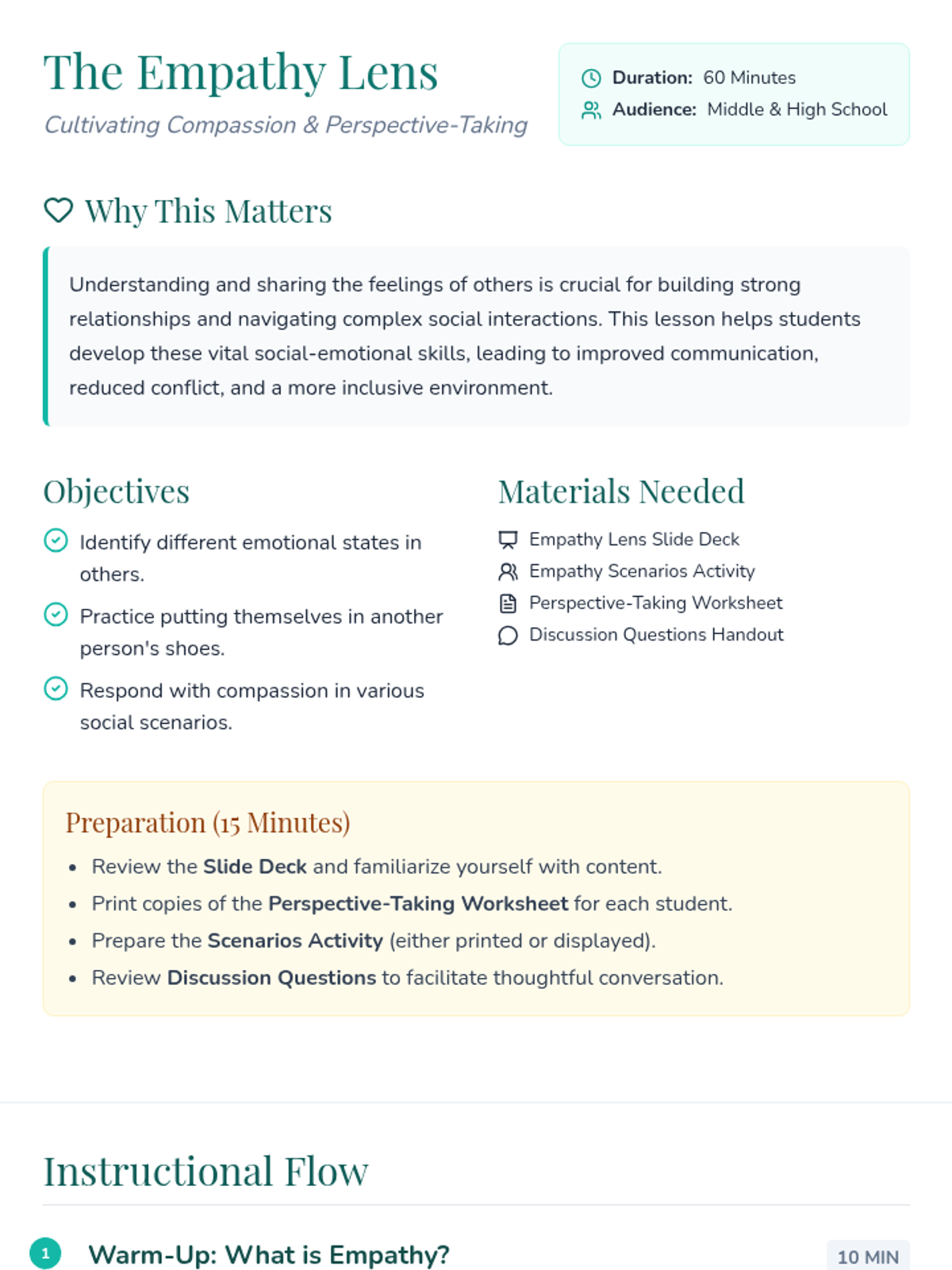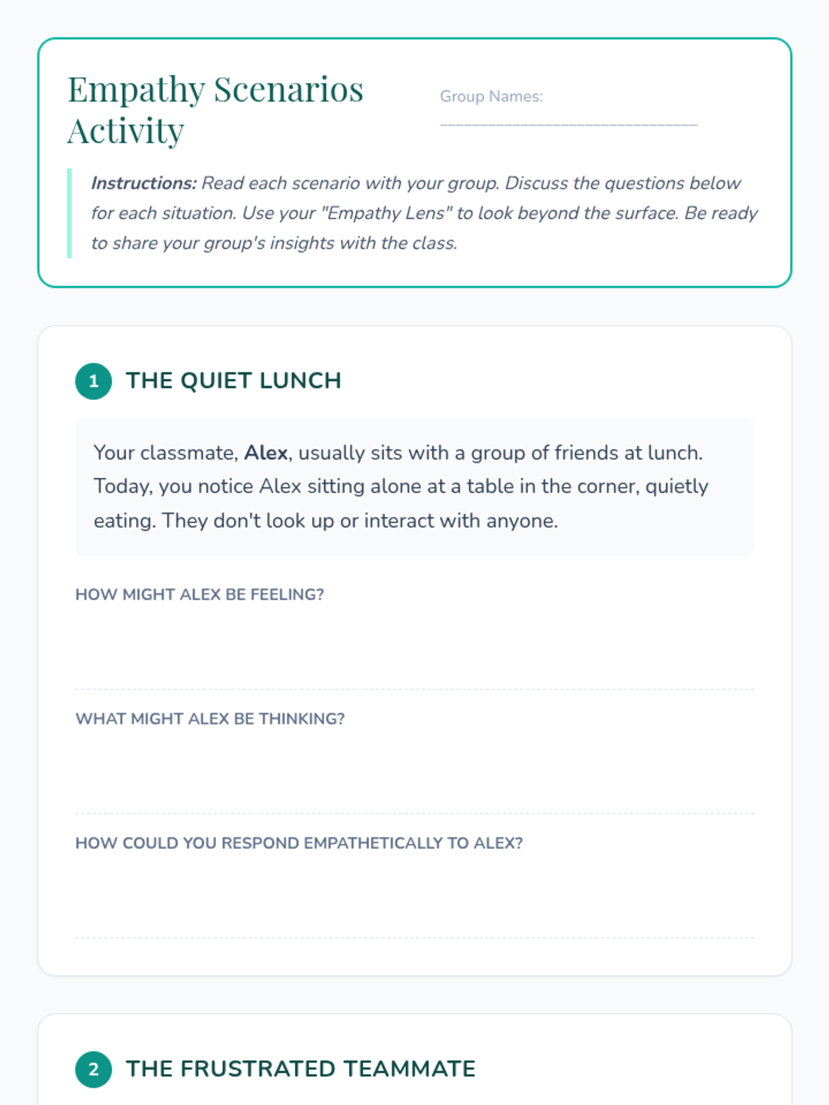 A 60-minute therapeutic lesson for middle and high school students focused on developing empathy and perspective-taking through interactive scenarios and guided reflection.