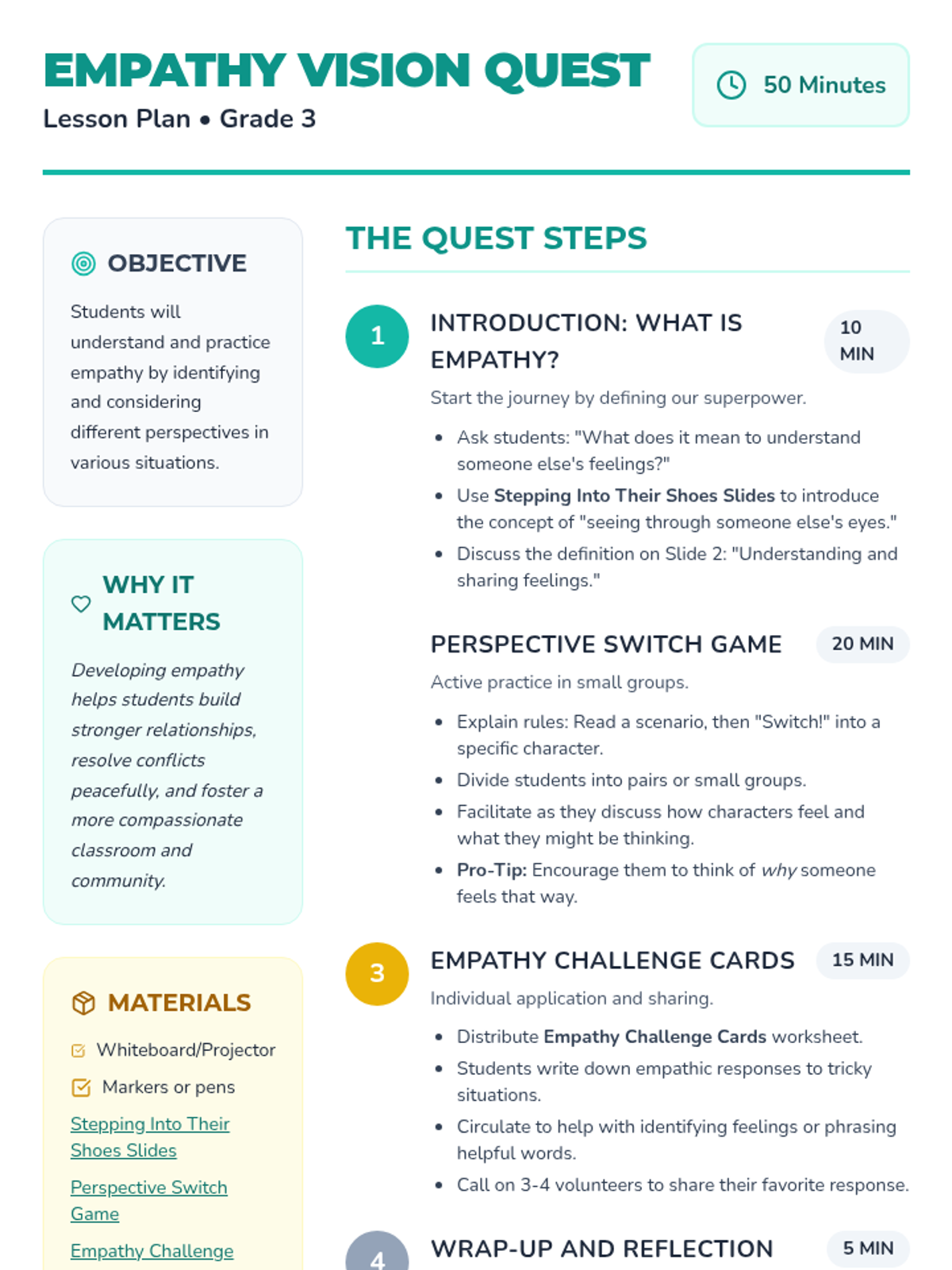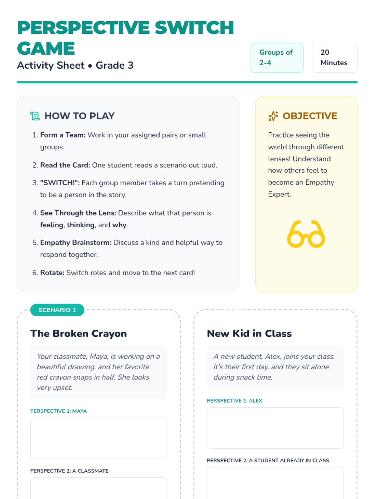 This lesson helps 3rd grade students develop empathy by practicing perspective-taking through interactive games and reflection. Students learn to 'step into others' shoes' to understand different feelings and viewpoints.