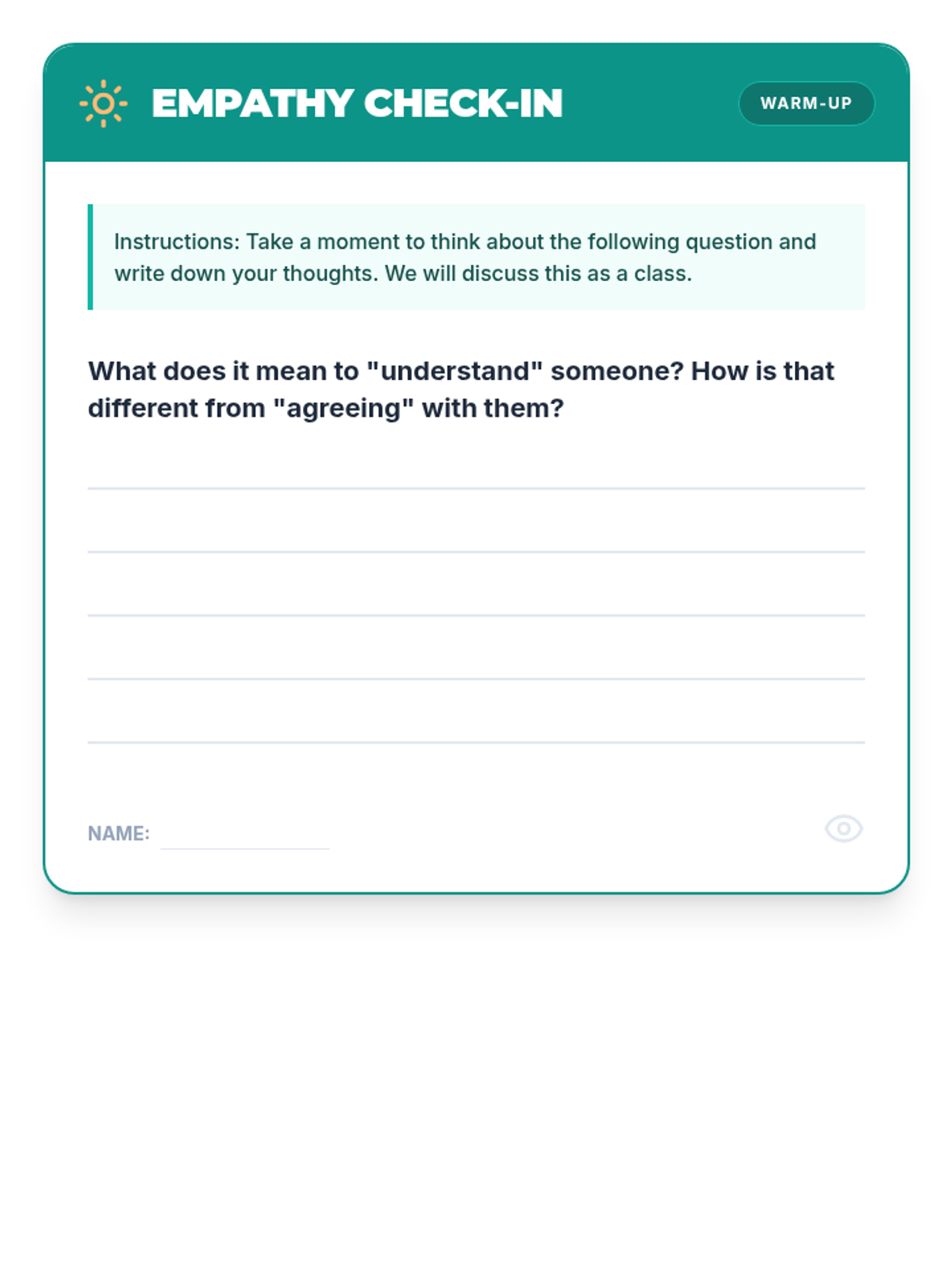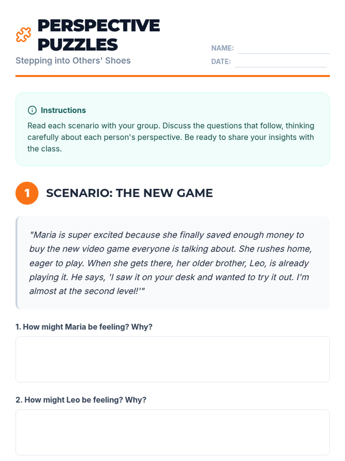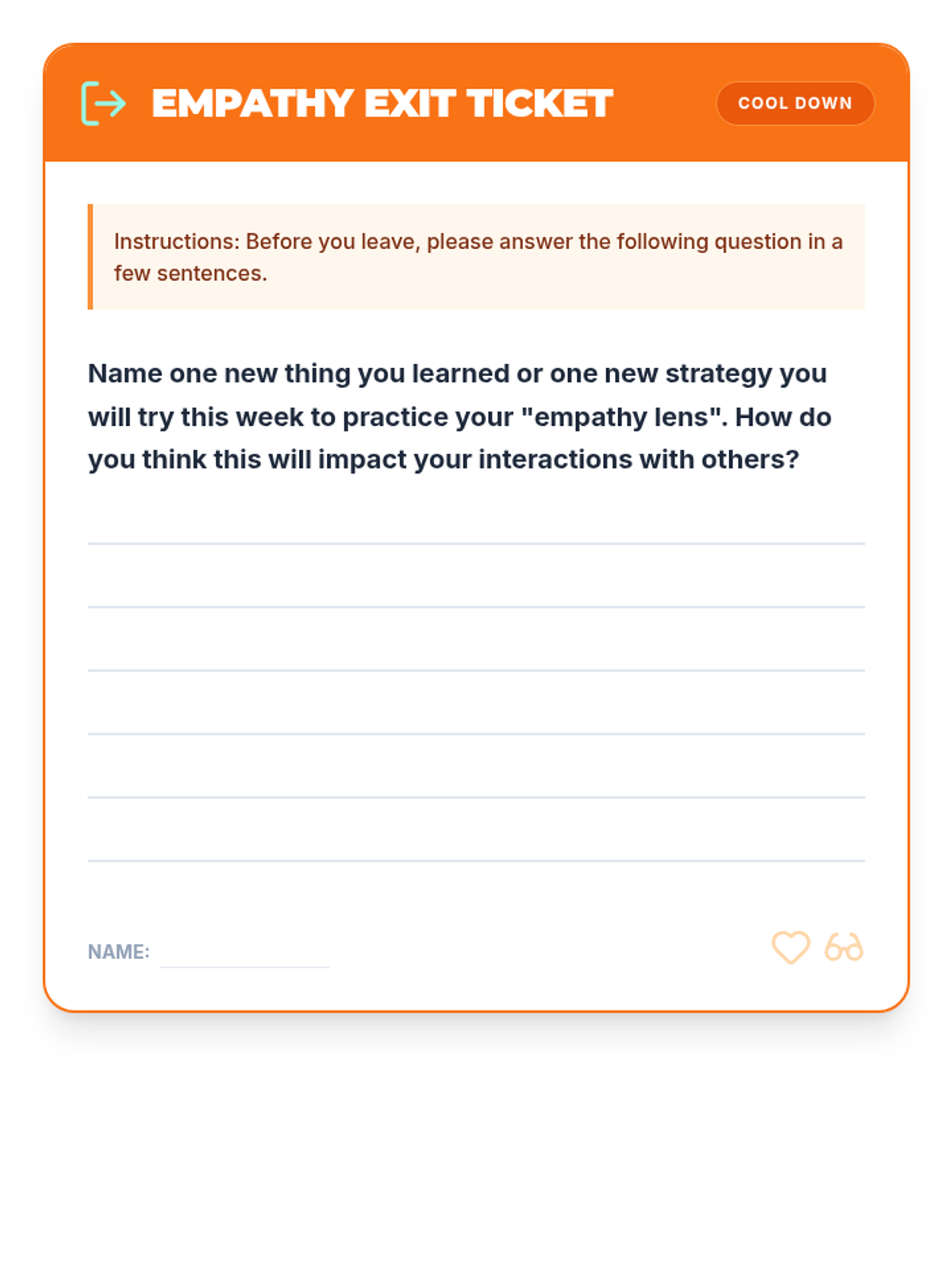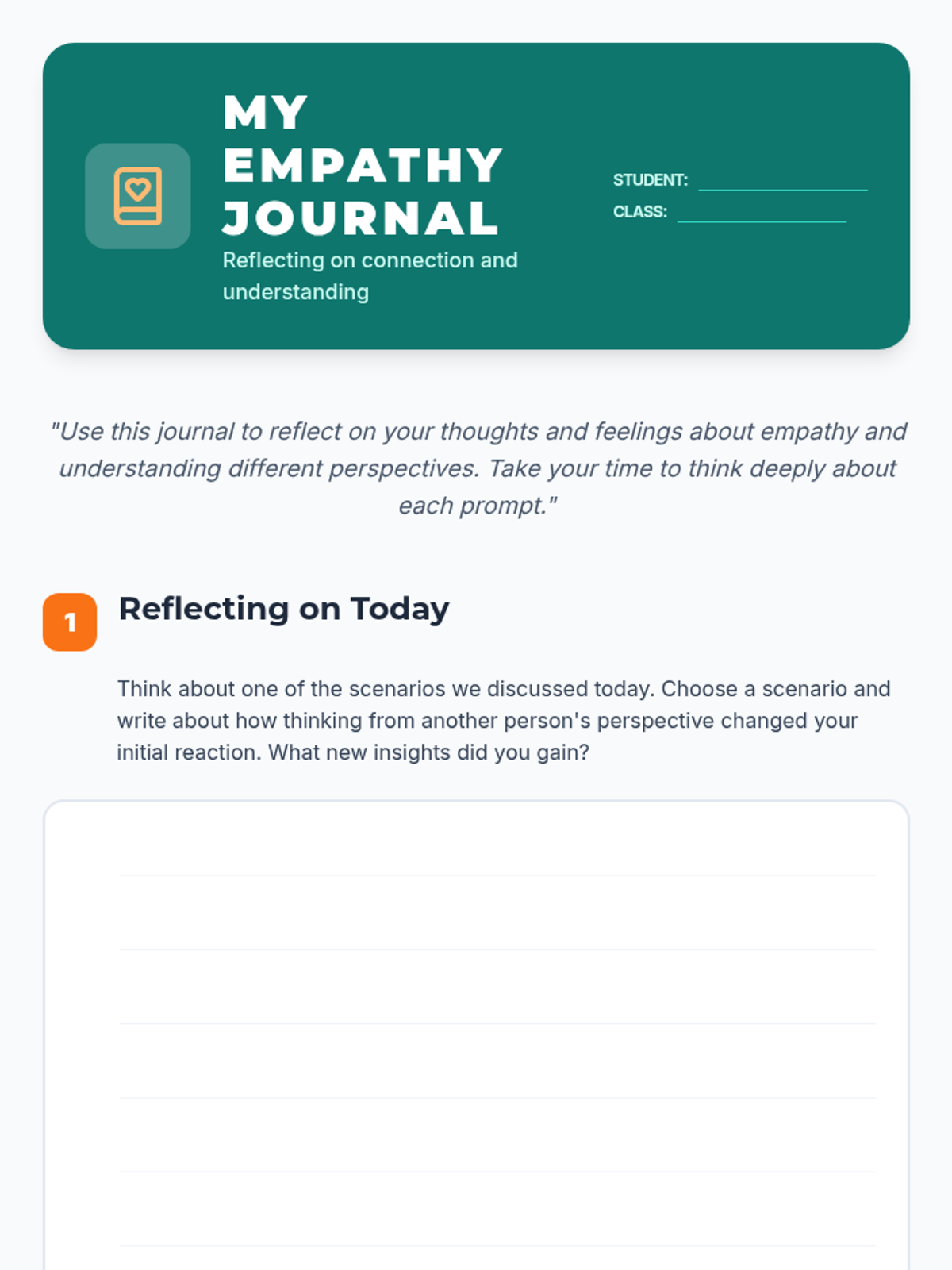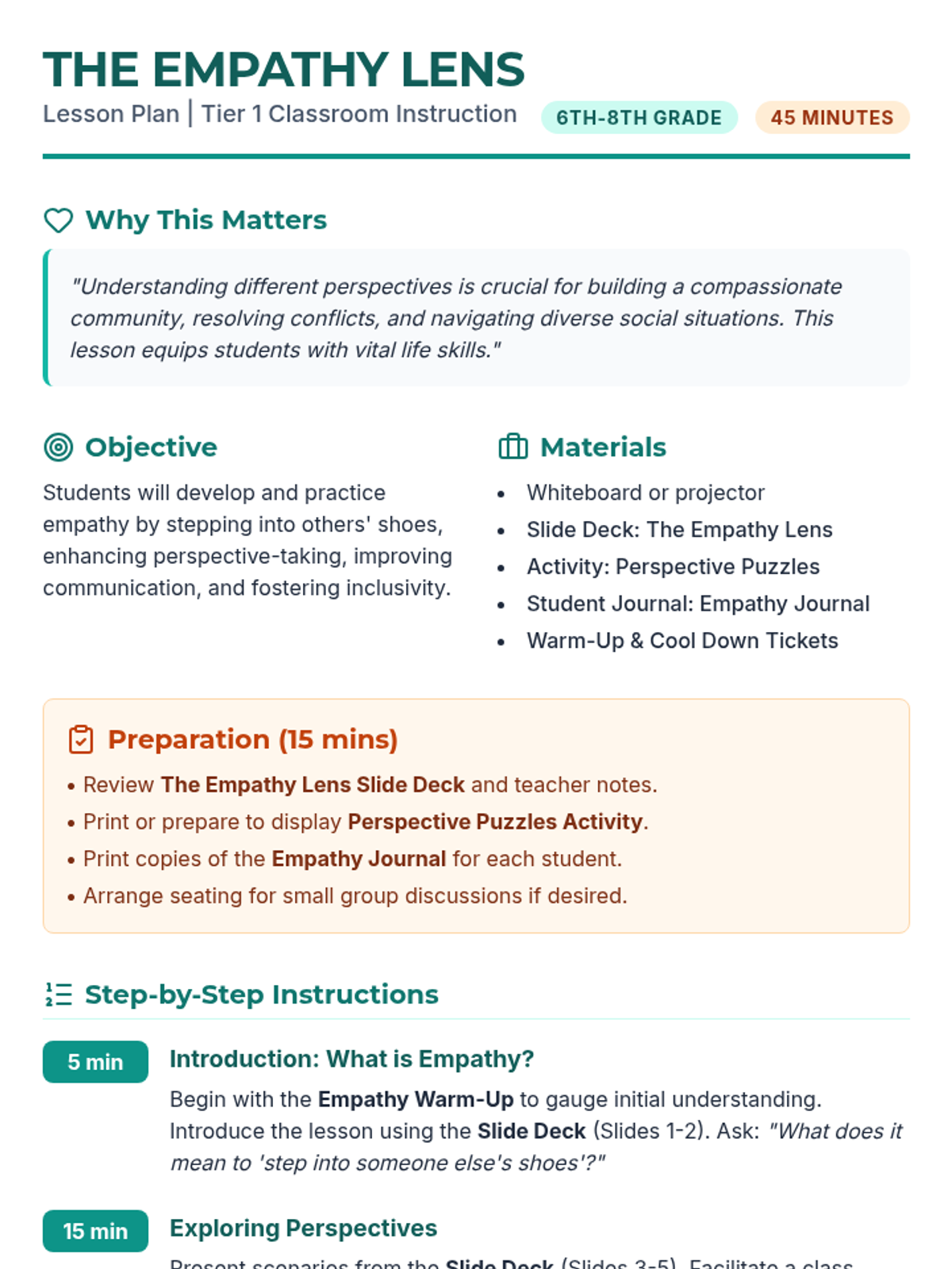 A 45-minute social-emotional learning lesson for middle schoolers designed to build perspective-taking skills through interactive scenarios and reflective journaling. Students learn to use their 'empathy lens' to better understand the emotions and motivations of others.