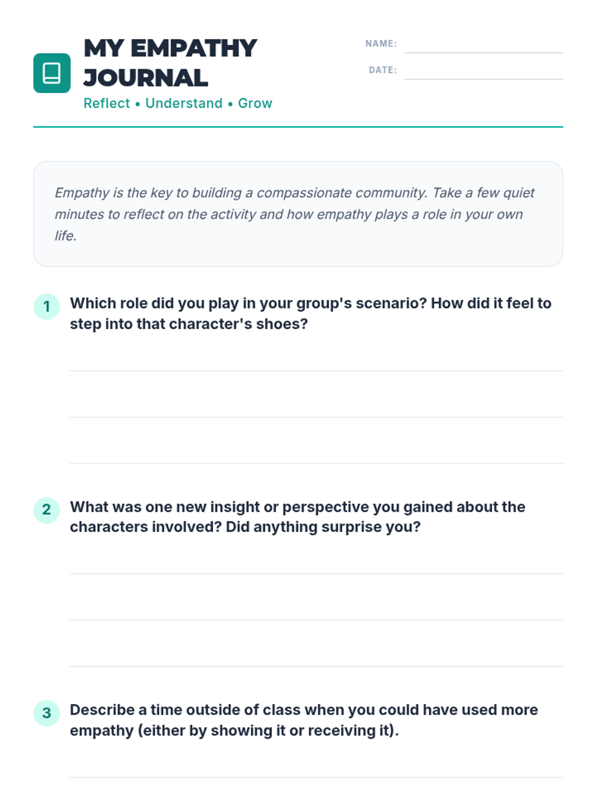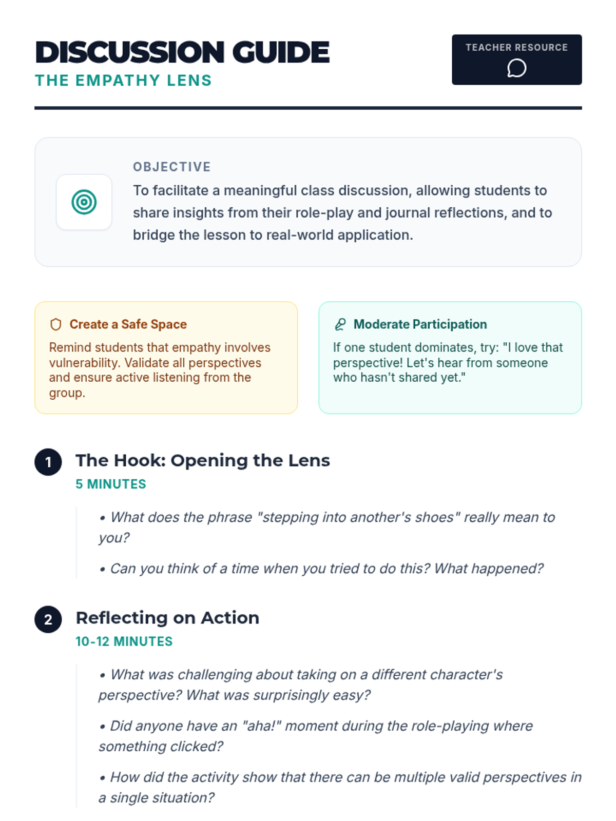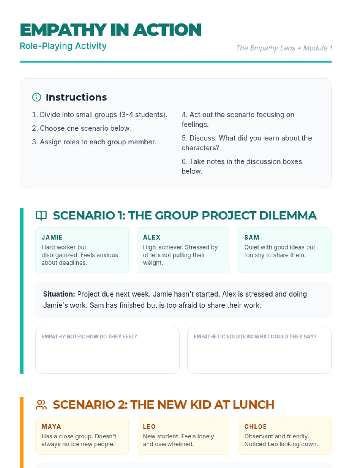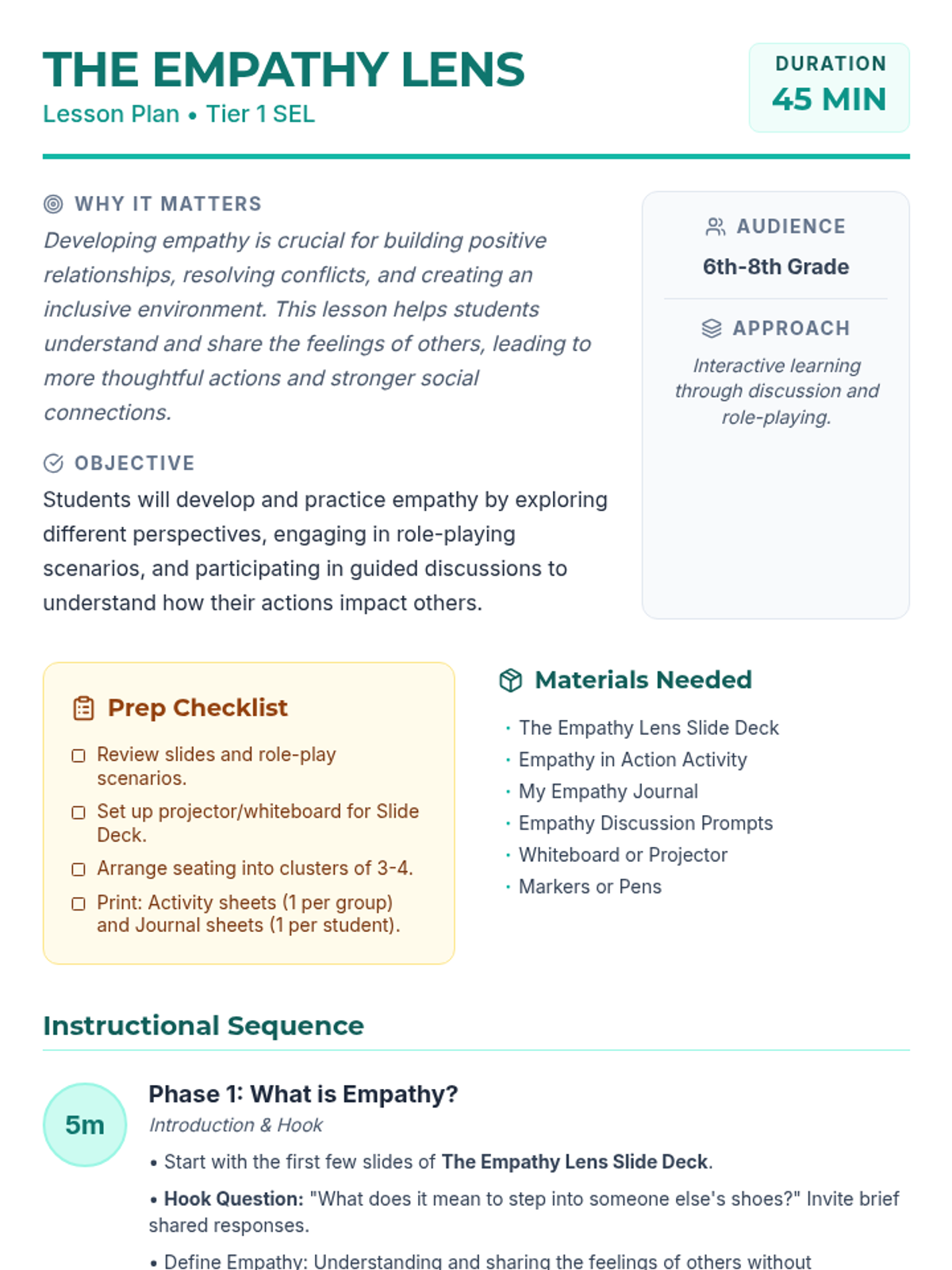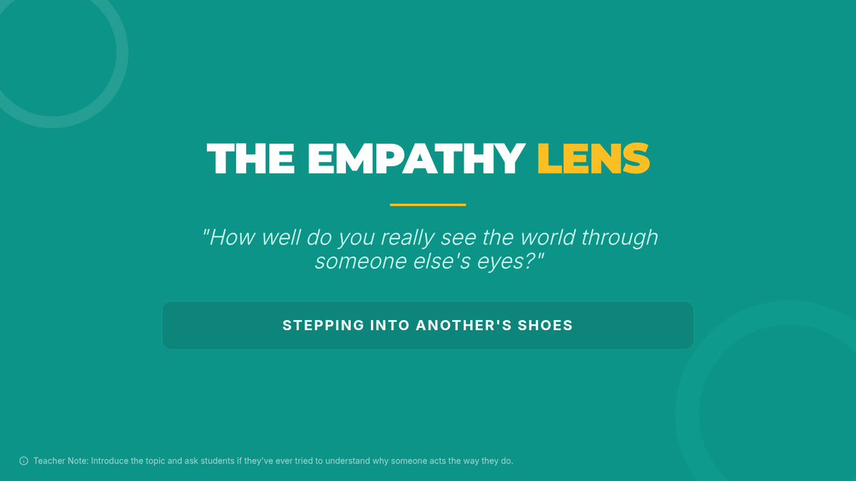 A 45-minute lesson for 6th-8th graders designed to develop emotional intelligence through perspective-taking, role-playing, and reflective journaling. Students explore 'The Empathy Lens' to understand how their actions impact others and build a more compassionate classroom community.