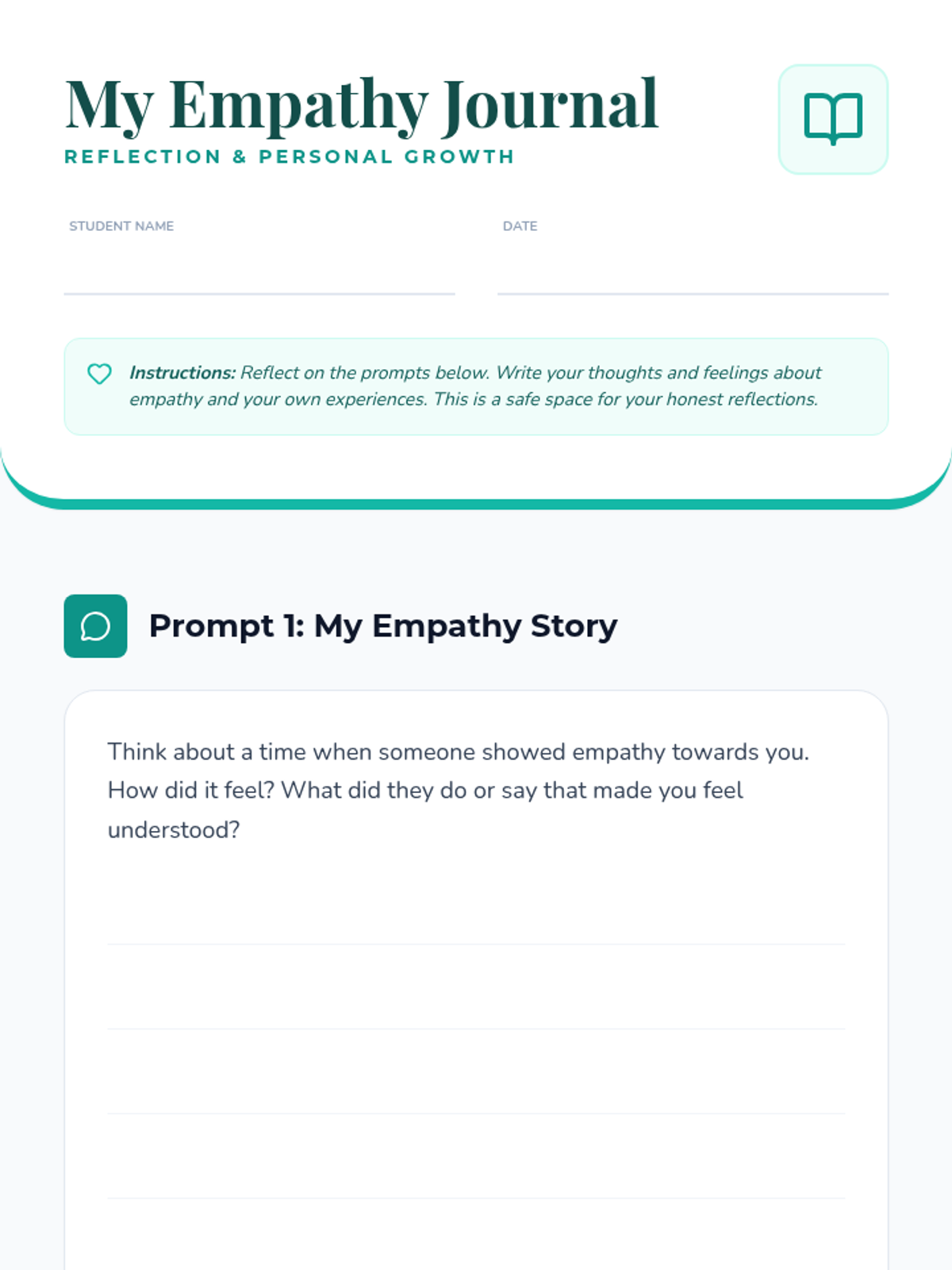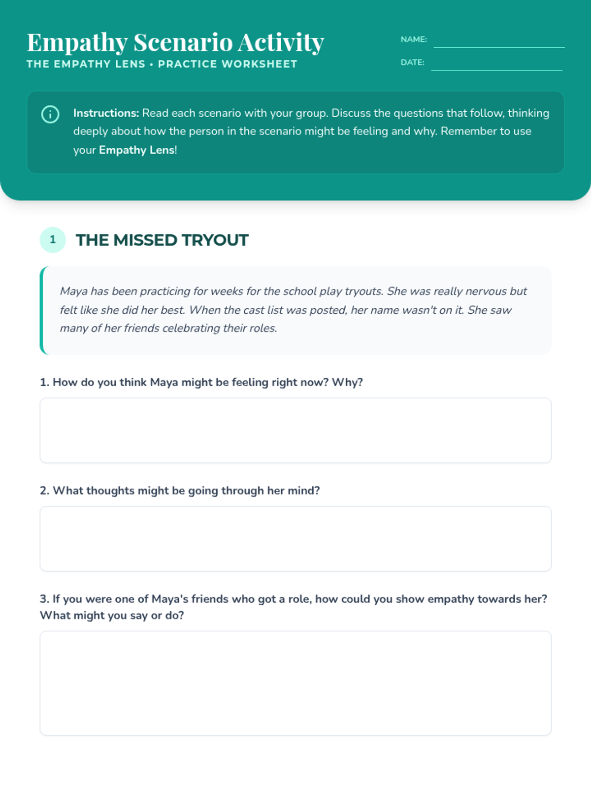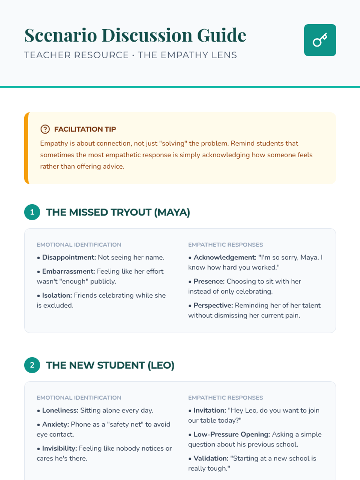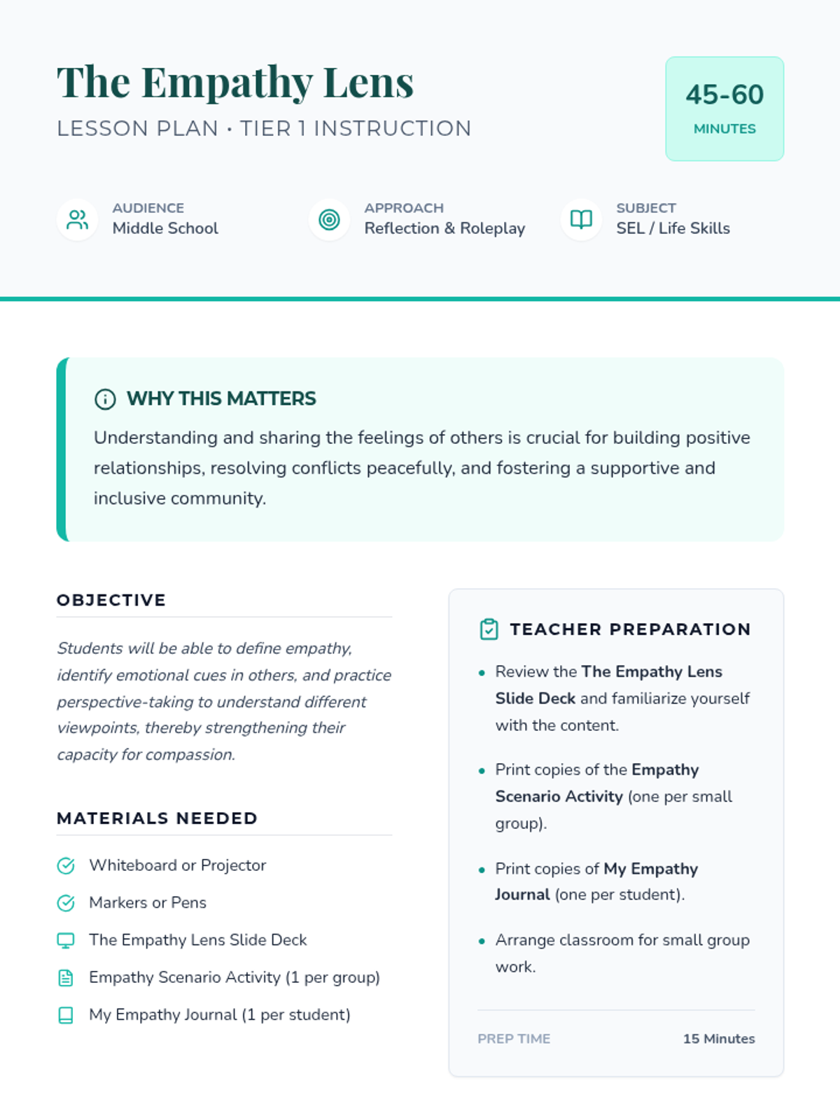 A 45-60 minute lesson designed for middle school students to cultivate empathy through storytelling, role-playing, and perspective-taking exercises. Students learn to identify emotional cues and practice seeing the world through 'The Empathy Lens'.