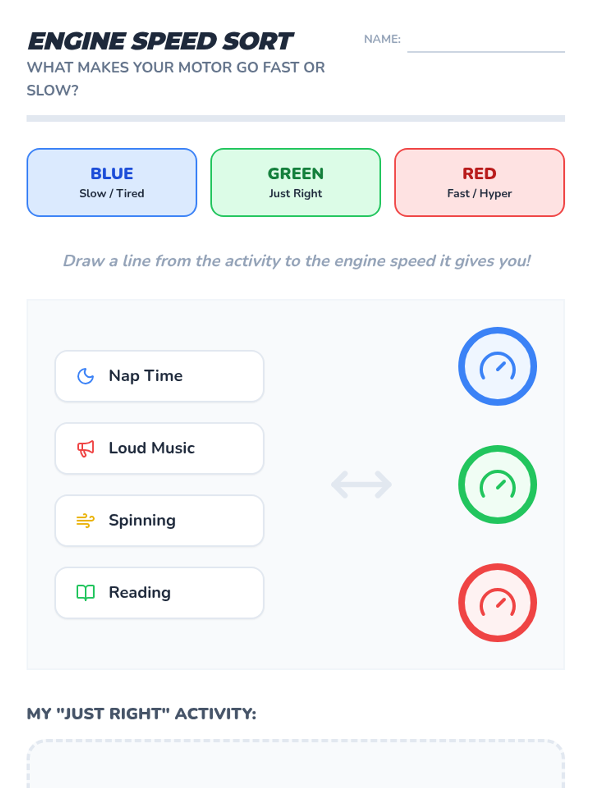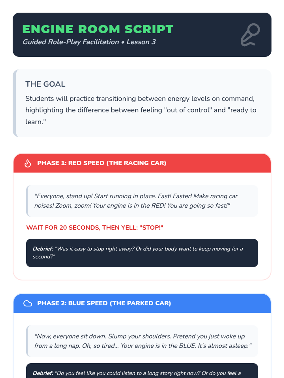 Students learn to identify their internal energy levels using the metaphor of a car engine to understand arousal states.