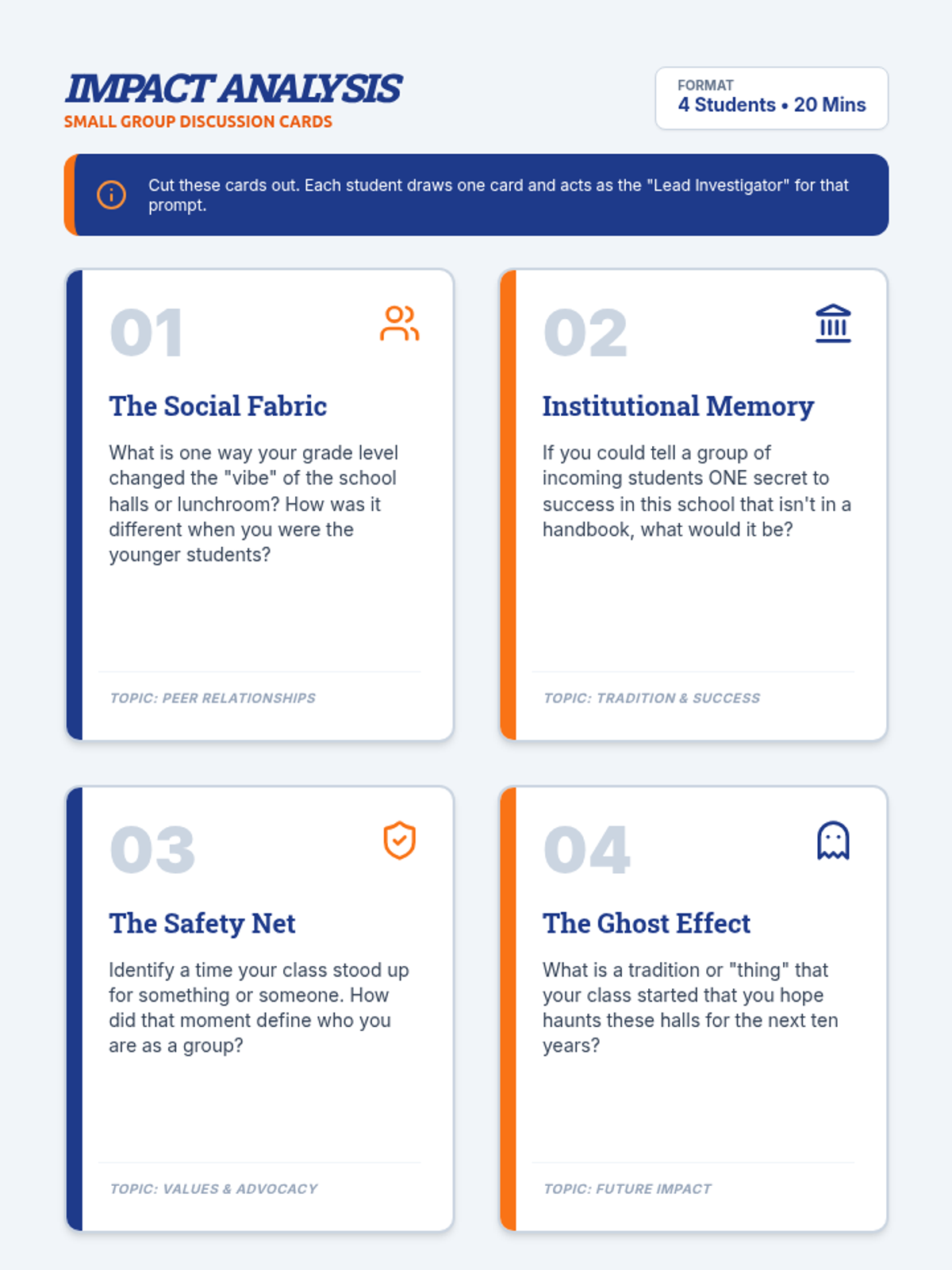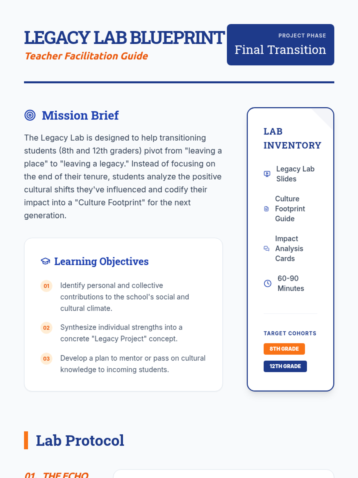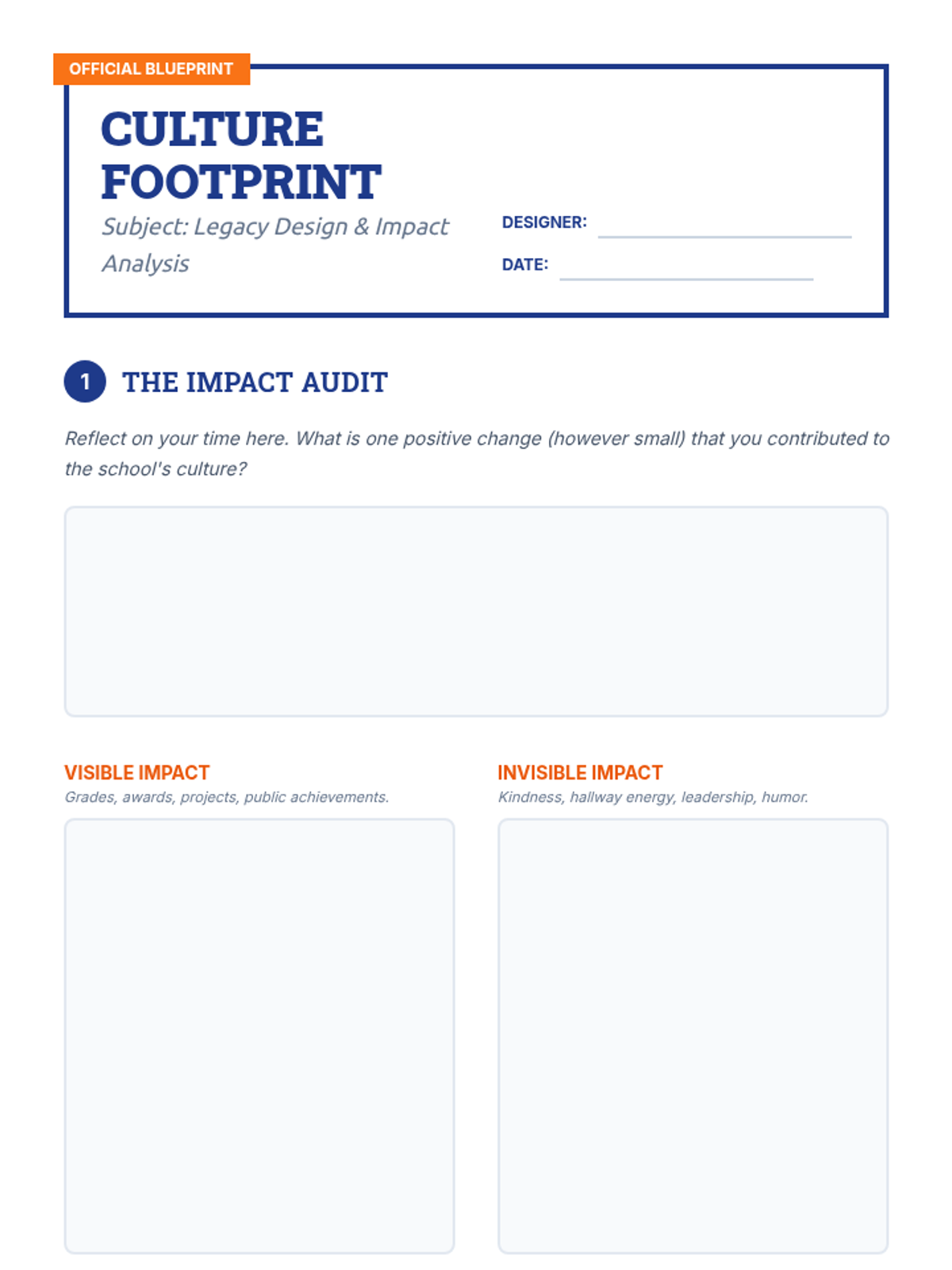 A project-based lesson for graduating cohorts (8th and 12th grade) to reflect on their impact and design a lasting cultural legacy for their school. Students analyze their contributions and create a 'Culture Footprint' to guide future students.