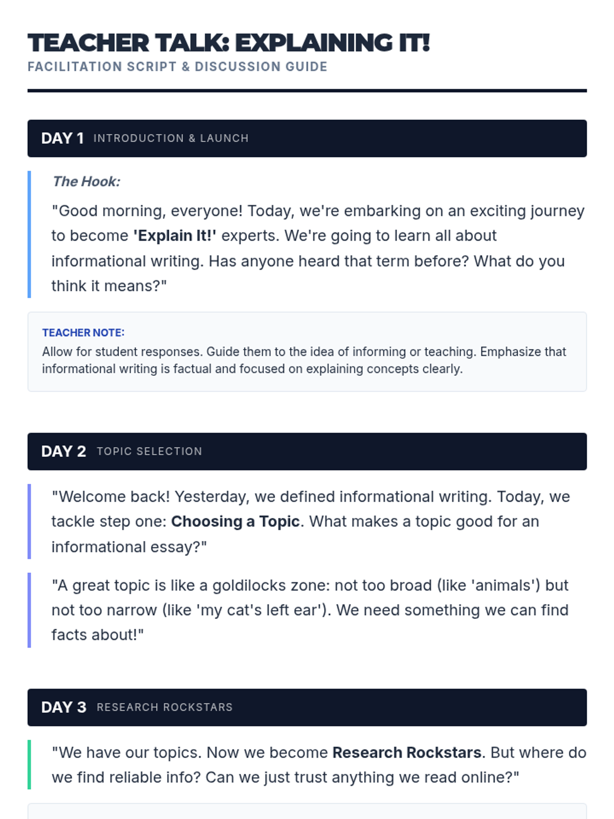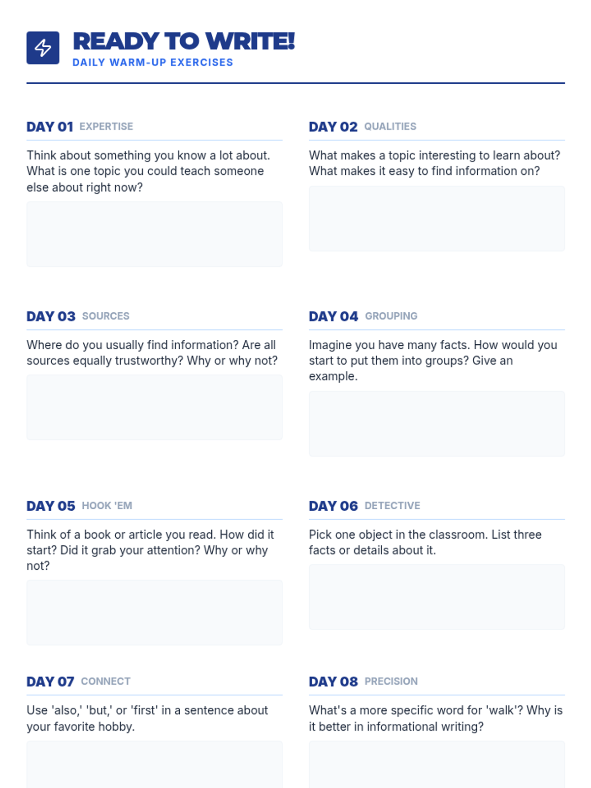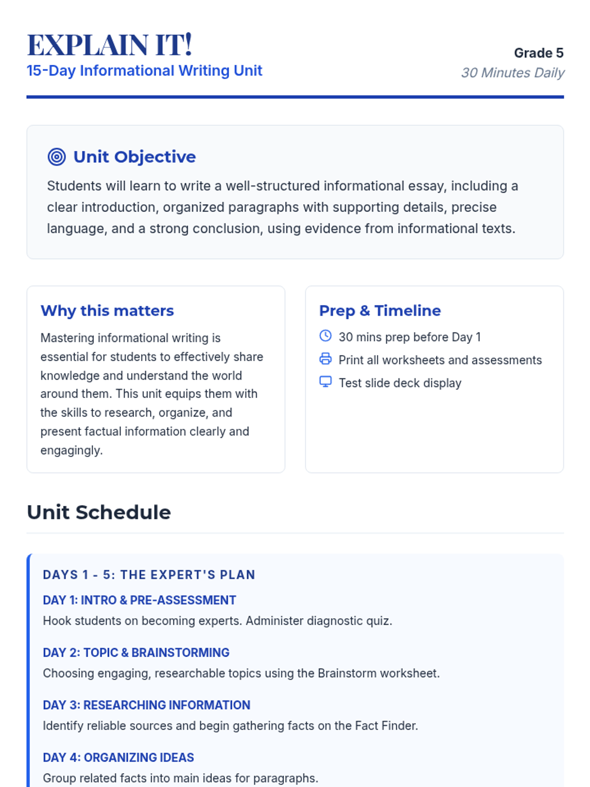 Days 1-5 focus on introducing informational writing, selecting researchable topics, gathering facts, and crafting strong hooks and introductions.