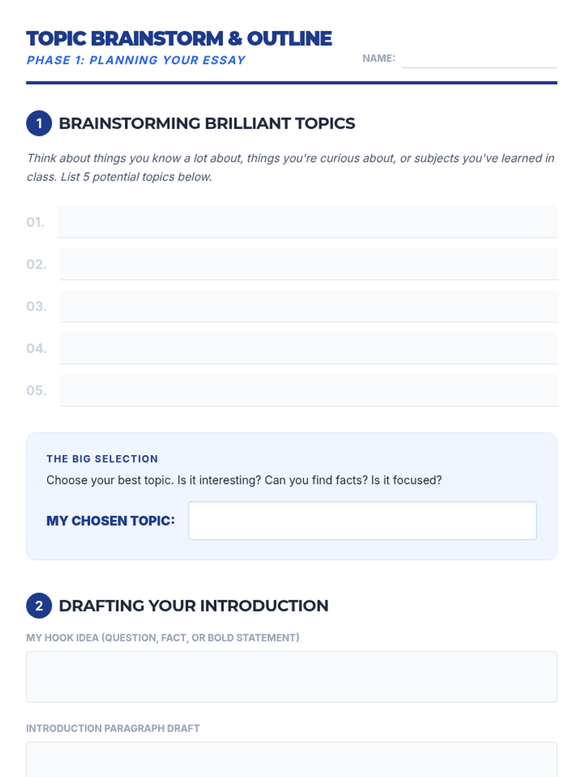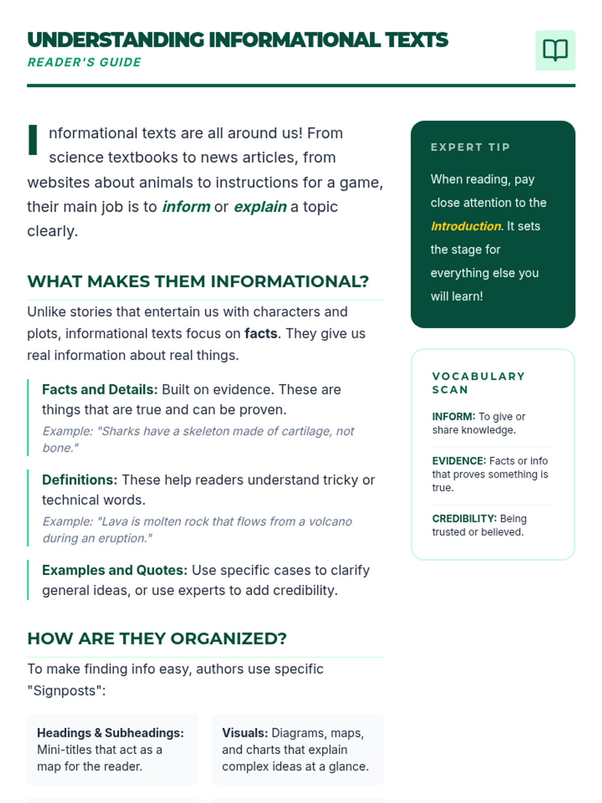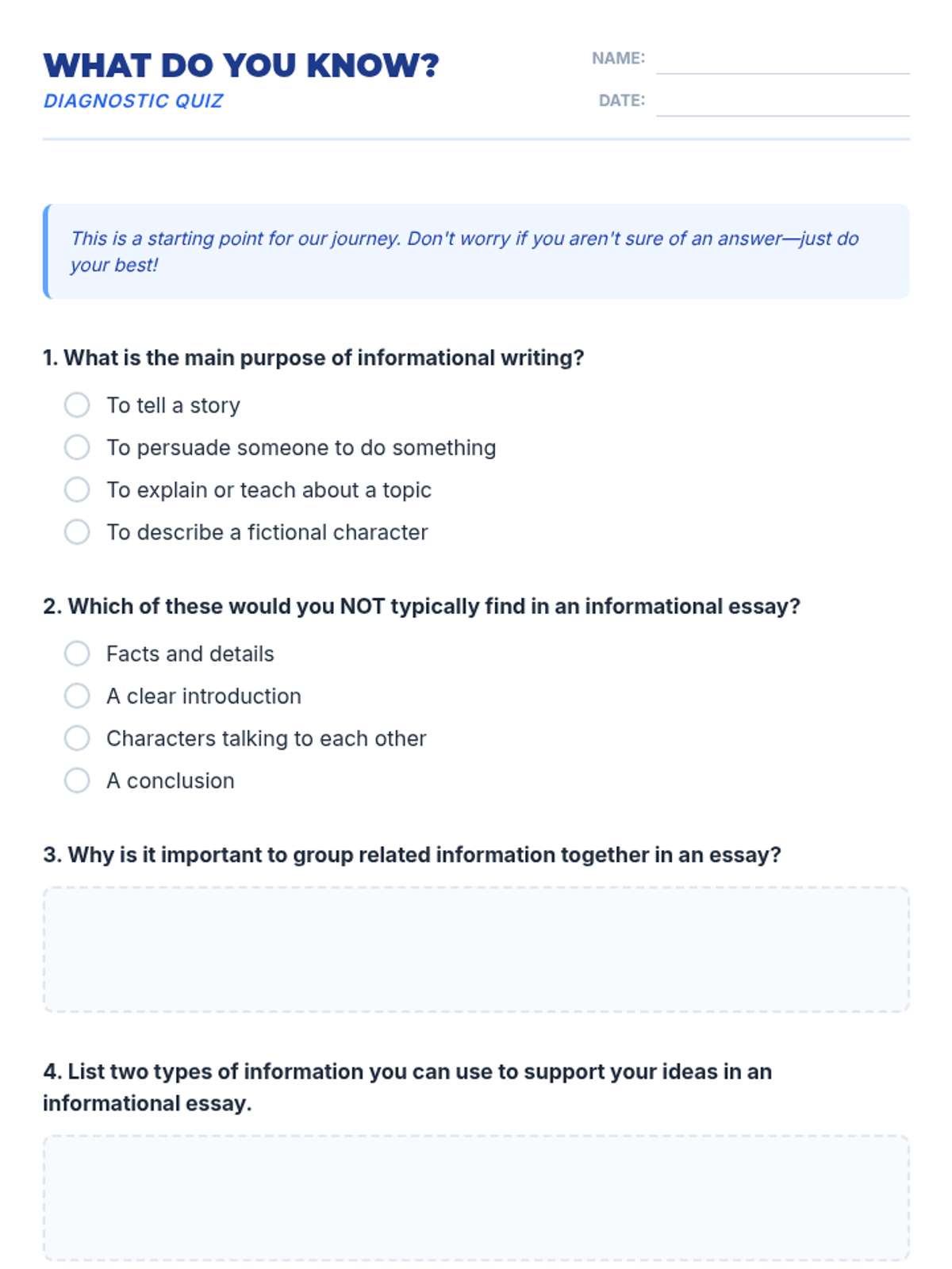 Days 1-5 focus on introducing informational writing, selecting researchable topics, gathering facts, and crafting strong hooks and introductions.