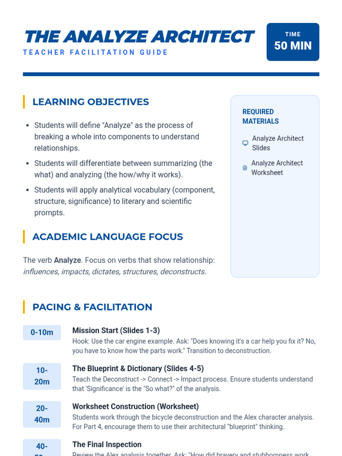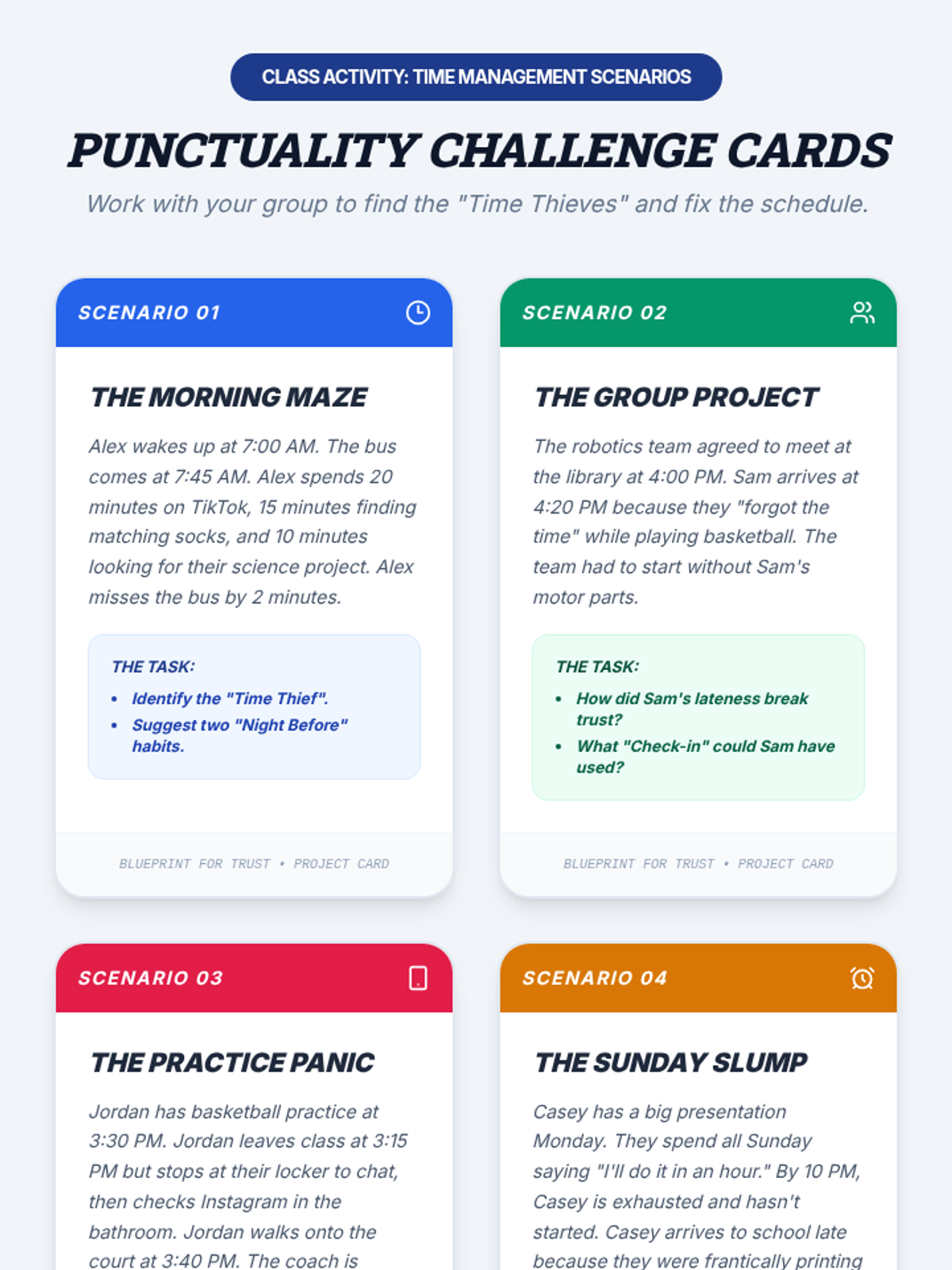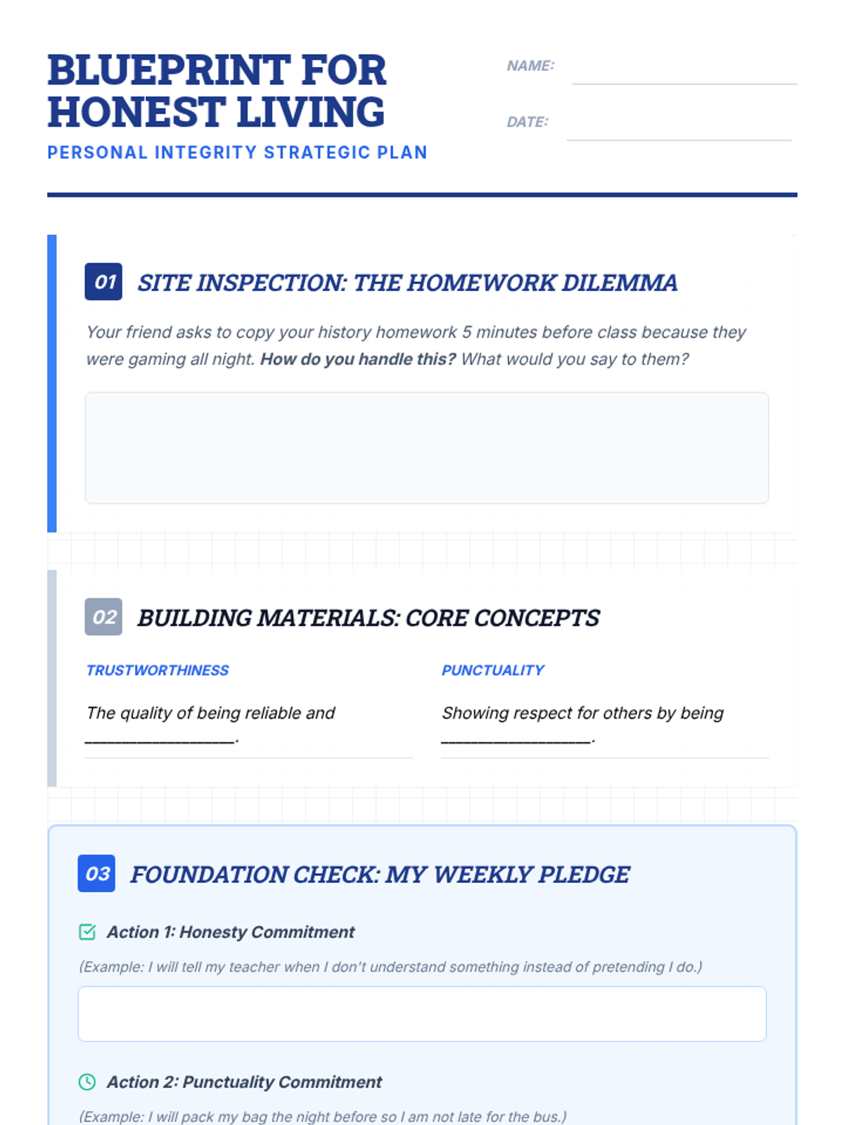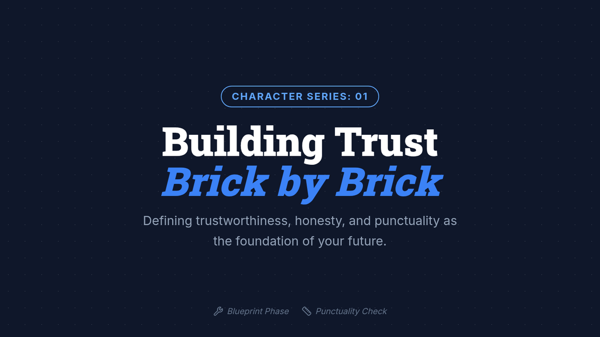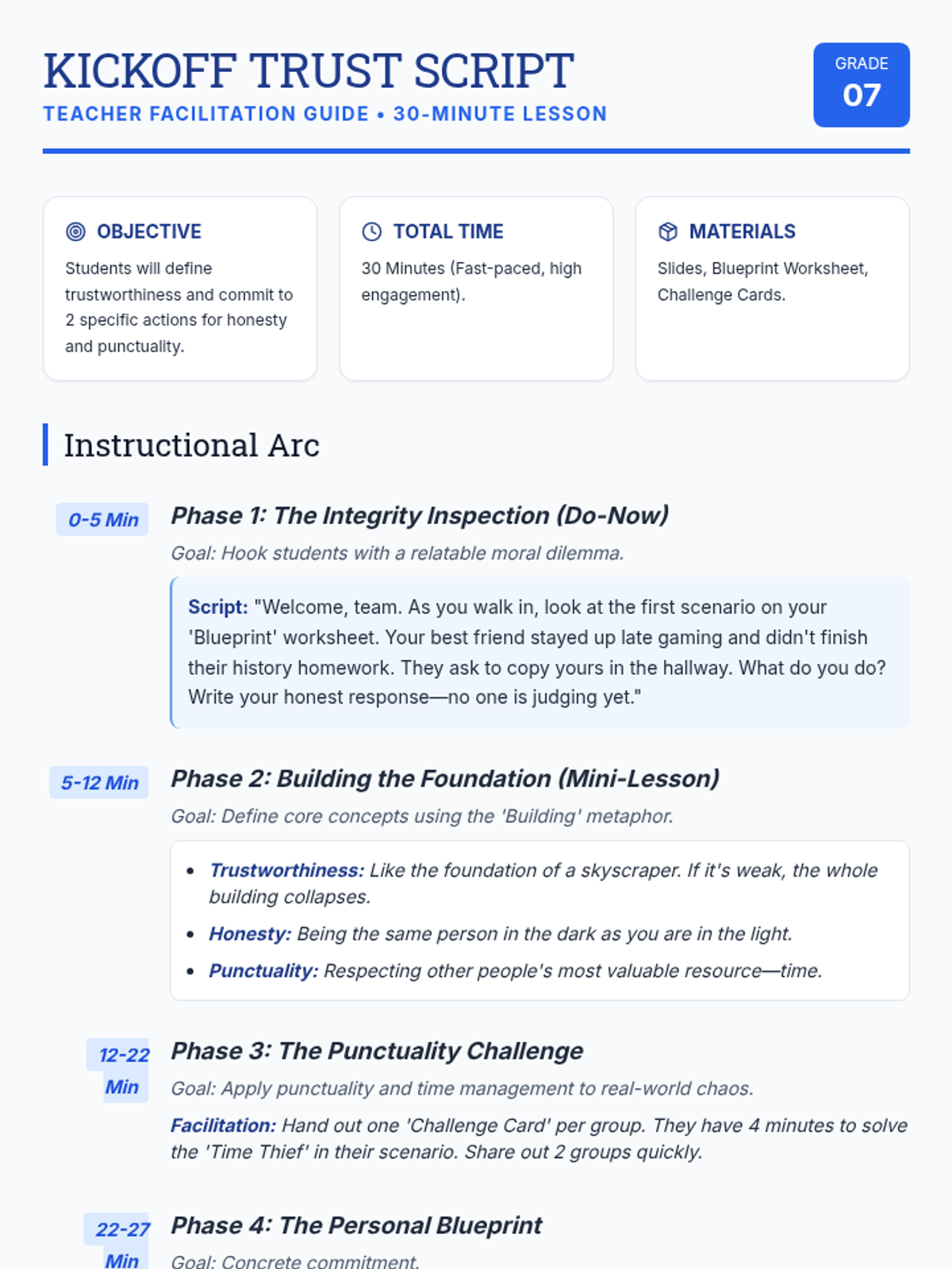 A 30-minute character education lesson for 7th graders focusing on the pillars of trustworthiness, honesty, and punctuality through an architectural 'building' metaphor. Students analyze scenarios and commit to specific personal actions to strengthen their integrity.