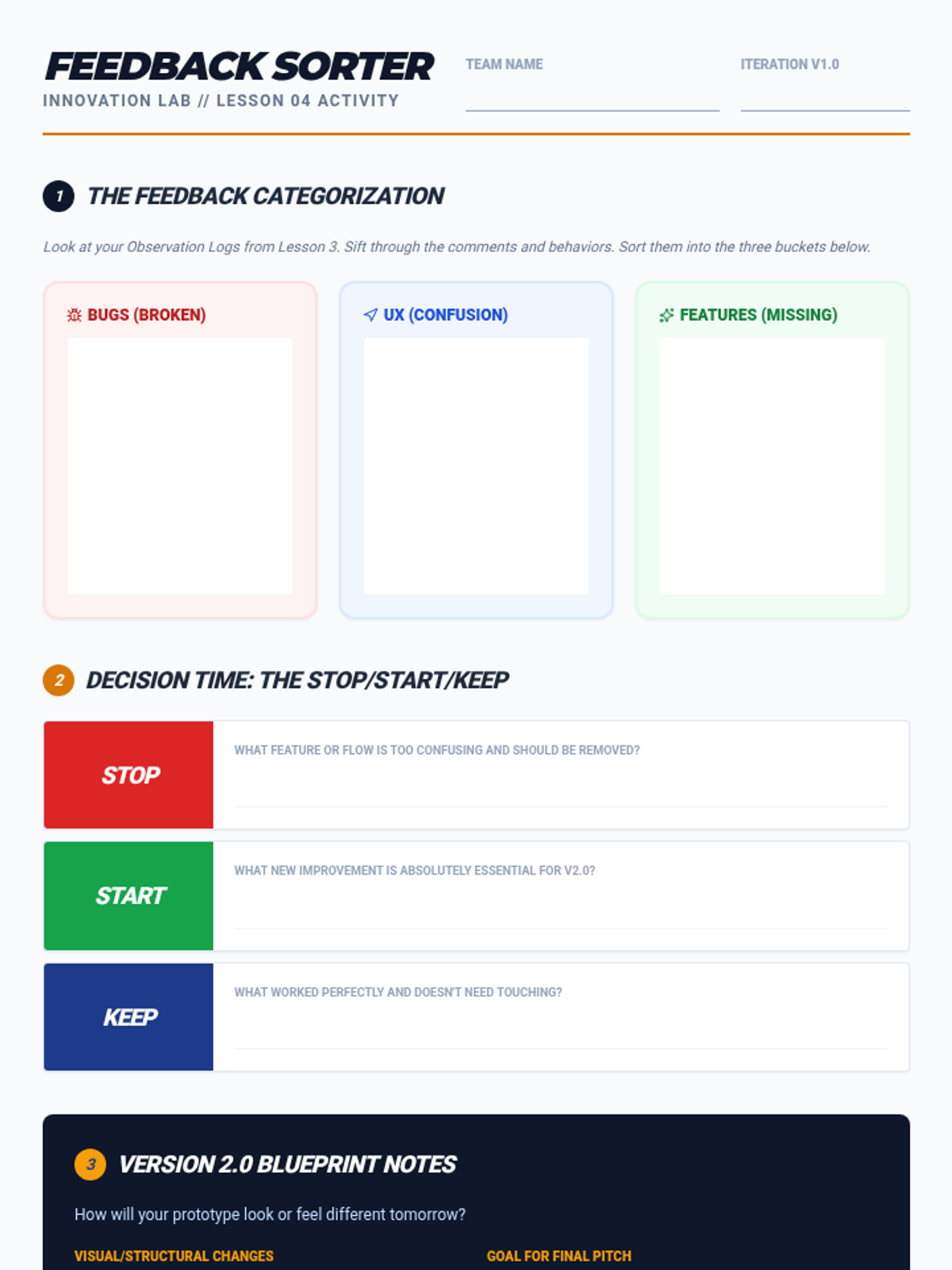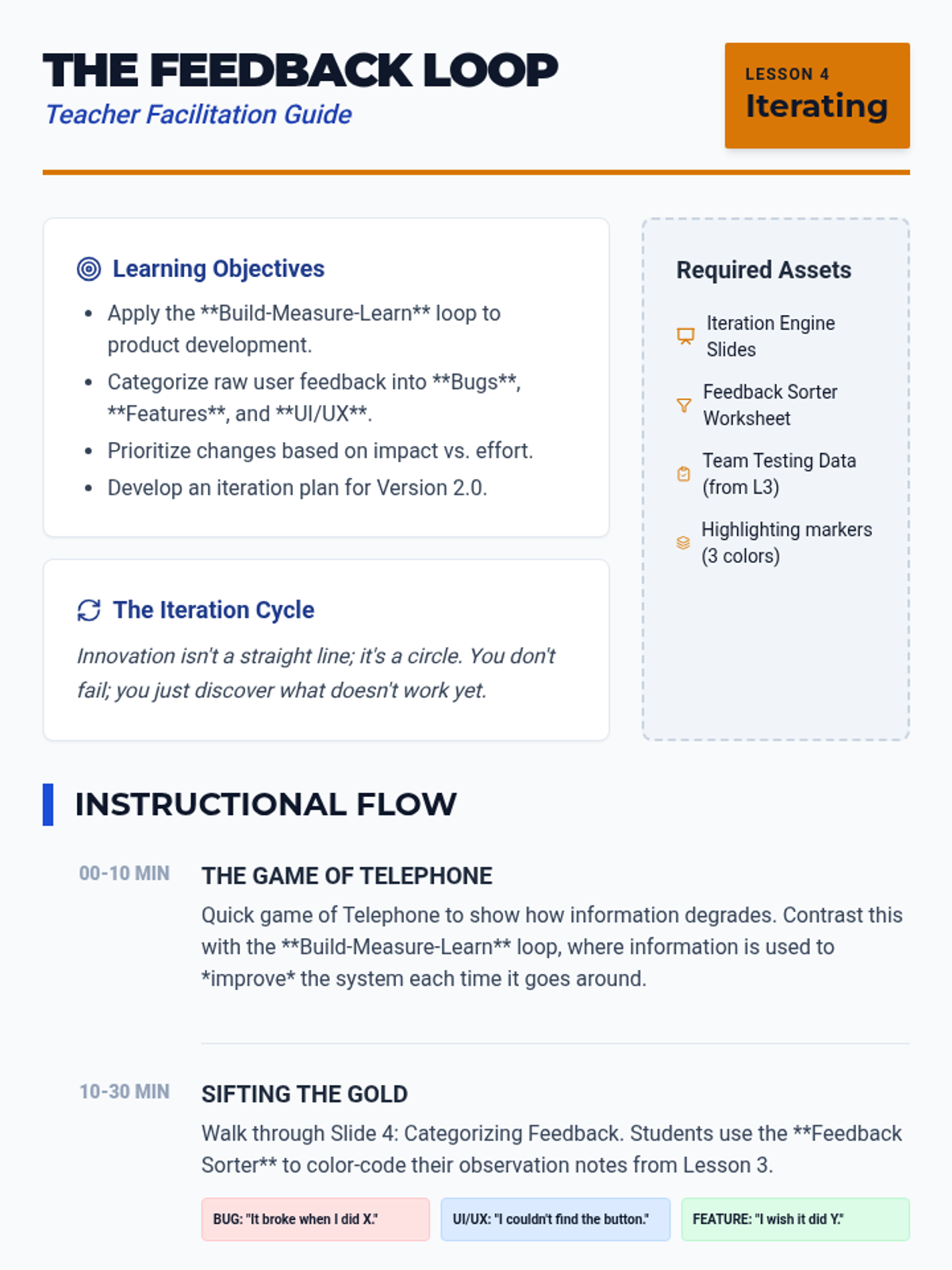 Students conduct user tests, record data, and debrief to categorize feedback into 'bugs', 'features', and 'UI/UX issues'. They plan specific changes for the next iteration of their design.