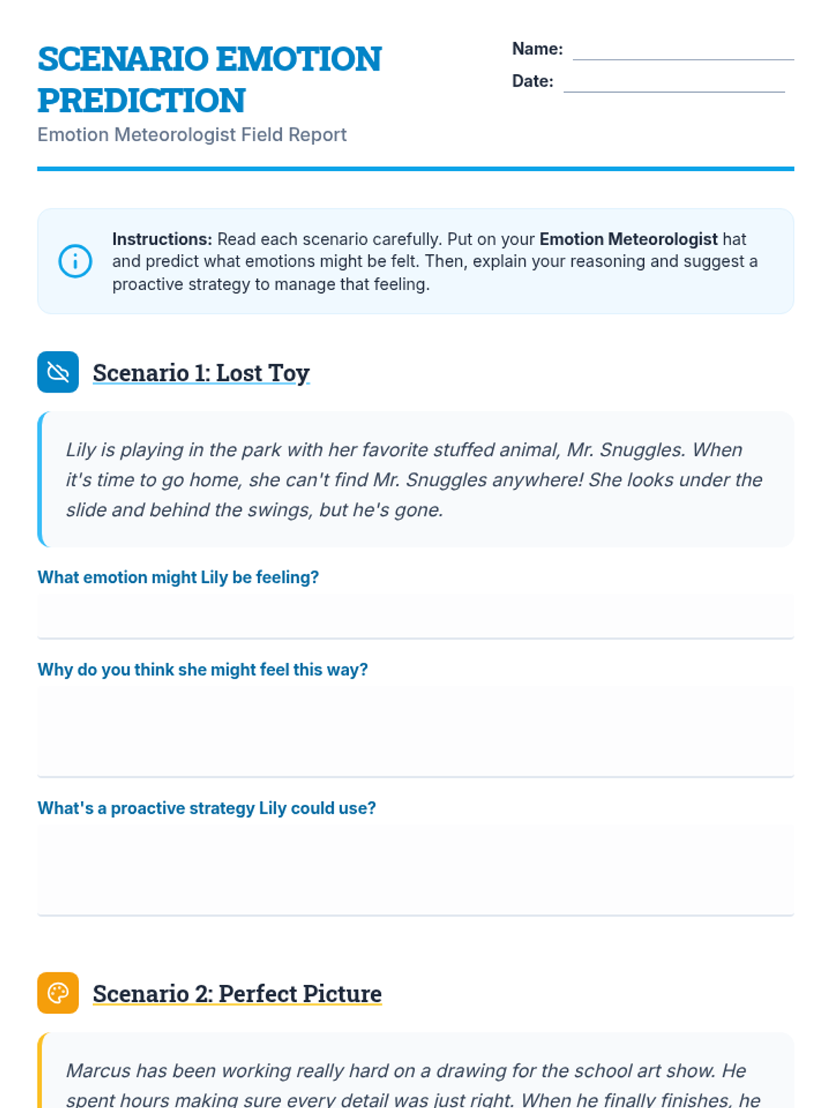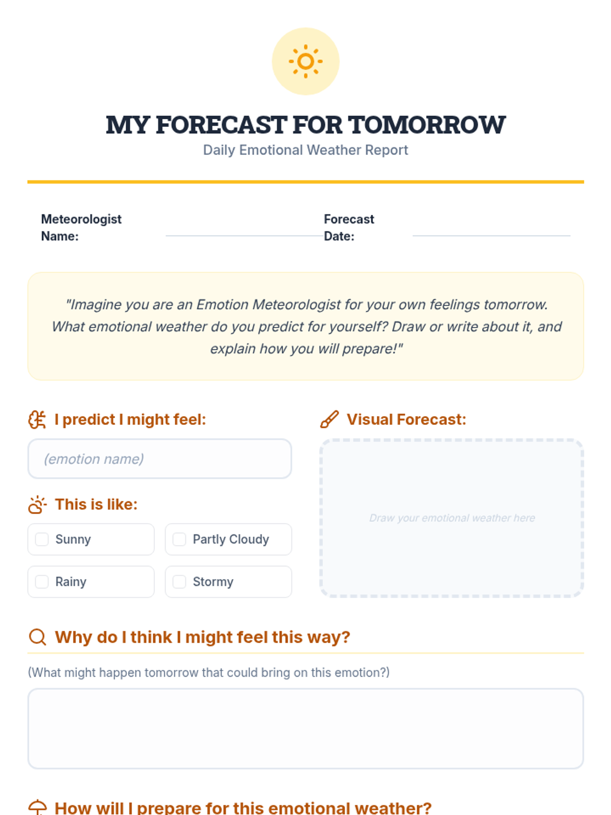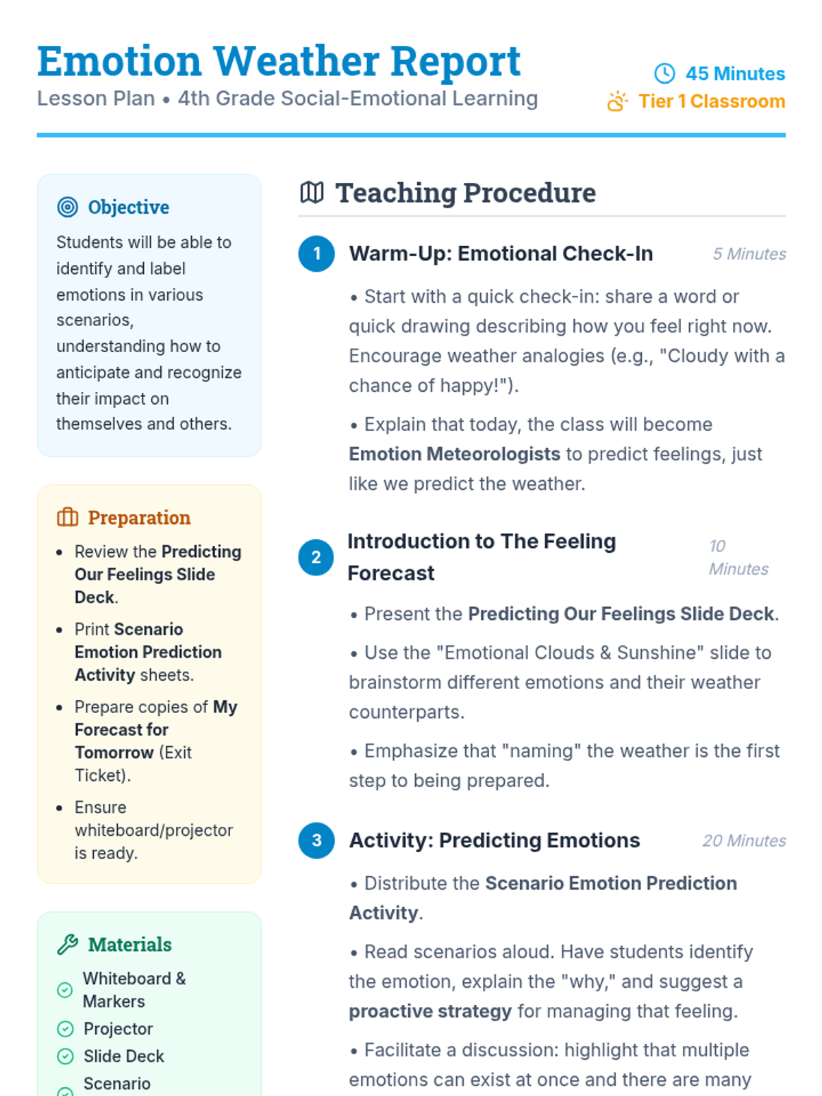 A 45-minute social-emotional learning lesson for 4th graders that uses a weather forecasting analogy to help students identify, anticipate, and manage emotions.