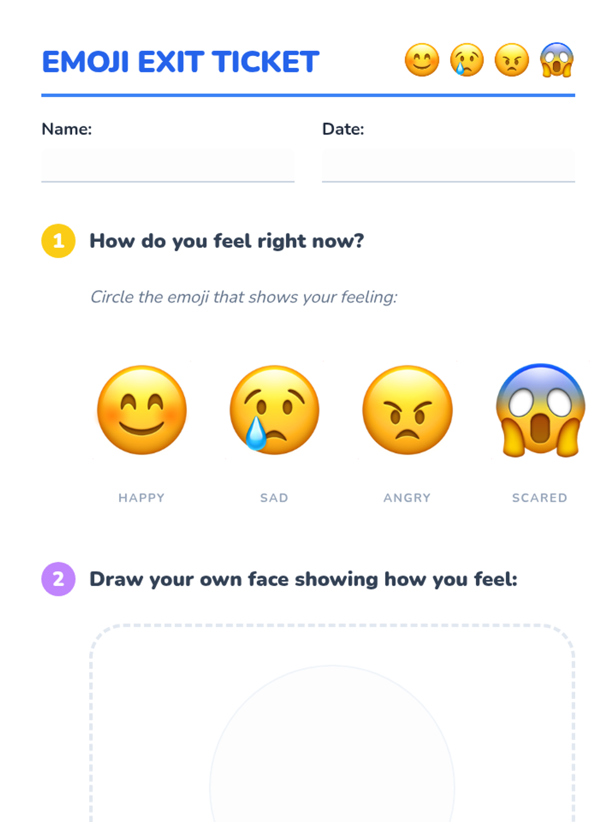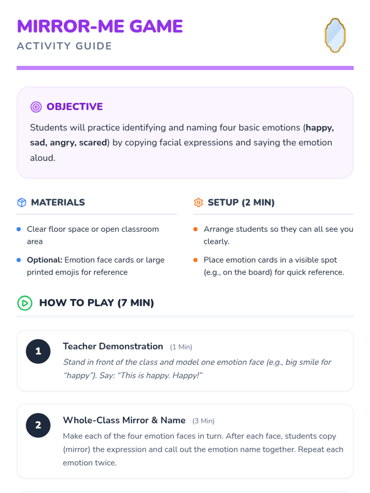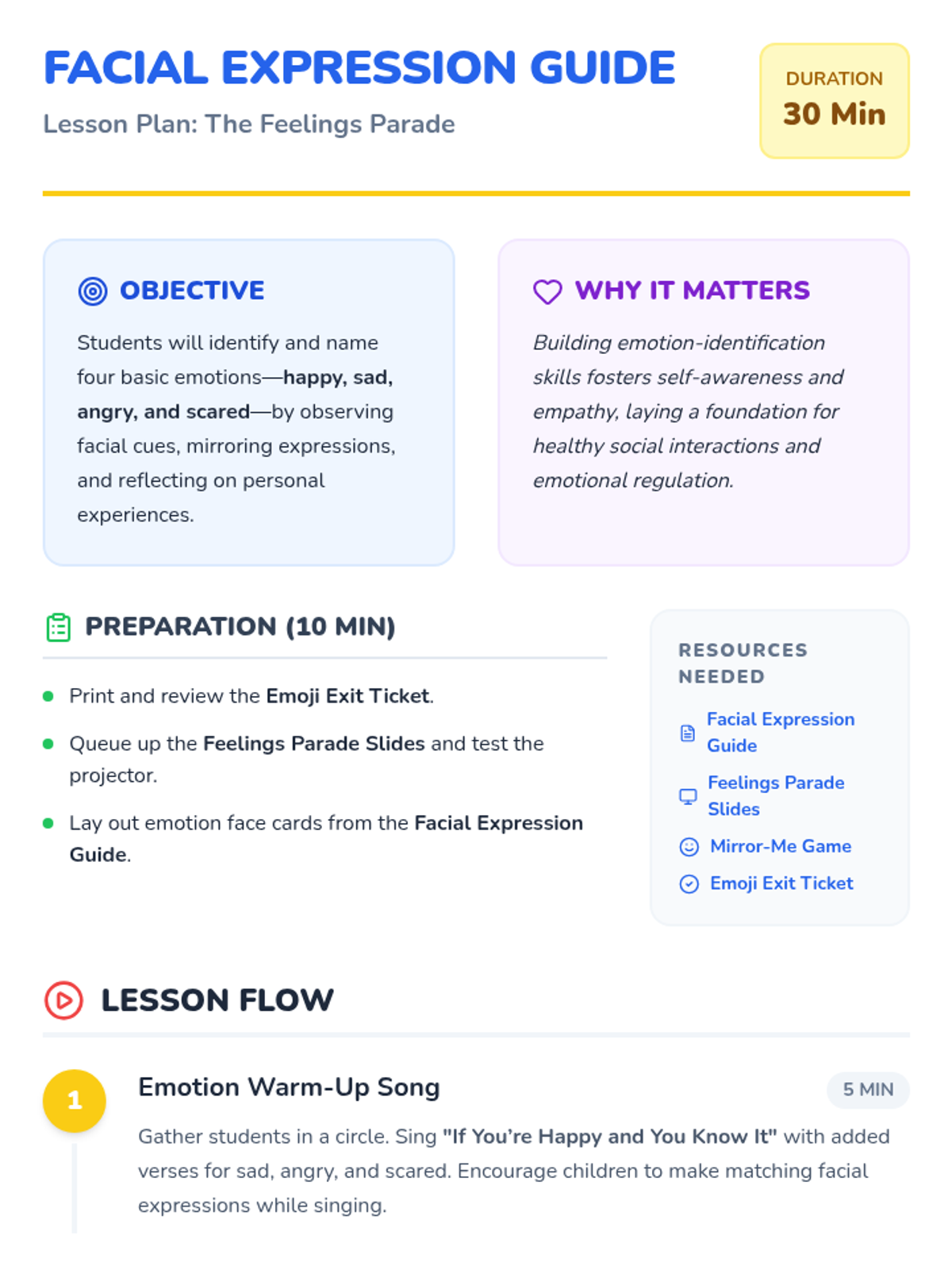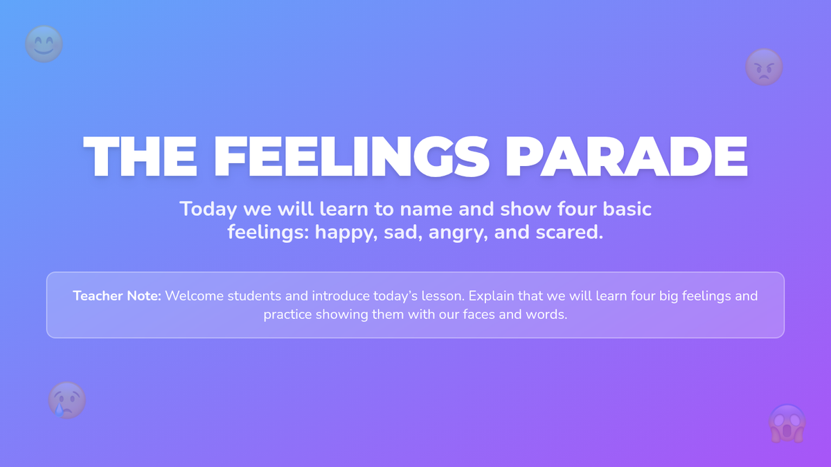 In this playful, 30-minute kindergarten lesson, students will learn to identify and name four basic emotions—happy, sad, angry, and scared—through song, modeling, and interactive activities. This foundational self-awareness skill helps children understand themselves and empathize with peers, setting the stage for emotional growth and healthy social interactions.