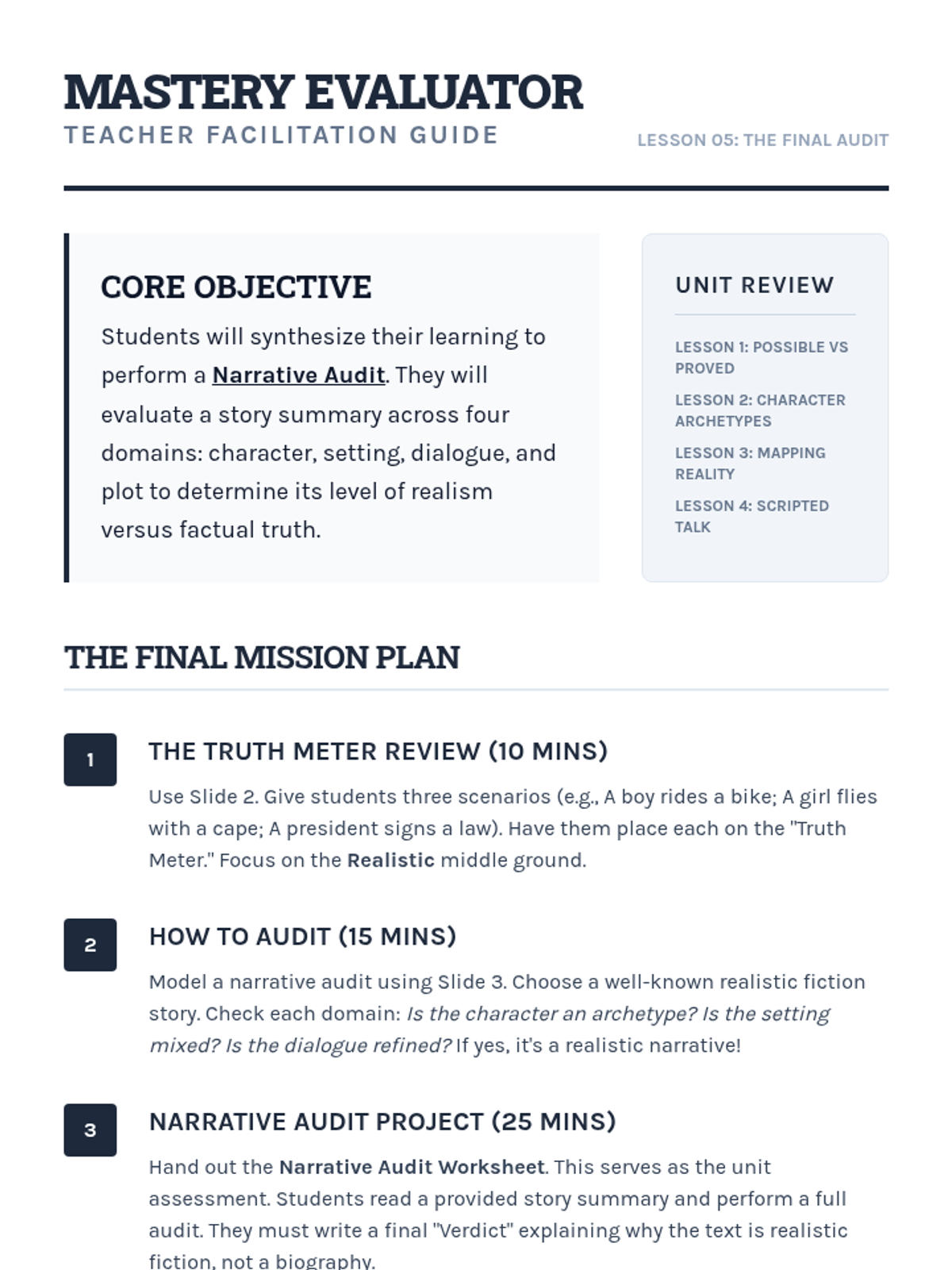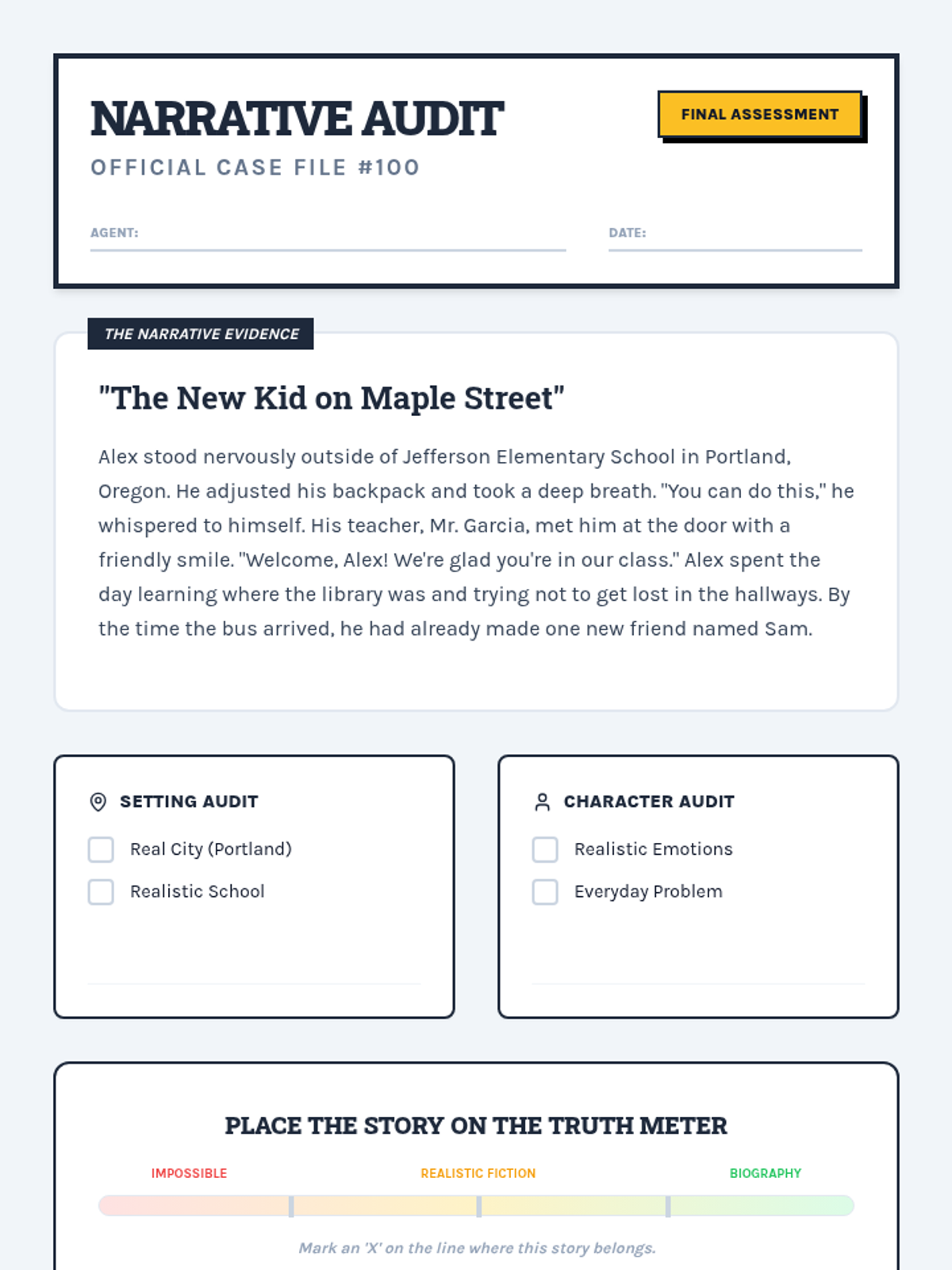 Students use a 'Truth Meter' to evaluate story elements and perform a final narrative audit to separate realistic fiction from factual reporting.