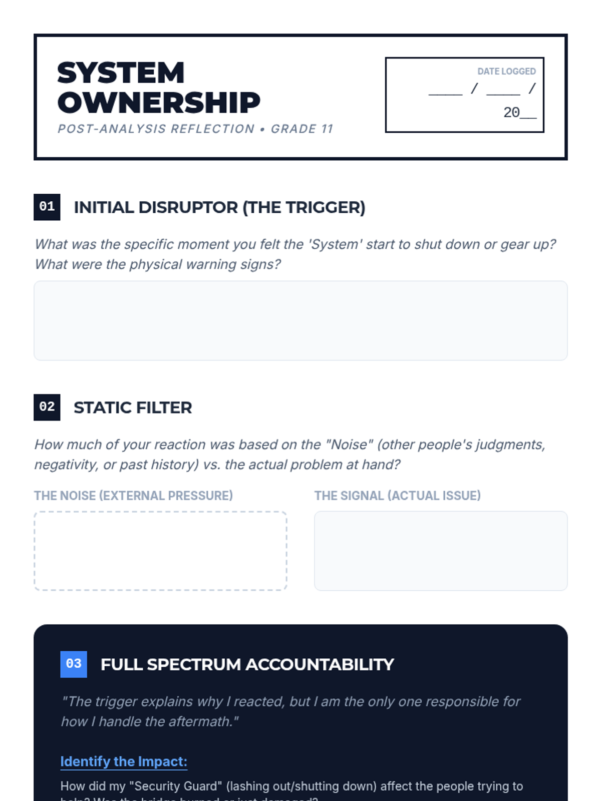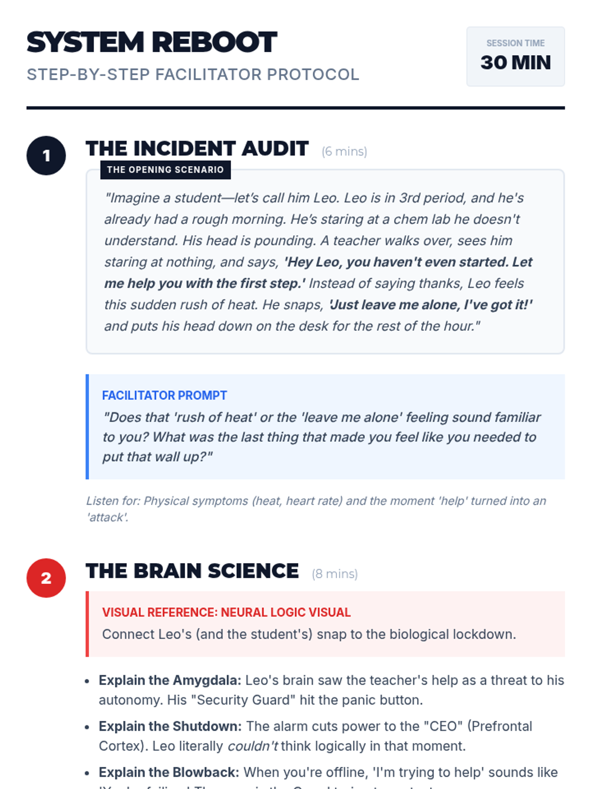 A 30-minute one-to-one discussion lesson designed for 11th-grade students, focusing on the neurobiology of lashing out, the mechanics of shutting down, and the path to personal accountability.