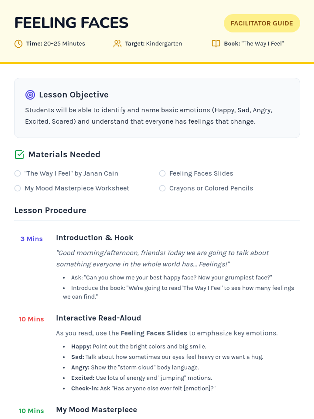 A 20-25 minute social-emotional learning lesson for kindergarten based on "The Way I Feel" by Janan Cain, focusing on identifying and normalizing basic emotions.