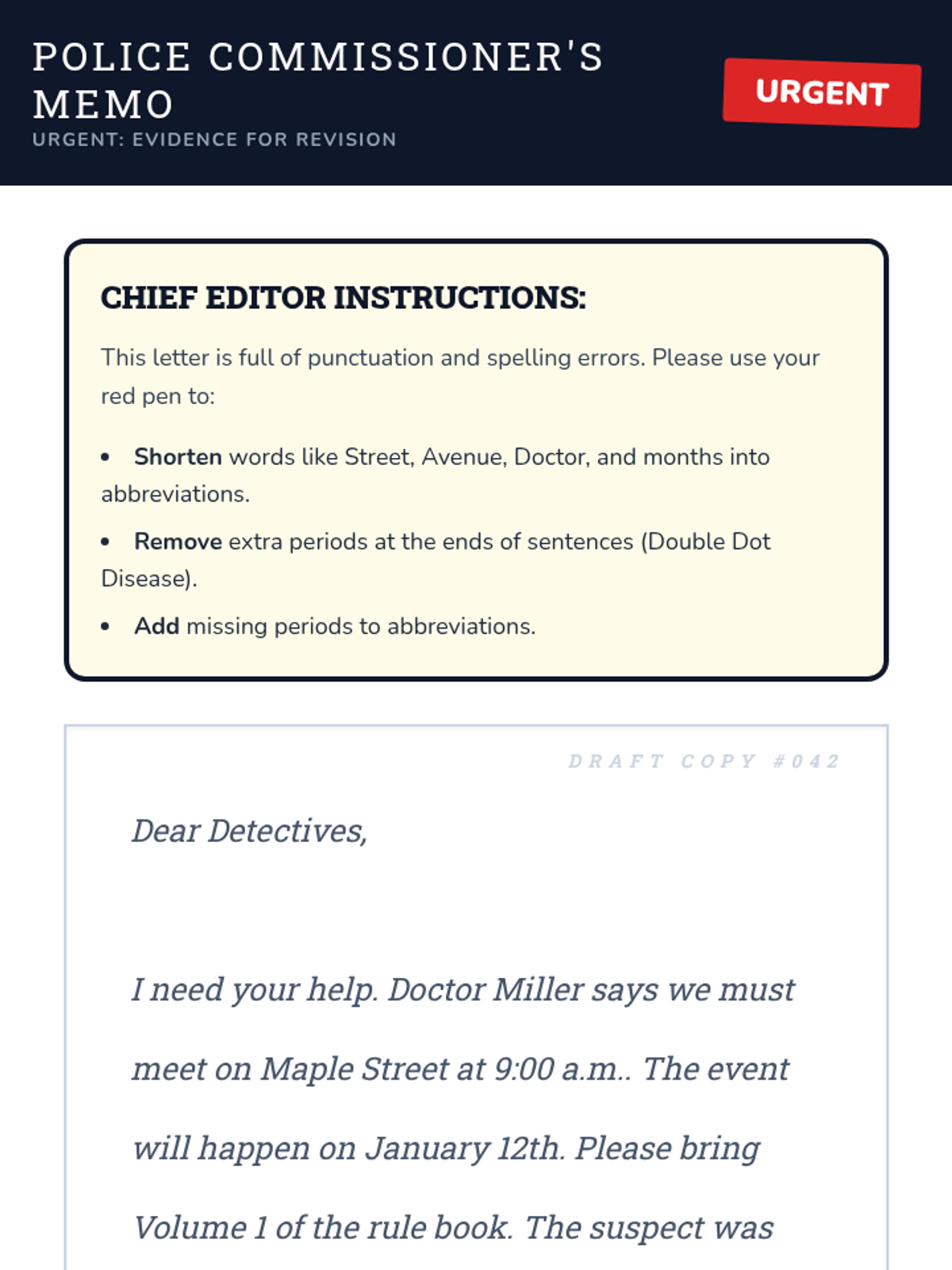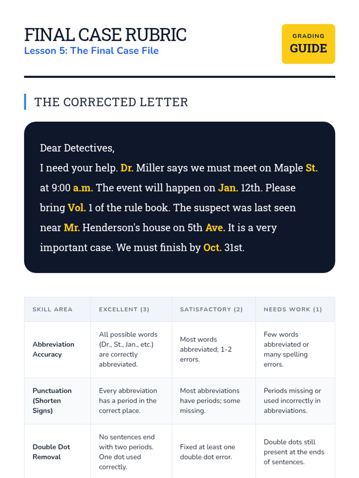 The cumulative assessment where students edit a 'Letter from the Commissioner' to correct abbreviation and punctuation errors.