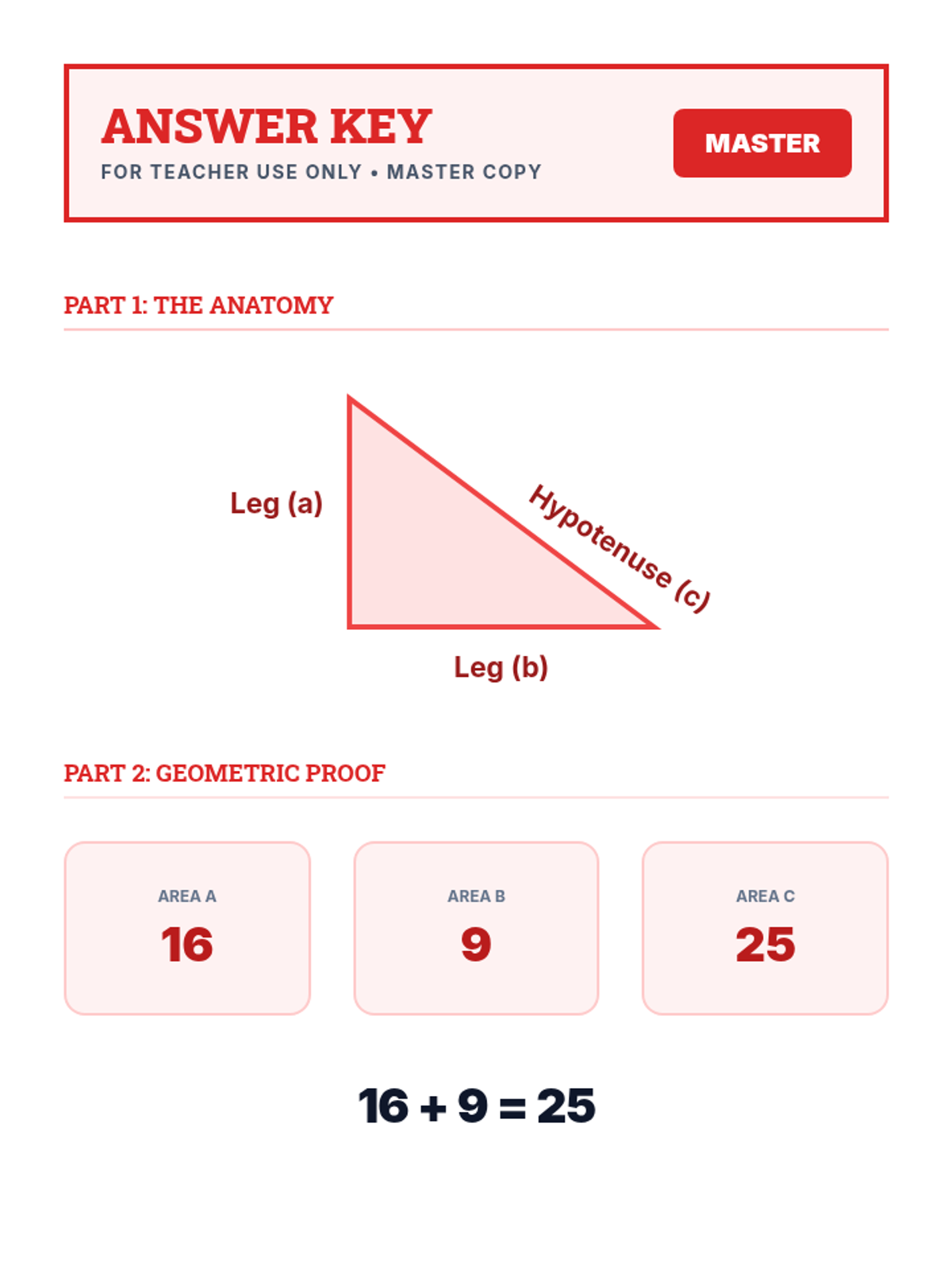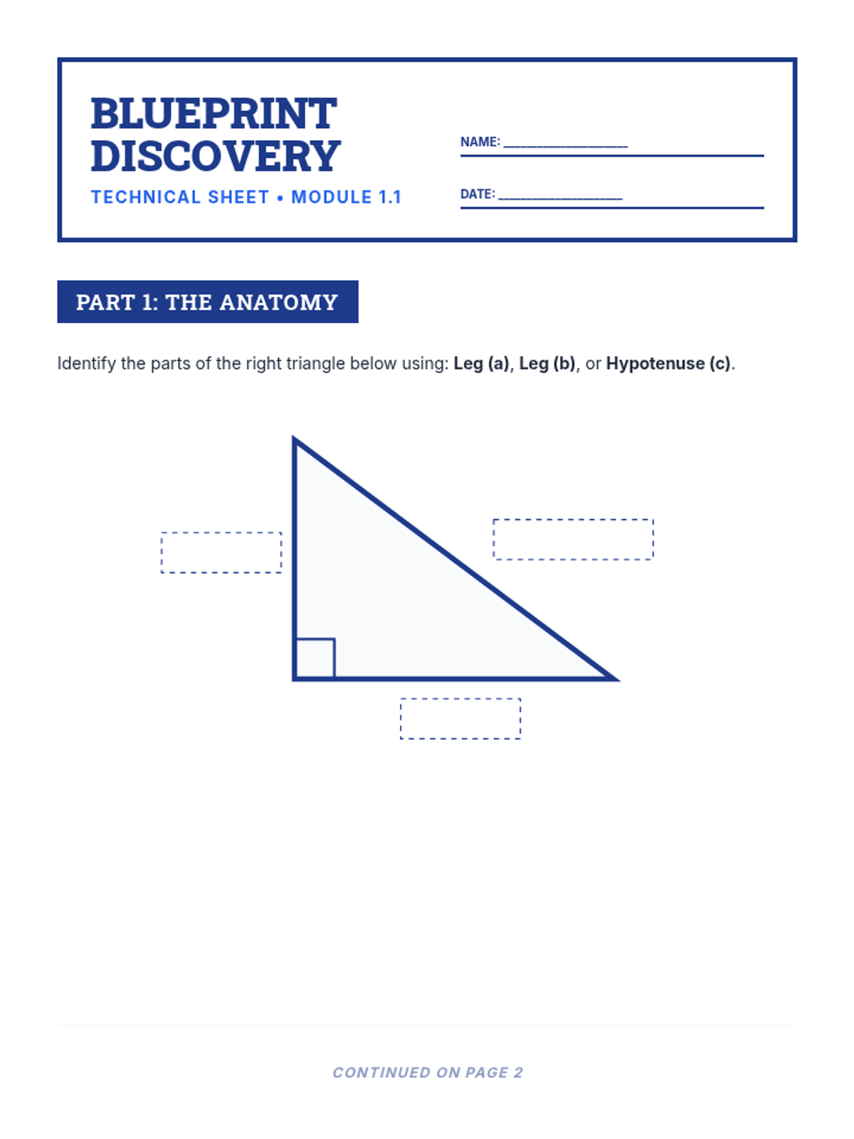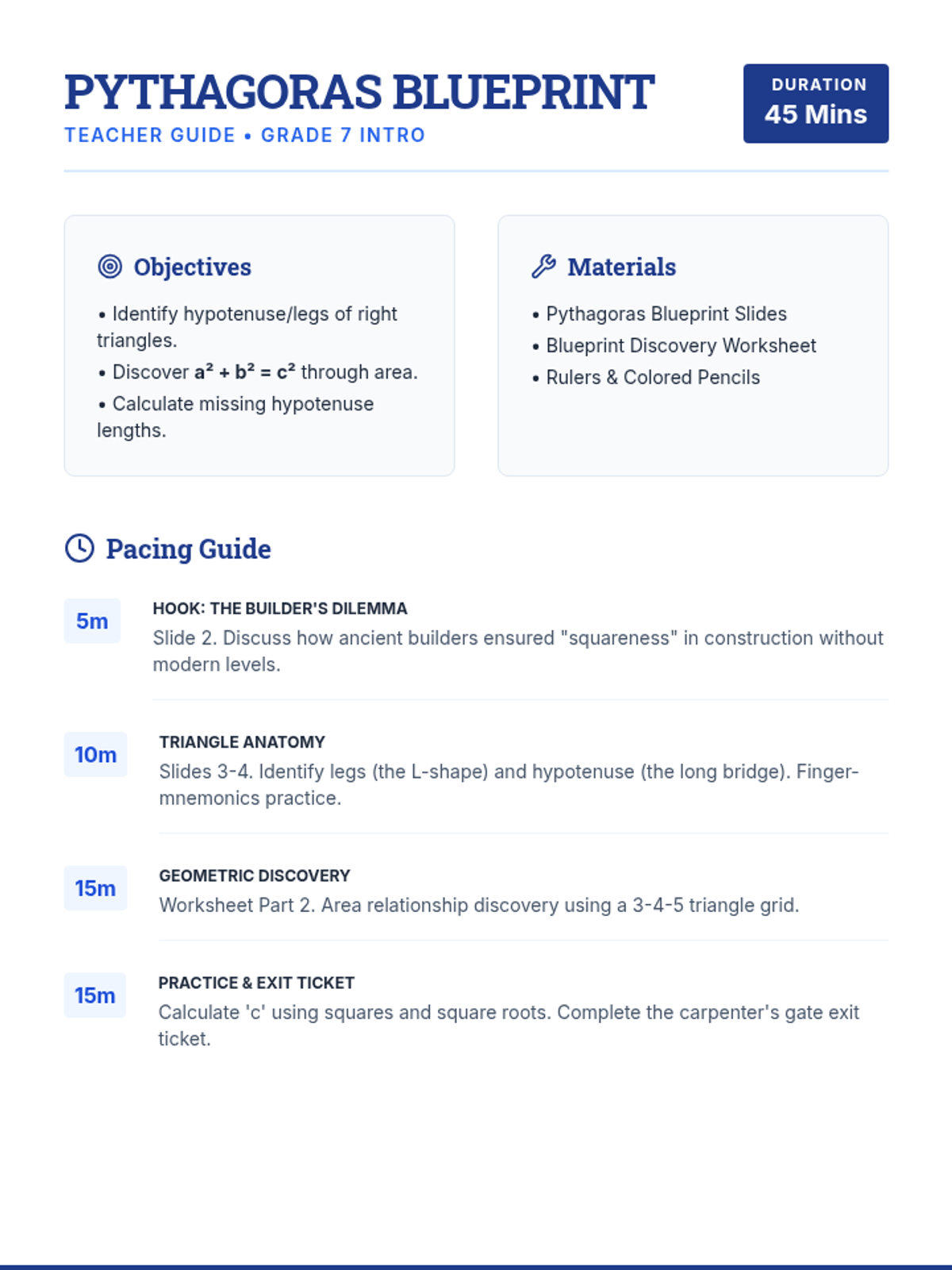 A 45-minute introductory lesson to the Pythagorean Theorem for 7th grade, focusing on identifying triangle parts and discovering the fundamental relationship between side lengths.