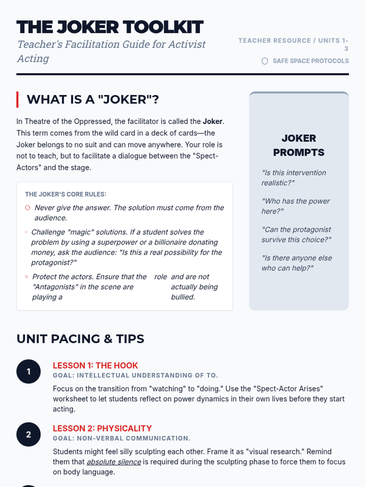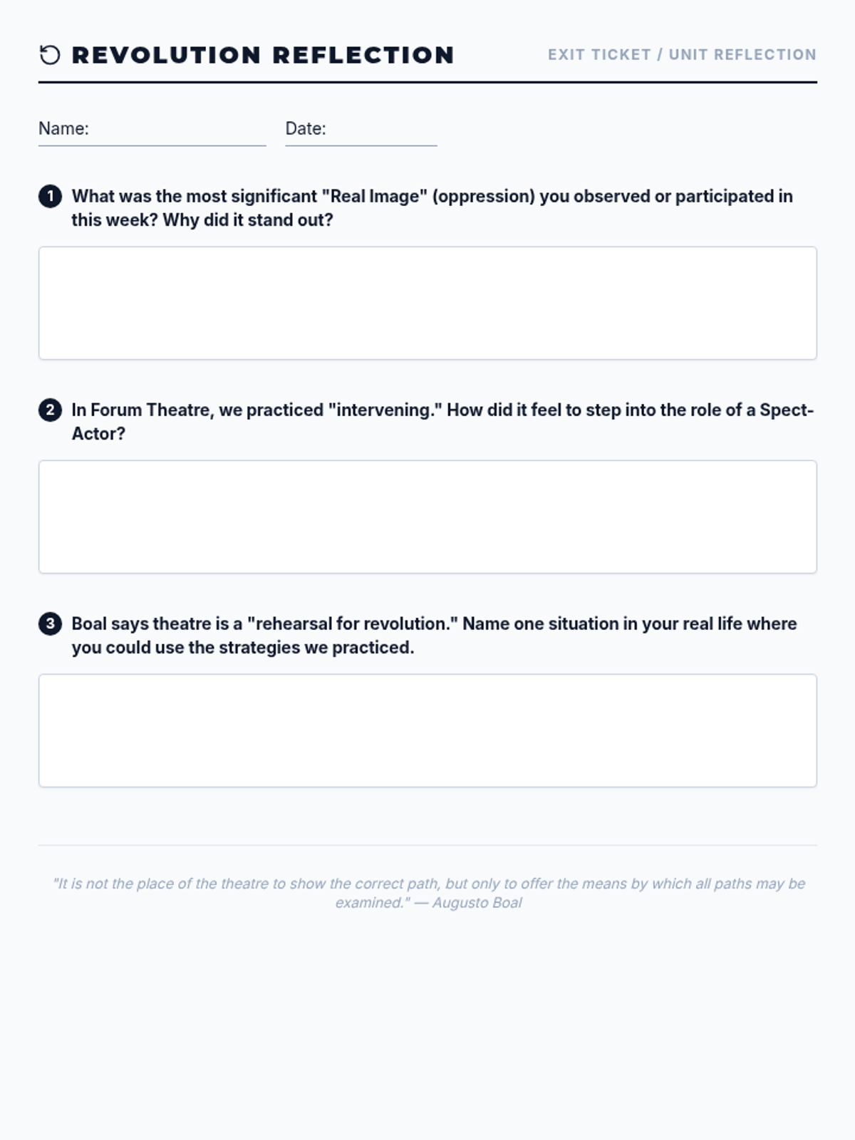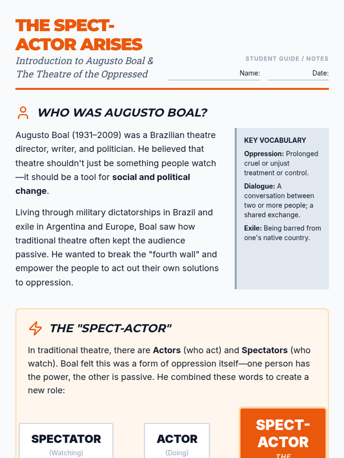 An introduction to Augusto Boal, the origins of Theatre of the Oppressed, and the transformative concept of the 'spect-actor'.