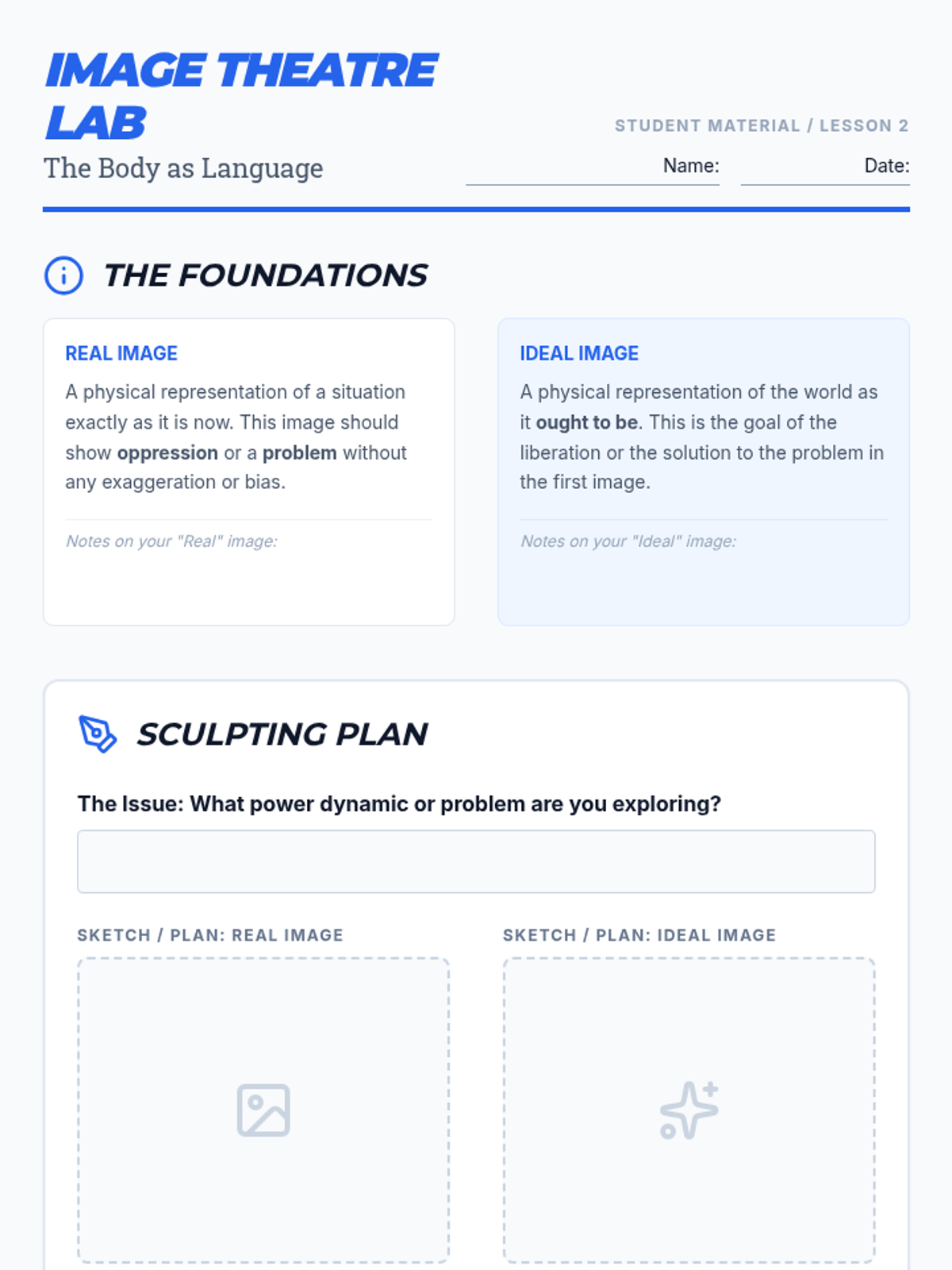 Deep dive into Image Theatre techniques, using the body as a language to explore internal and external oppressions.