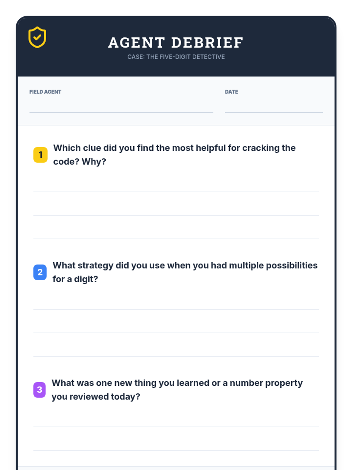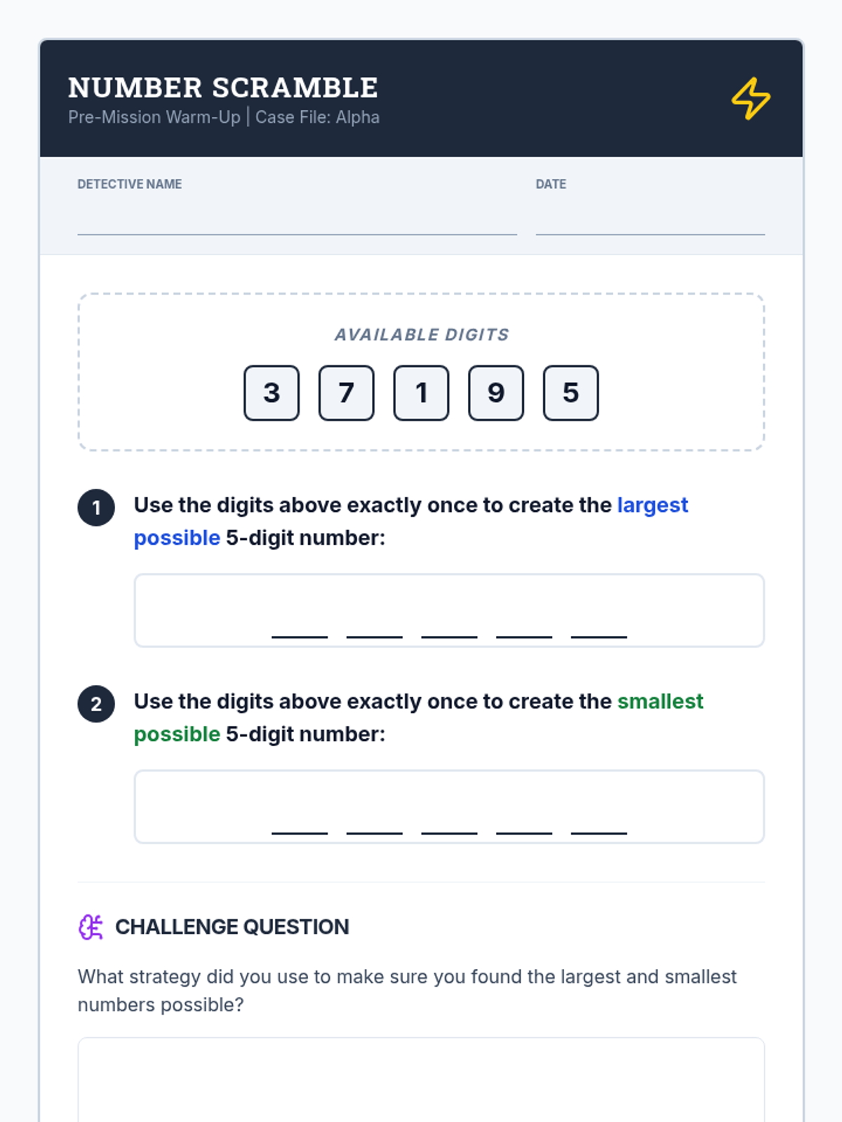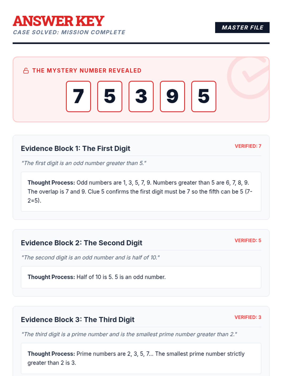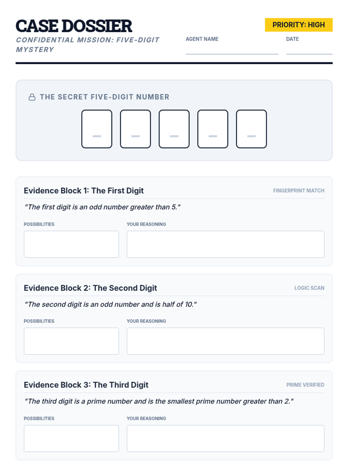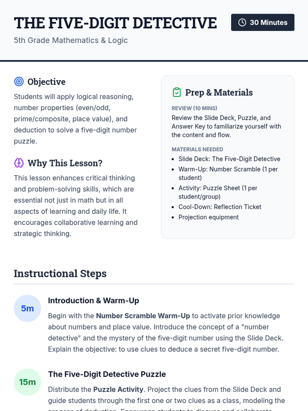 A logical reasoning lesson where students act as number detectives to solve a 5-digit mystery puzzle using place value and number property clues.