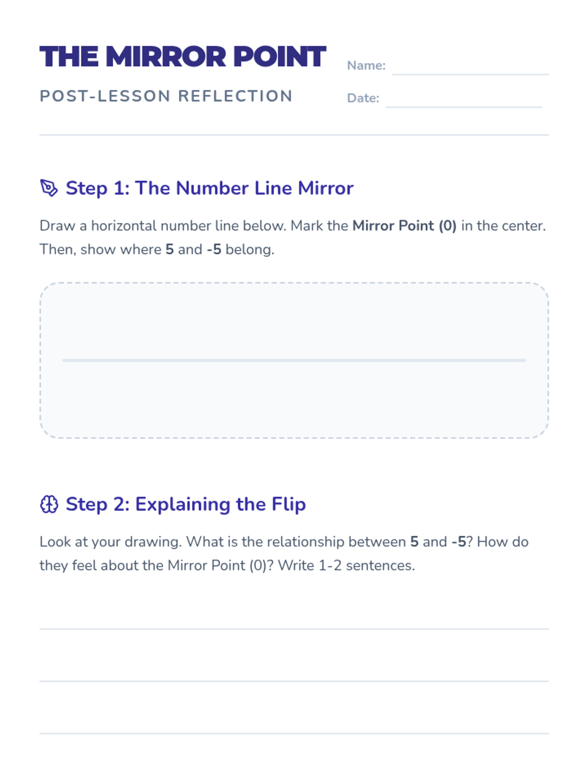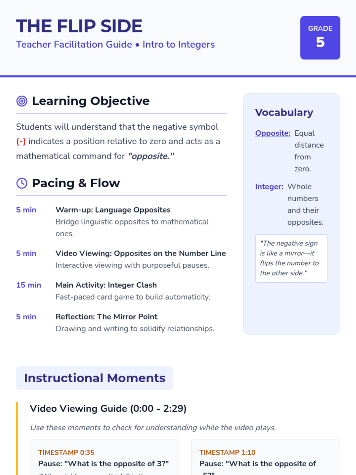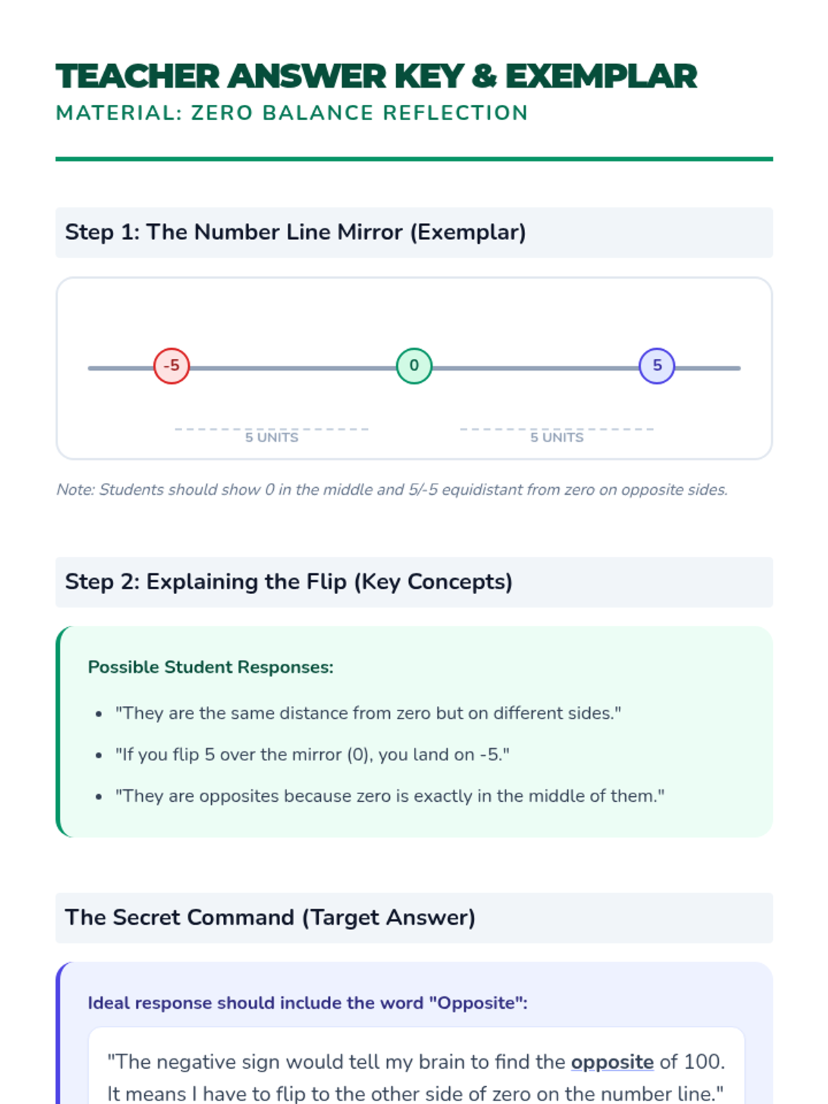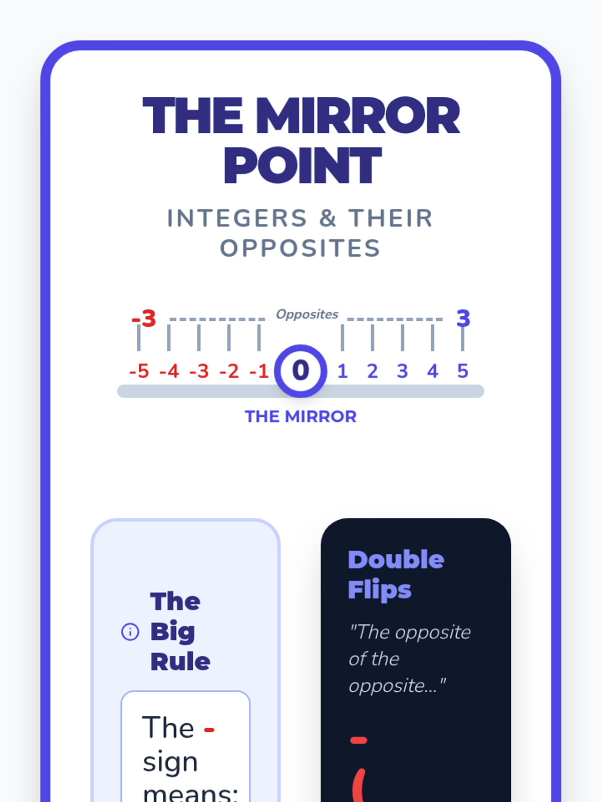 A foundational introduction to integers where students discover that the negative sign is a mathematical command for 'opposite.' Through visual number lines, card games, and reflective drawing, students explore how numbers mirror each other across the balance point of zero.