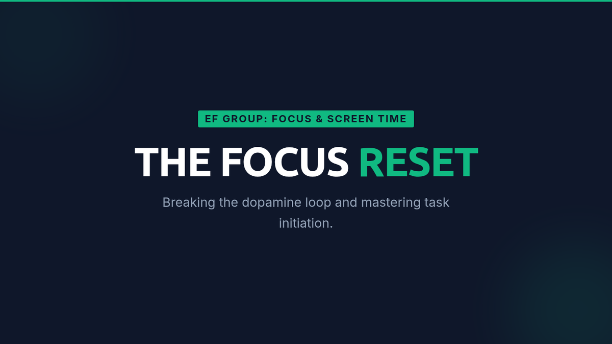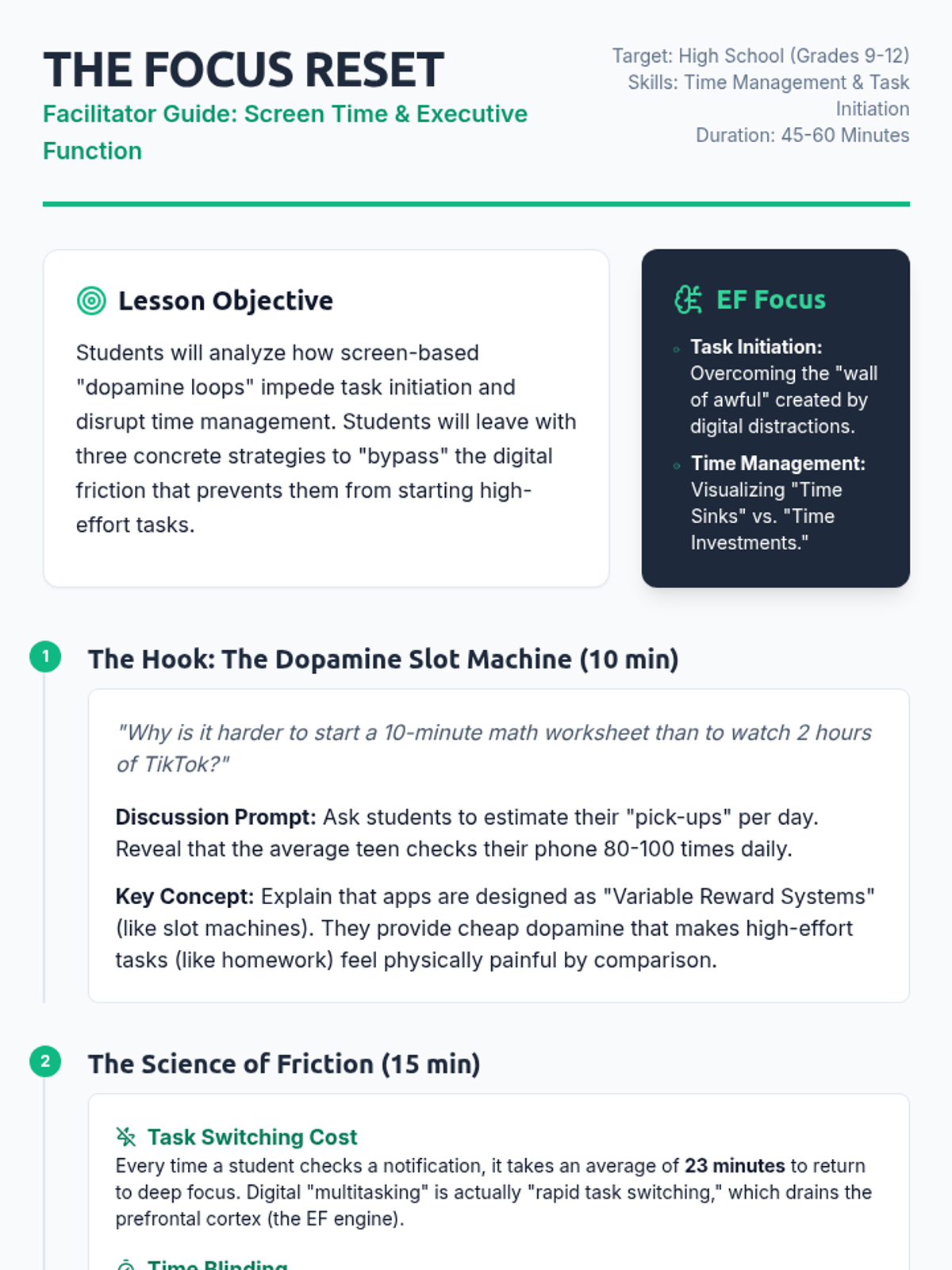 A targeted lesson for high schoolers in executive function groups, focusing on the impact of screen time on time management and strategies for overcoming task initiation hurdles.