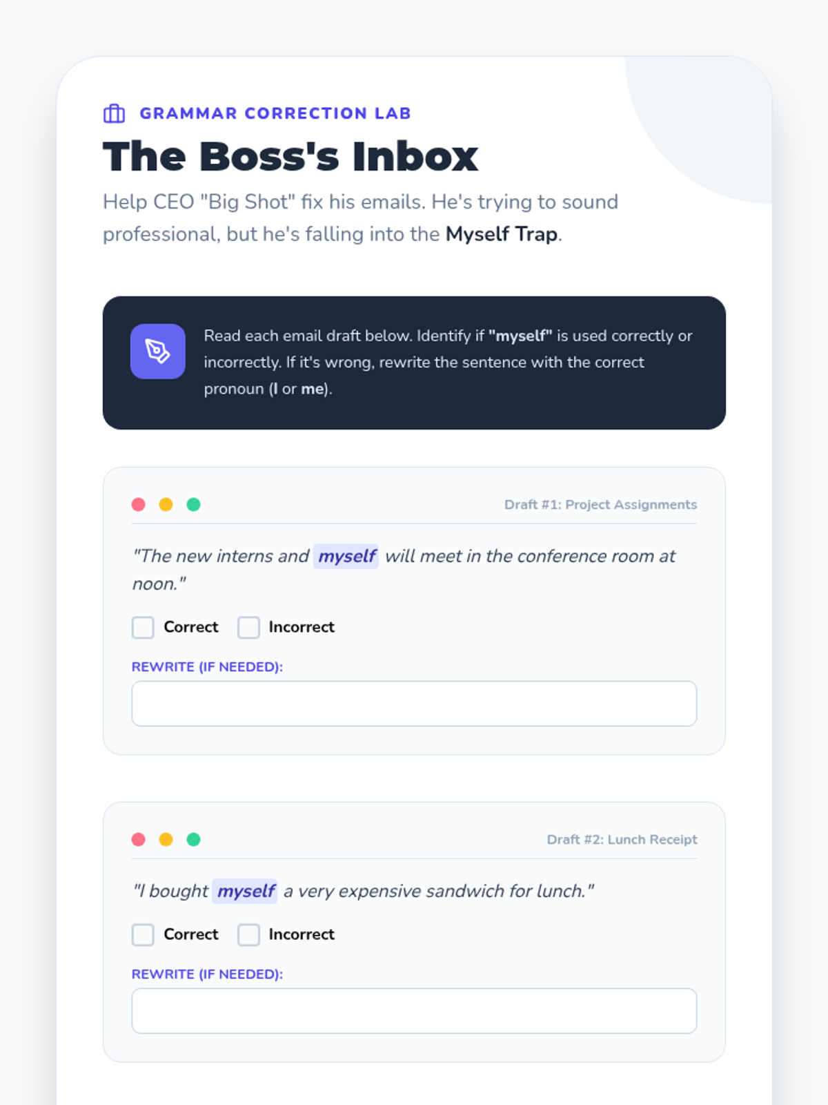Targets the common error of using 'myself' as a subject or object pronoun. Students learn to use 'I' or 'me' correctly in compound structures.