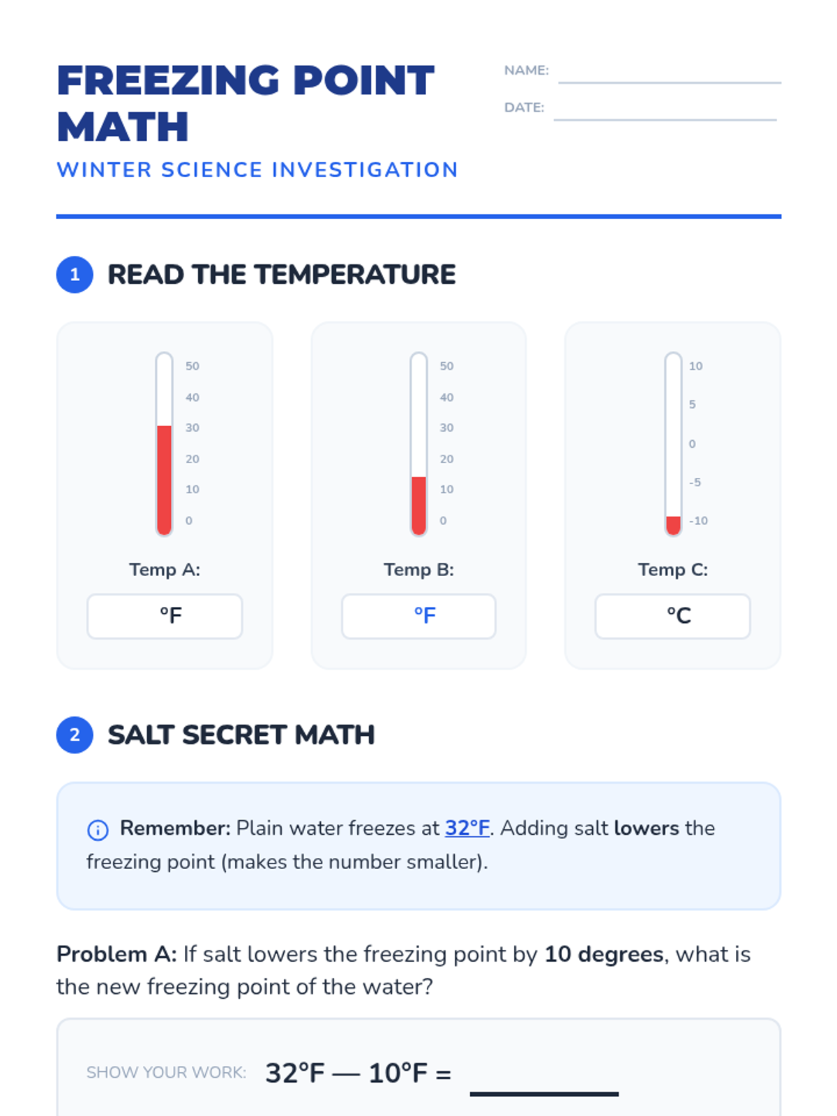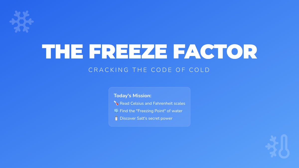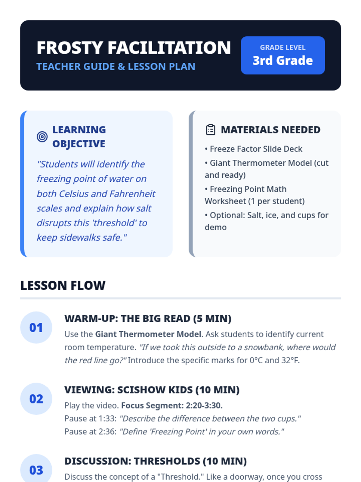 A lesson exploring freezing points, states of matter, and how salt lowers the freezing point of water, featuring a SciShow Kids video and thermometer reading practice.