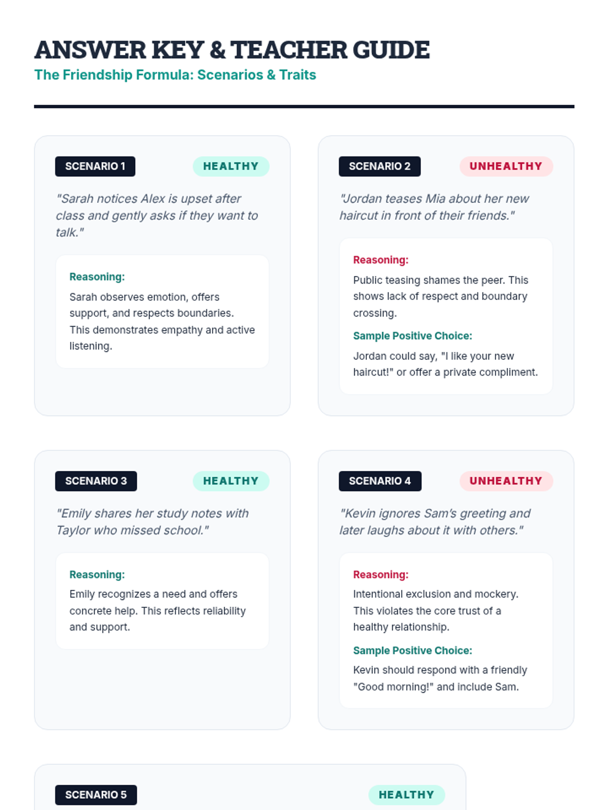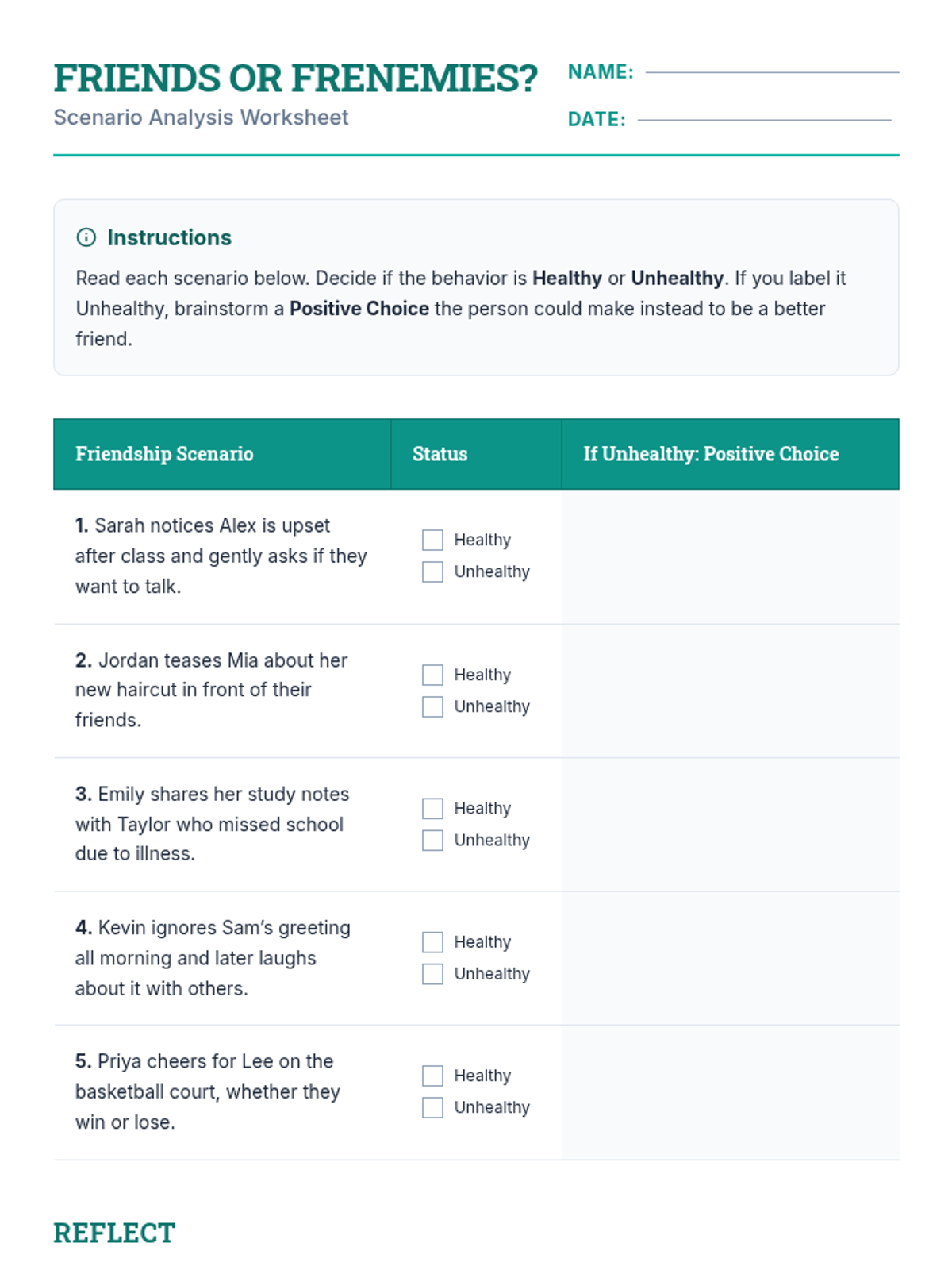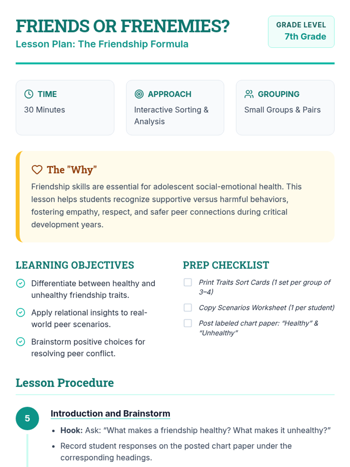 A 30-minute SEL lesson for 7th graders focusing on identifying healthy vs. unhealthy friendship traits and practicing positive relationship skills.