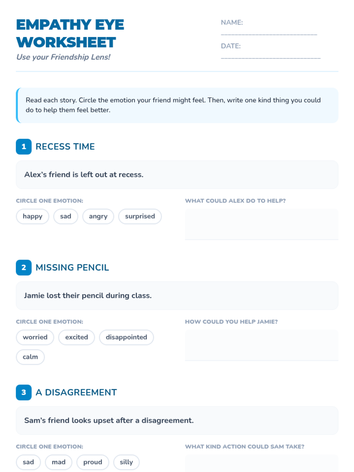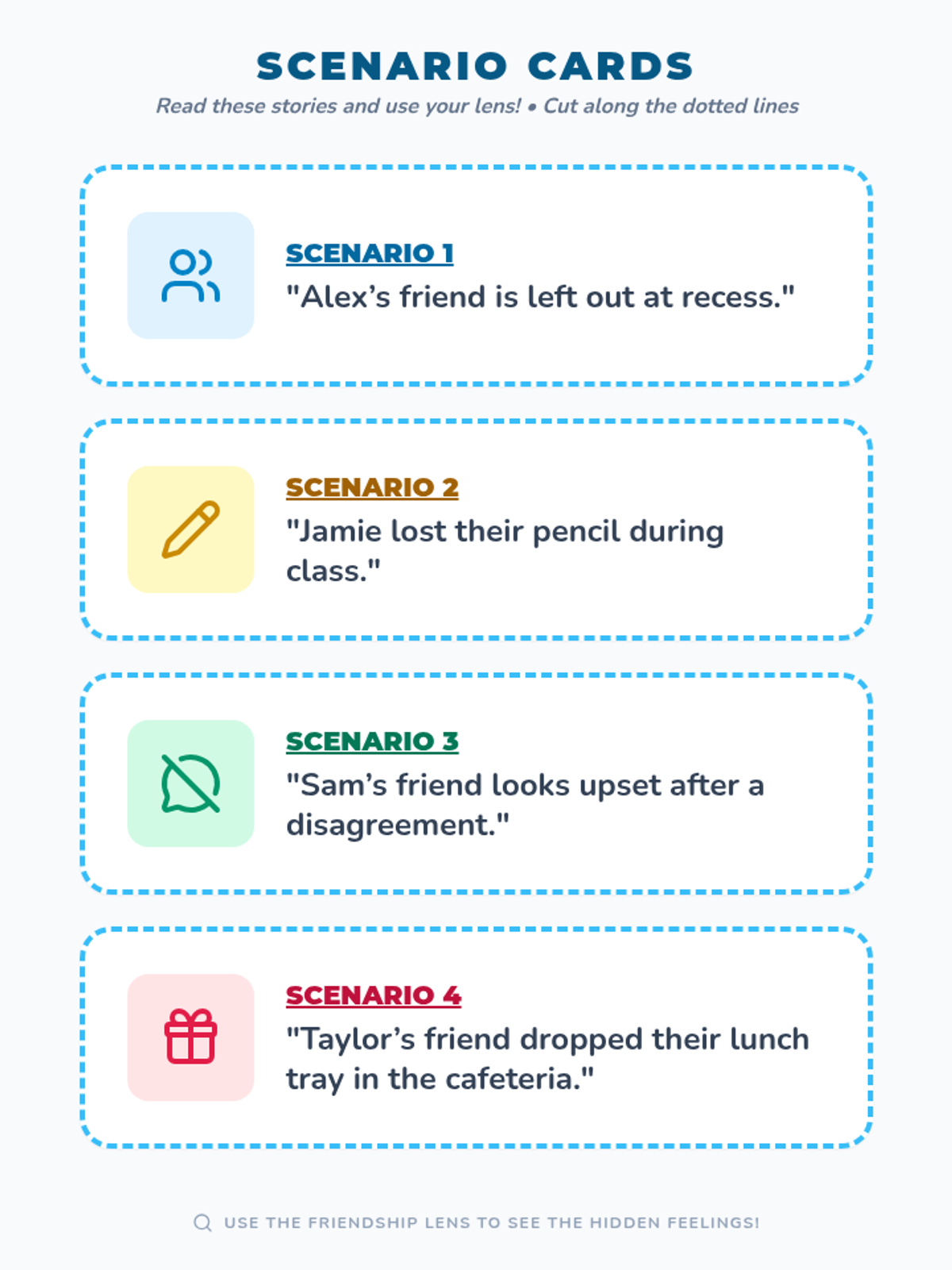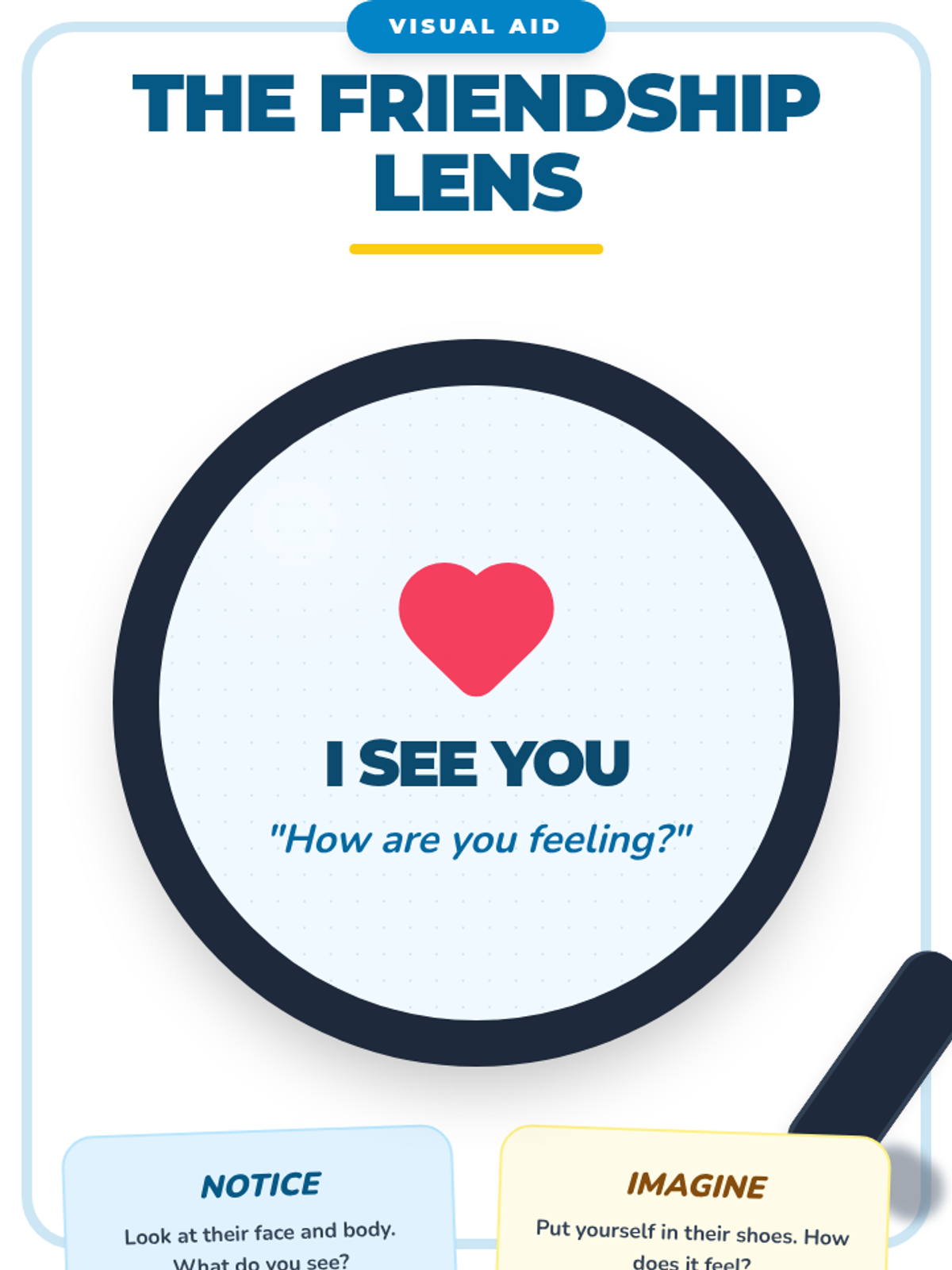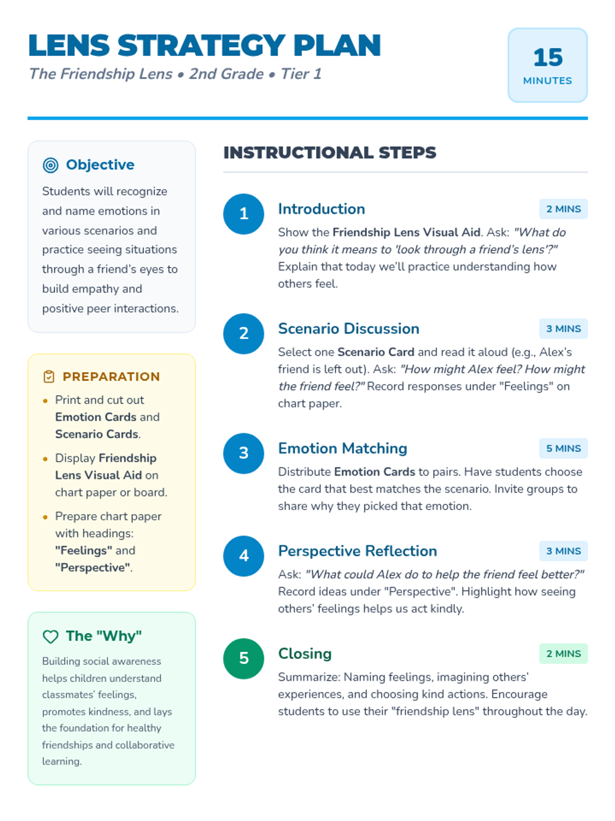 A 15-minute Tier 1 lesson for 2nd graders to build social awareness by recognizing emotions and taking perspectives through the 'Friendship Lens' metaphor.