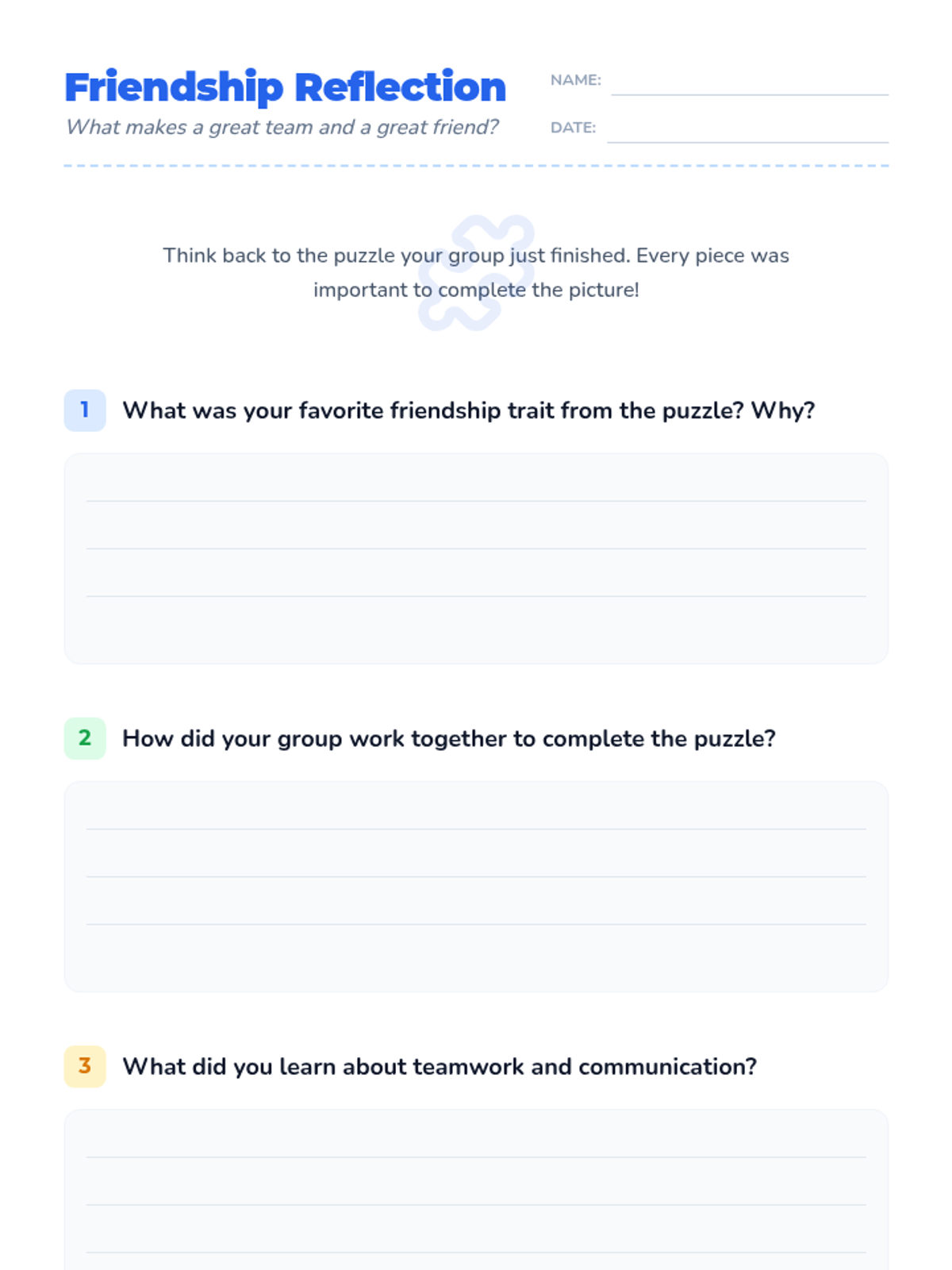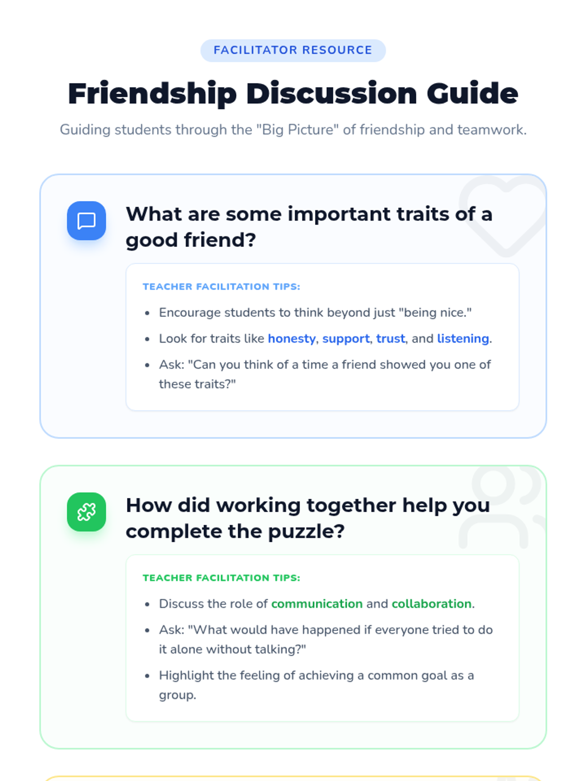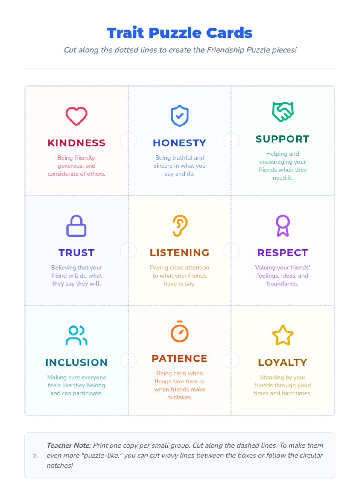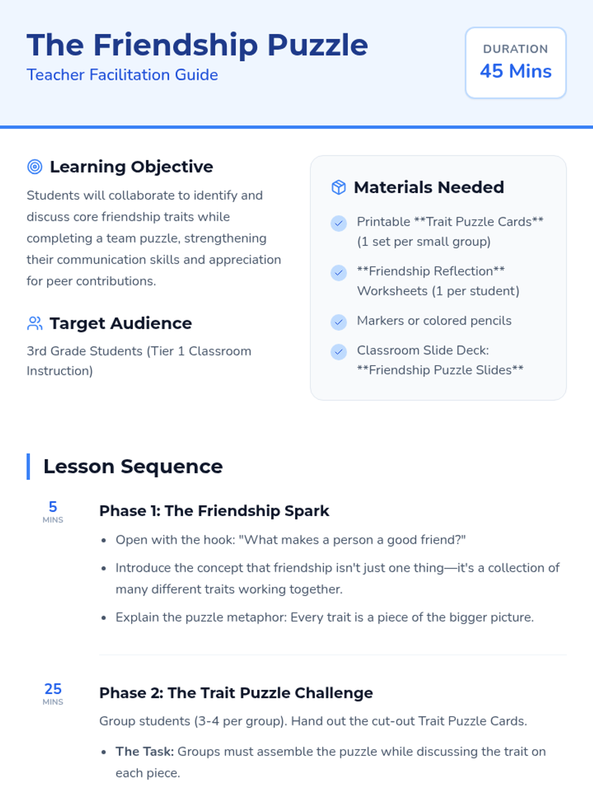 A collaborative 45-minute lesson where 3rd-grade students work together to assemble a friendship trait puzzle, exploring how teamwork and diverse qualities build strong relationships.