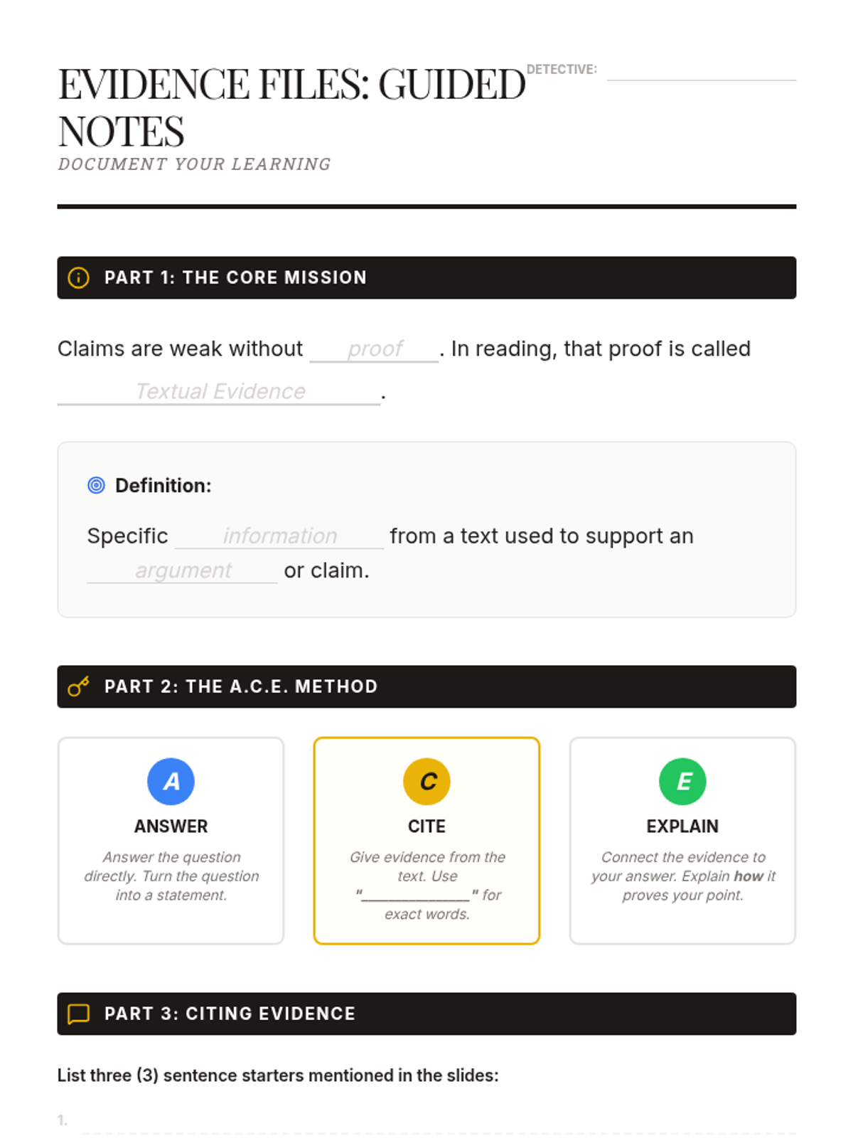A 40-minute lesson on identifying and citing textual evidence using the 'ACE' (Answer, Cite, Explain) method, themed around a detective's case file.