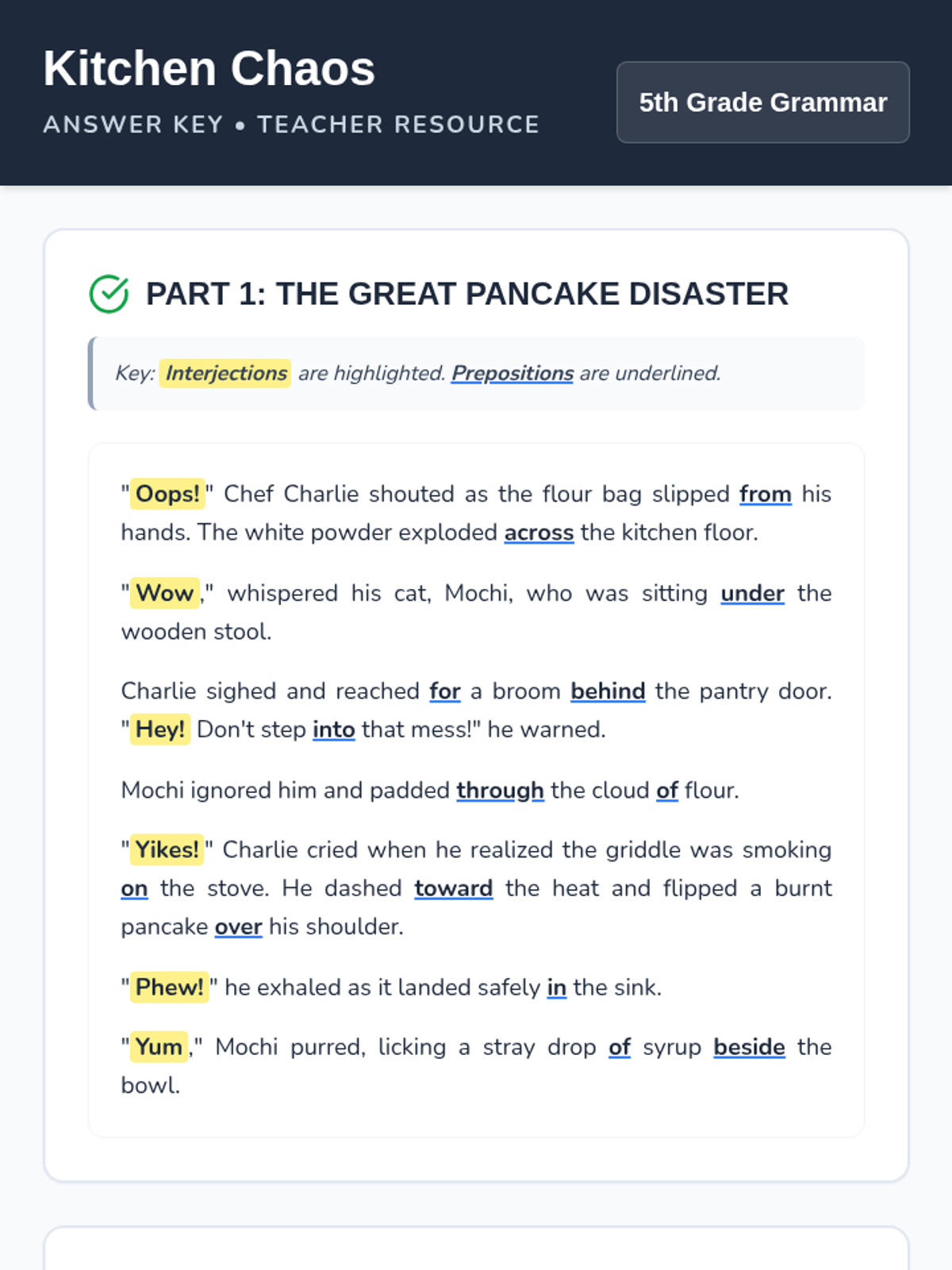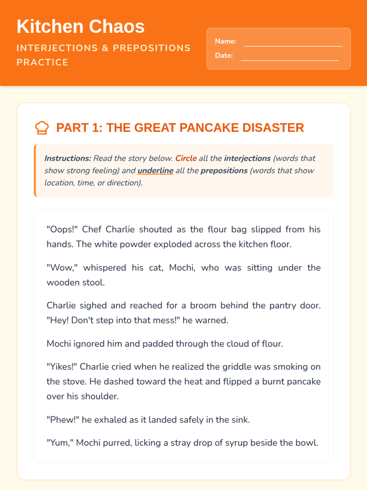 A fun, kitchen-themed grammar lesson focused on identifying and using interjections and prepositions through a culinary disaster story.