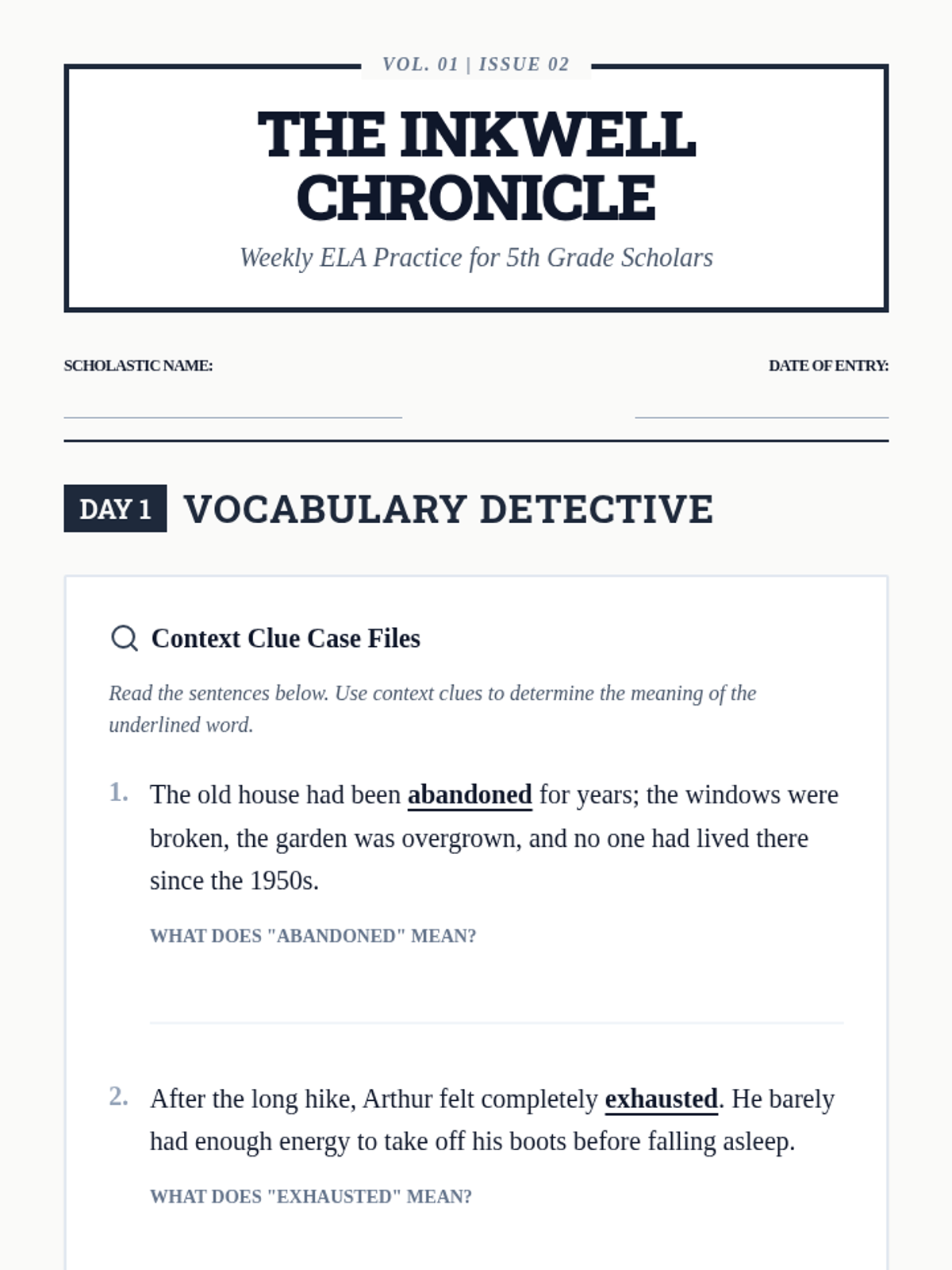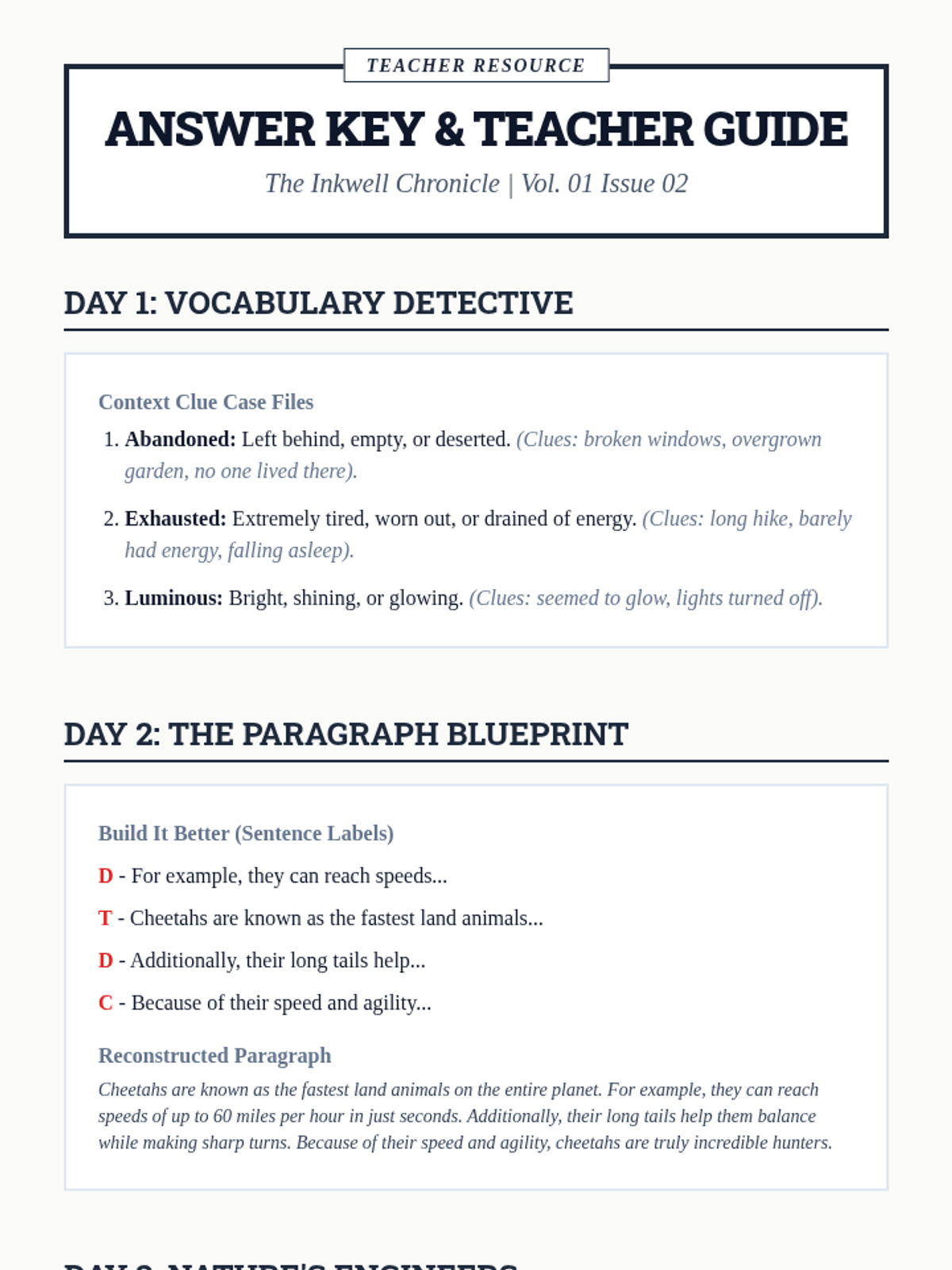 Focuses on building vocabulary through context clues, understanding the structure of a solid paragraph (topic sentence, supporting details, concluding sentence), and continuing practice with main idea and evidence.