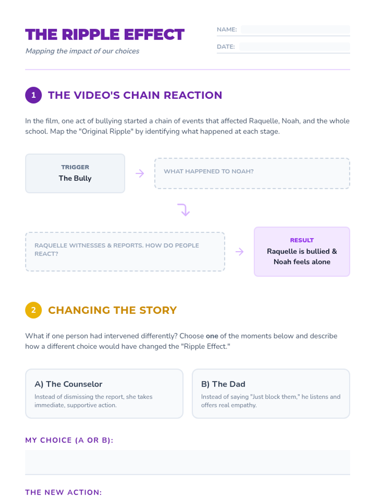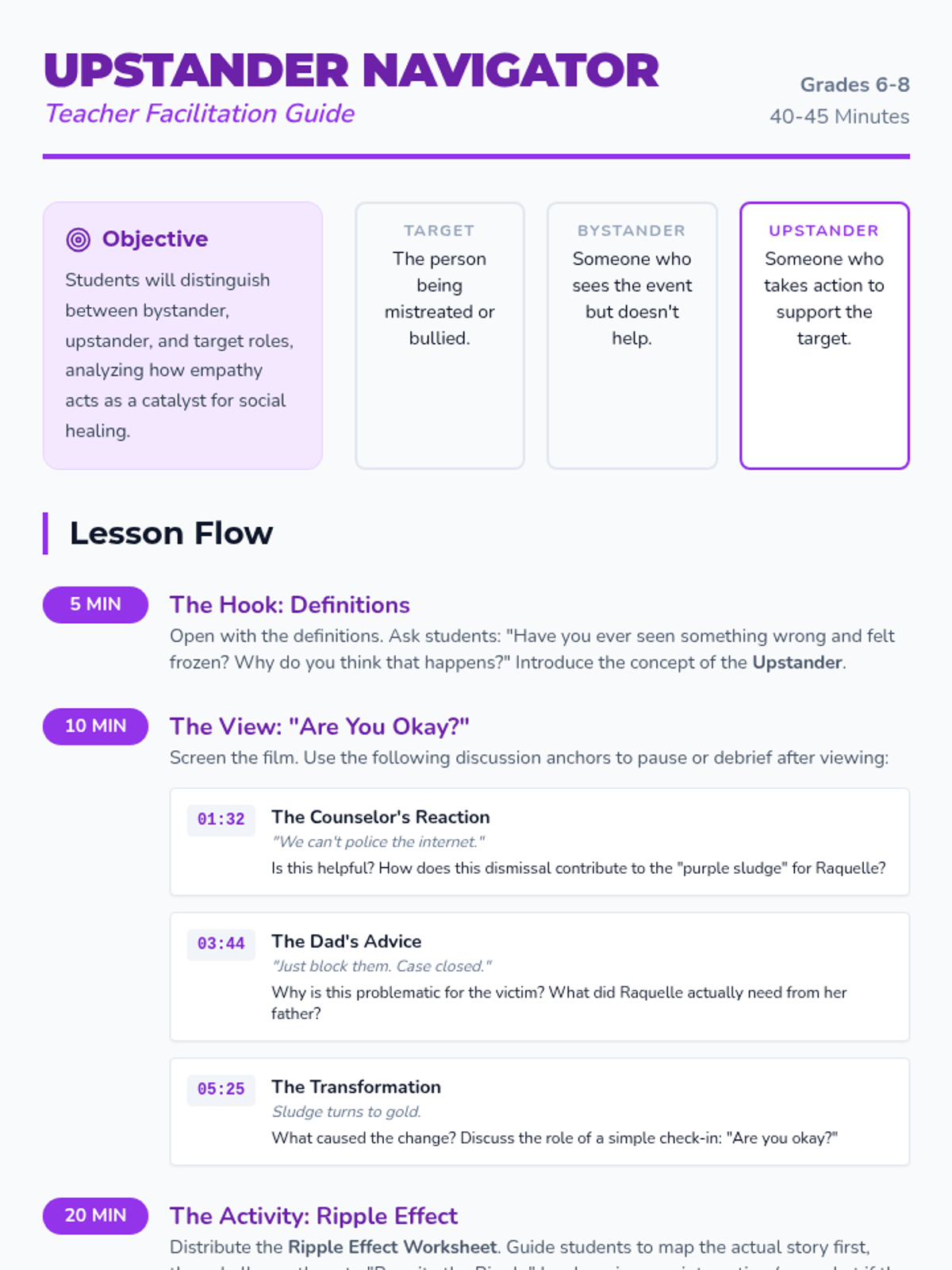 A powerful lesson for middle schoolers exploring the roles of upstanders, bystanders, and targets through the lens of a visual metaphor-heavy short film. Students will analyze social dynamics, the impact of adult dismissiveness, and the restorative power of empathy.